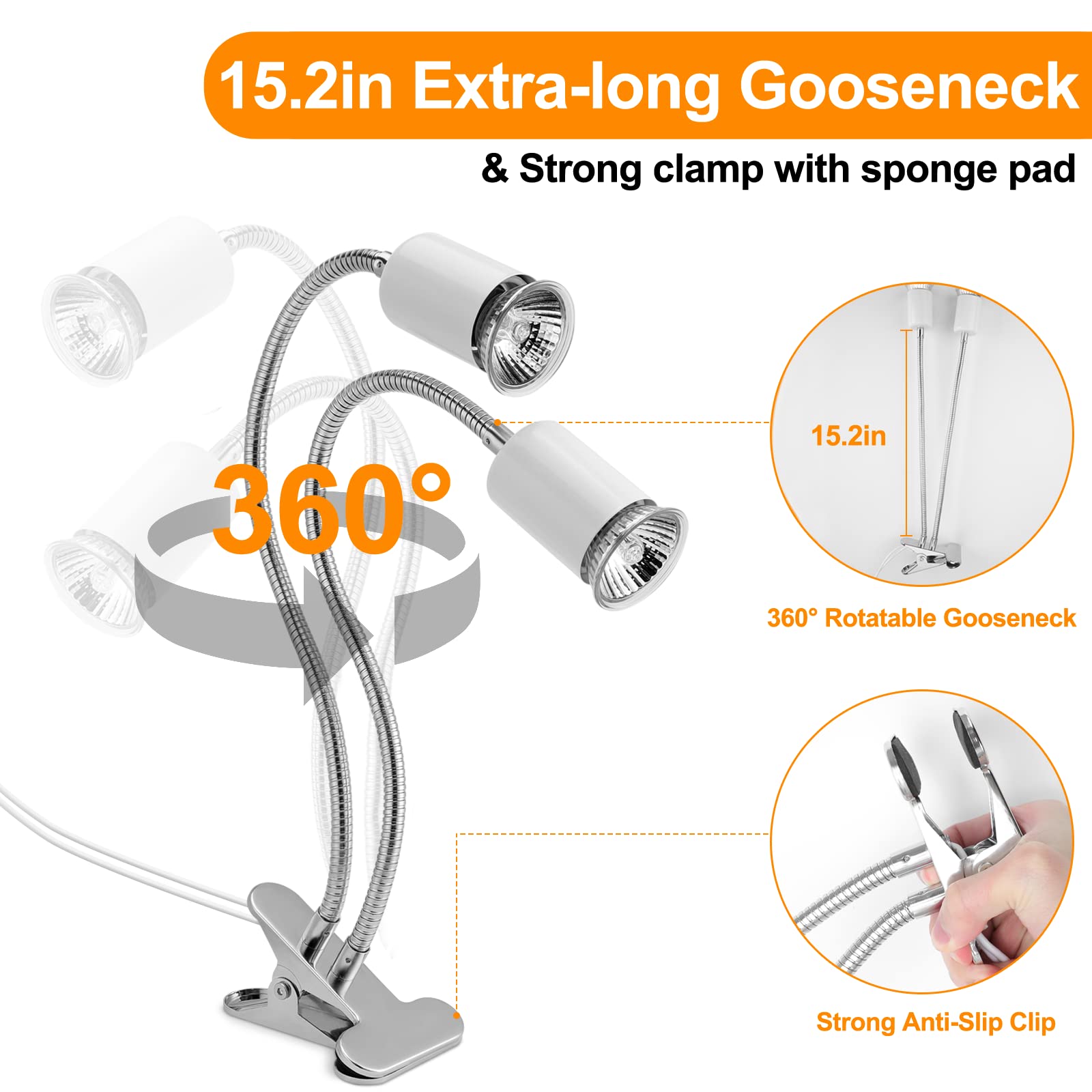 【Longer Goose Neck Design】The 15.2-inch-long goosenecks can be rotated 360 degrees, allowing you to control the distance and angle of the light flexibly for your reptile's comfort. The strong clamp with sponge pad can install the lamps in any position, perfect for aquatic turtle tank, terrarium, enclosure, aquarium, and other small habitats.