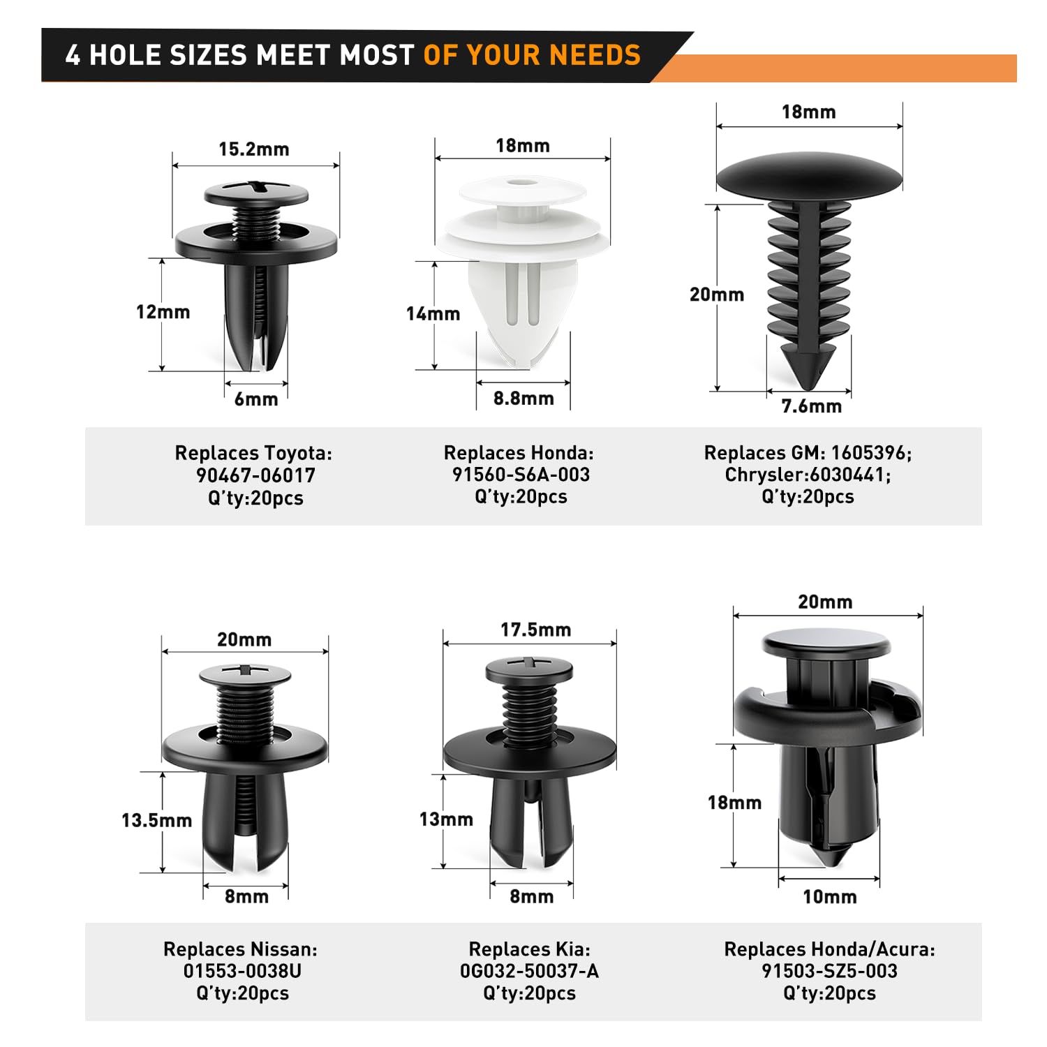 【Widely Application】 - these Push clips are widely used for trim panel clips, door trim clips, door Panel clips, bumper clips, fender clips, engine cover and splash shield retainers replacement. It always covers some applications include telecom equipment, motor vehicles, domestic appliances, furniture and electrical equipment
