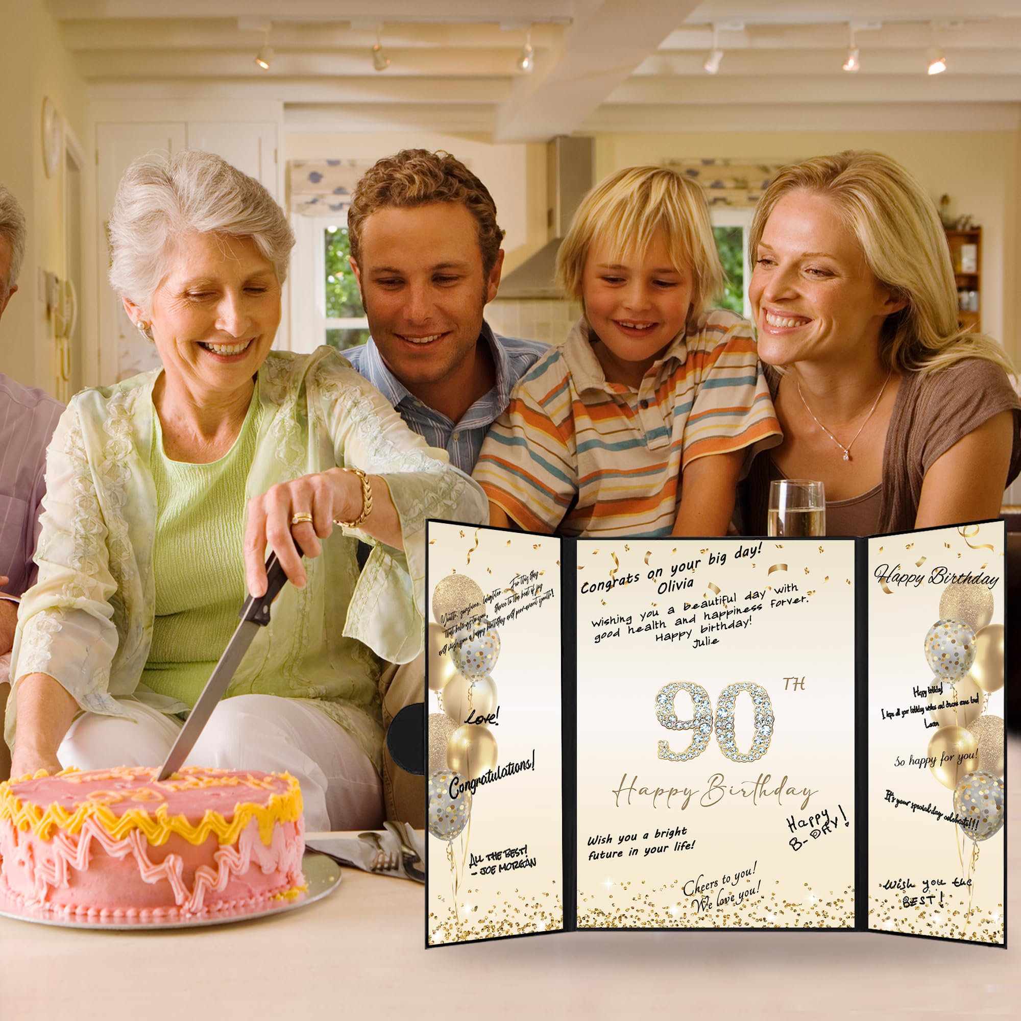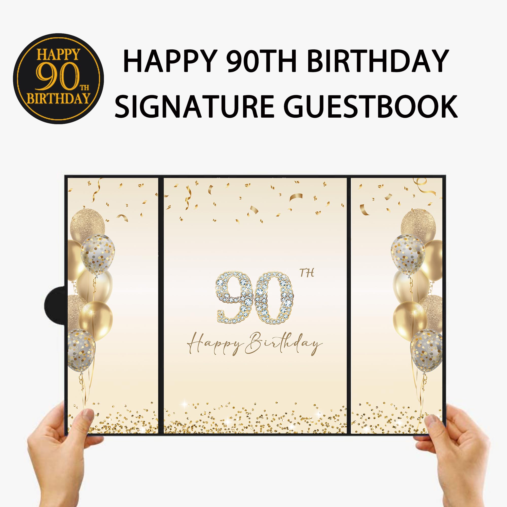 【Perfect Size】 - The cover of Happy 90th Birthday signature sign is approx. 45.6 x 30.6 cm/ 18 x 12inches; the left and right inner page is approx. 10.5 x 30cm/ 4.1 x 11.8inches; the middle inner page: approx. 21.5 x 30 cm/ 8.5 x 11.8inches. It is a fun party decoration idea for the 90th Birthday. You can make your keepsake unique and keep them endlessly.