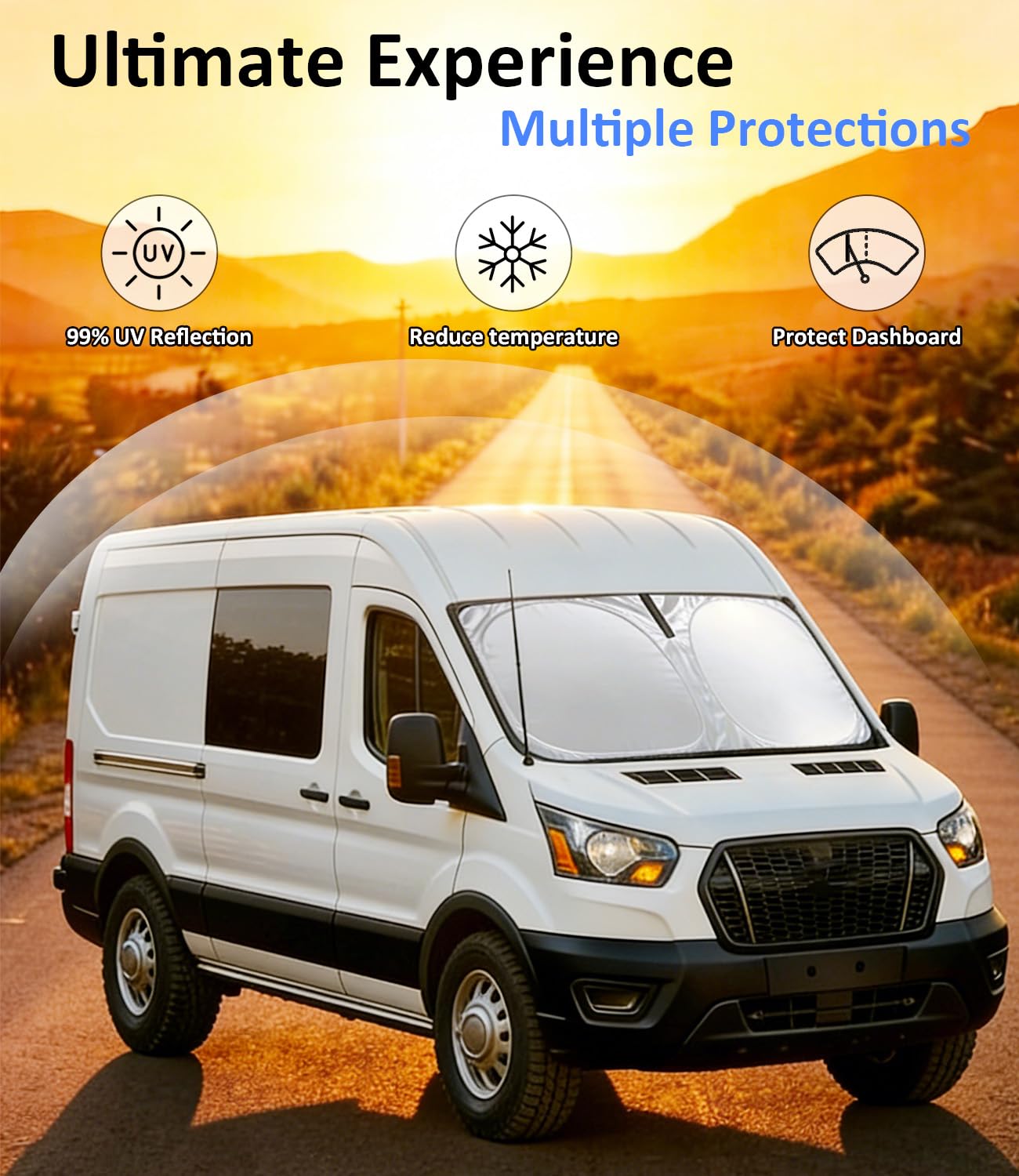 [Custom Precision Fit for Your Ford Transit] Engineered specifically for the Ford Transit (2021‑2026 models), this sun shade installs effortlessly. It hugs your windshield perfectly with no suction cups needed, and resists sagging or collapsing—making it ideal for both daily use and outdoor camping.