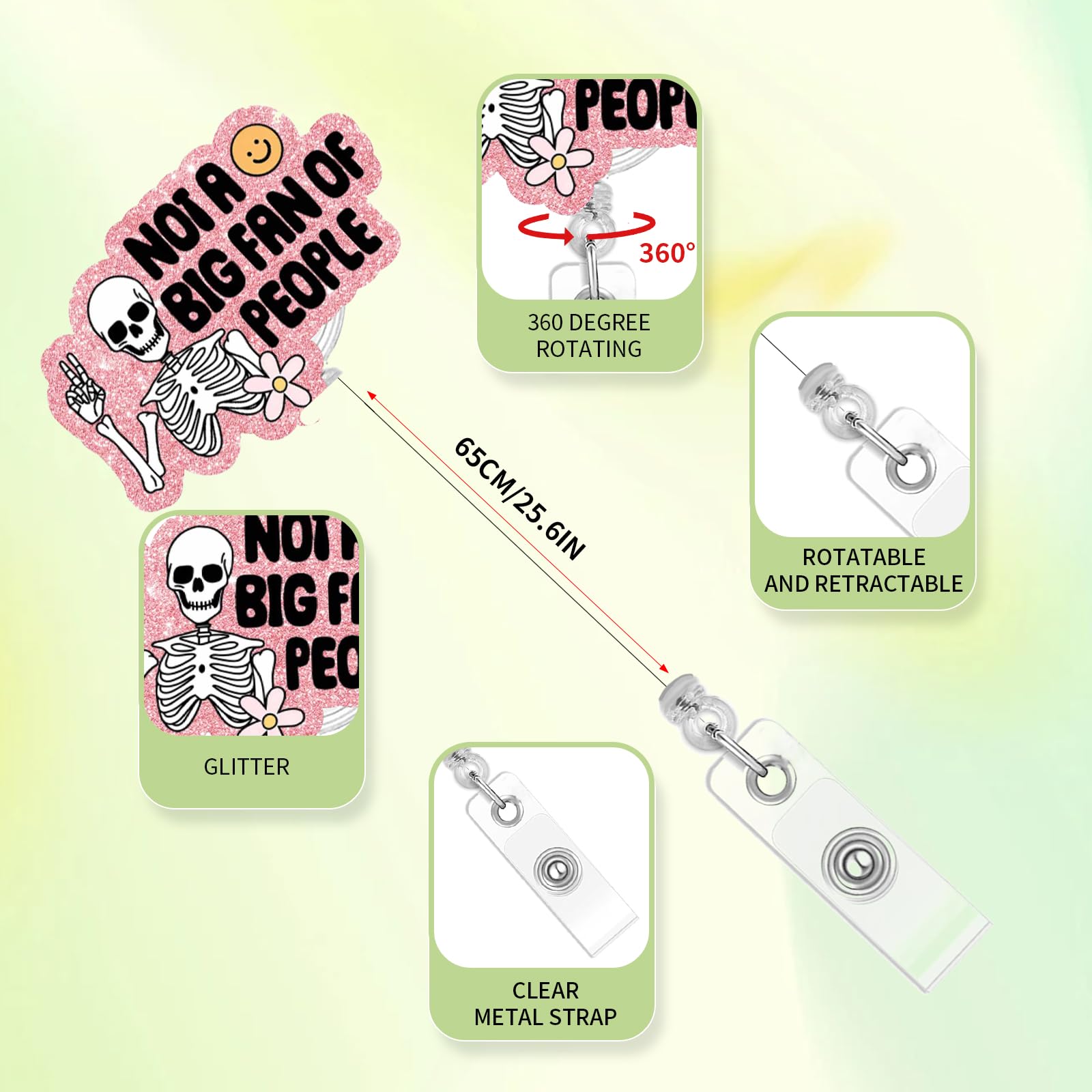 【Material】The skeleton retractable badge reel is made of high-quality acrylic, and the rope is mainly made of high-quality nylon material, which is strong and durable. They are lightweight and feature serrated alligator clips that will never drop your ID.