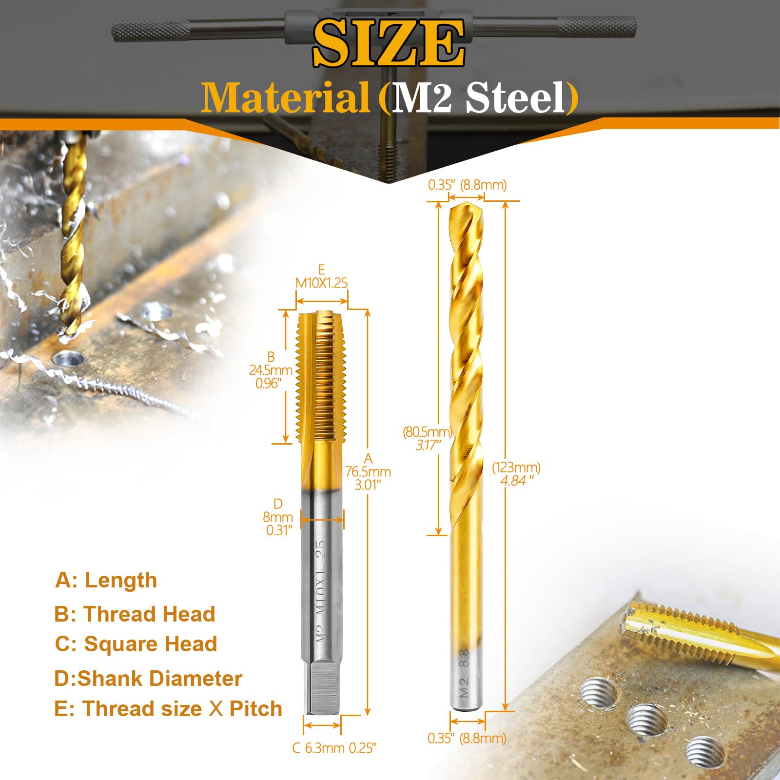 【Size】Include M10x1.25 M2 steel tap and 8.8mm M2 HSS drill bit with round shank,all stored in a storage box for easy carrying.