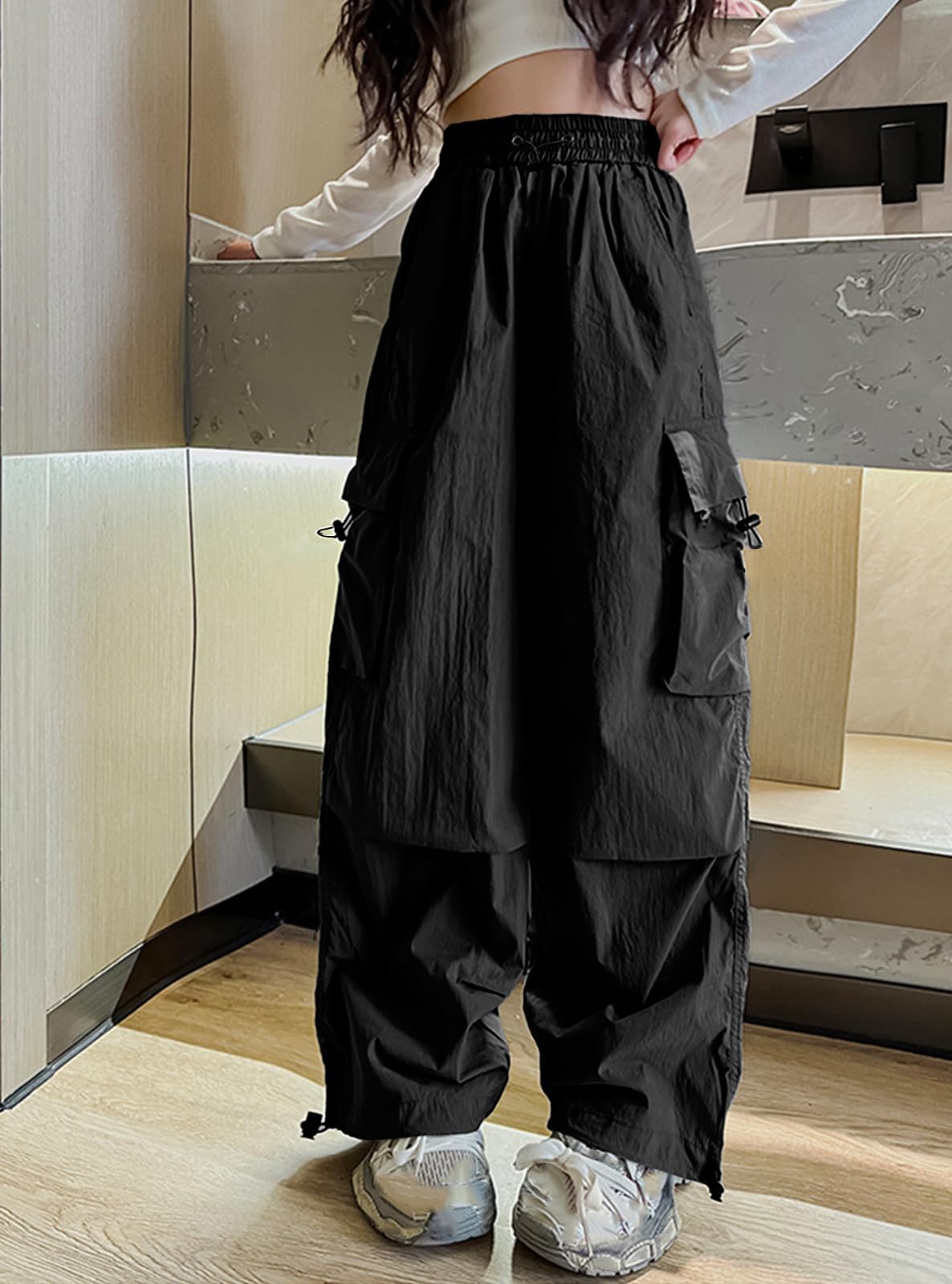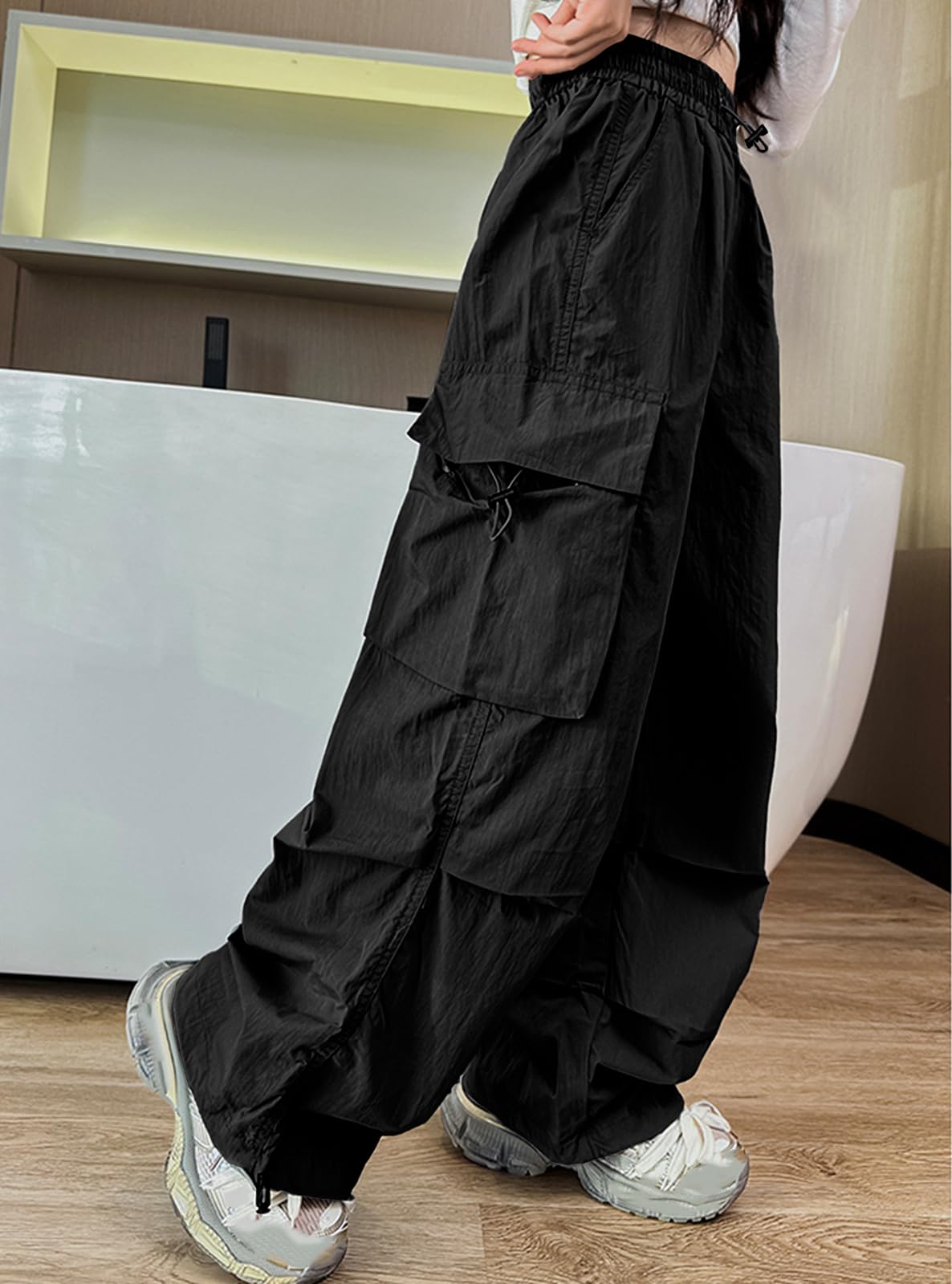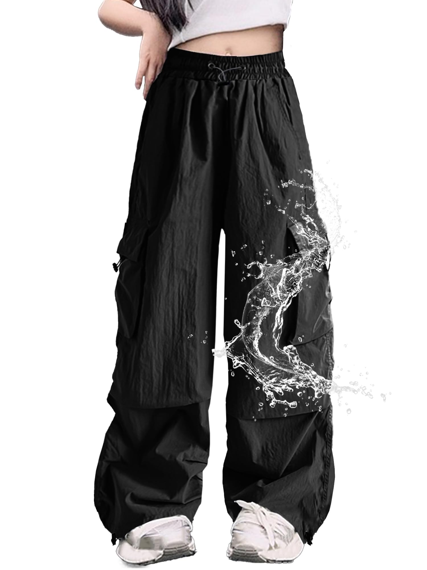 Y2K Street Style | Trendy & Functional:Combines Y2K parachute pants aesthetics with cargo pockets and a high-rise cut, perfect for school, skate parks, or urban adventures.