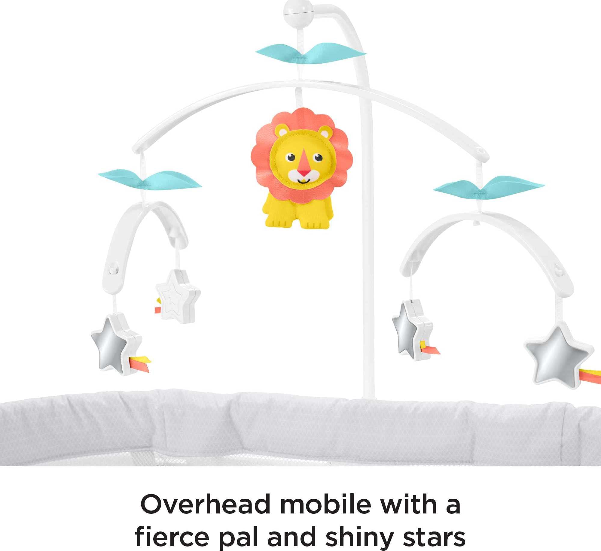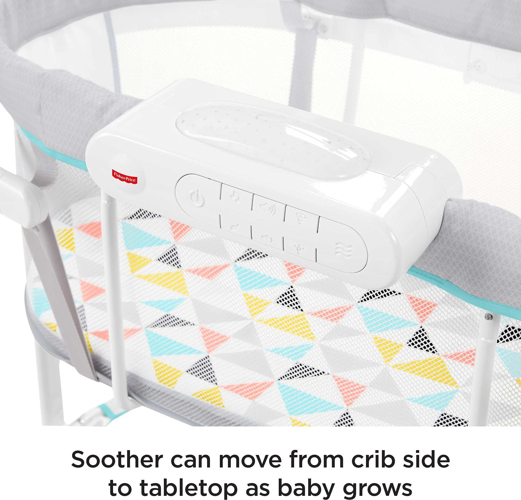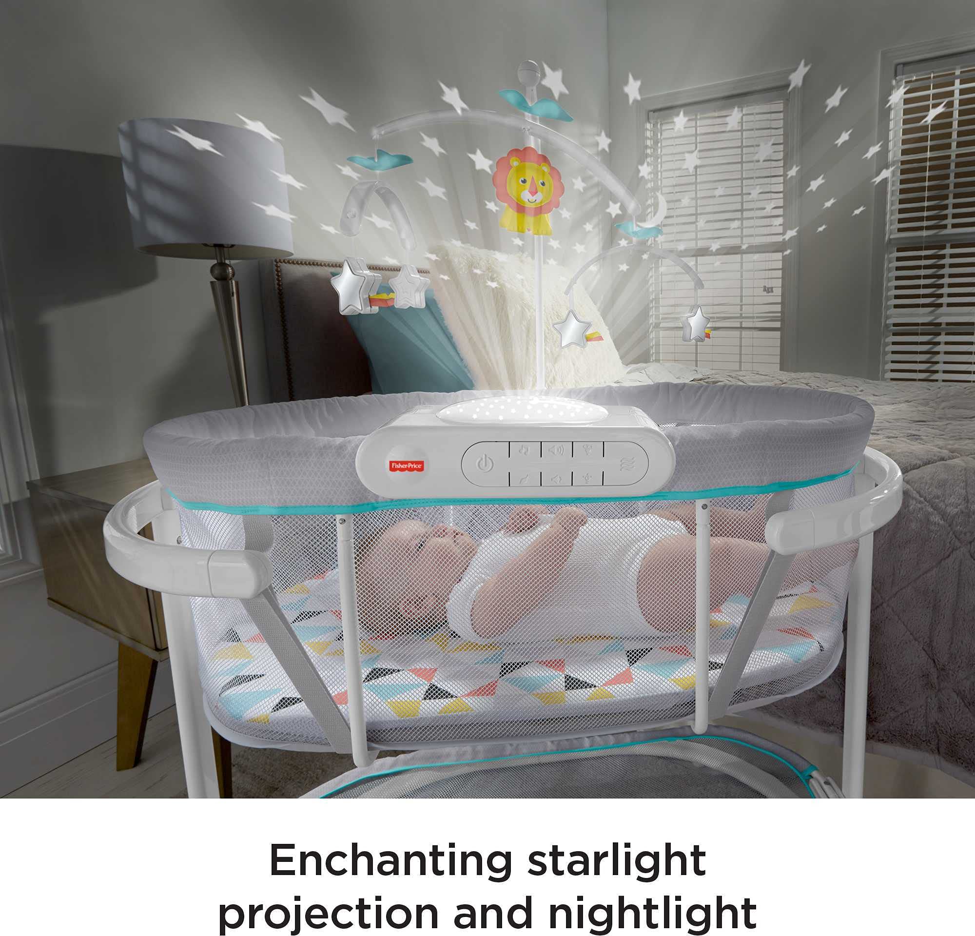 From soothing sways, music and sounds to calming vibrations, light projection and more, the Soothing Motions Bassinet has everything to help your baby drift off to dreamland in comfort. As little ones relax on the comfy sleeping pad, they can look up at the mesmerizing overhead mobile with stars while they gently sway. Or, turn on one of the captivating light features, like the overhead projection. You can also remove the projector from the bassinet and use it as a tabletop soother! And, there's a convenient night light setting for an added sense of security. For extra coziness, activate the 30 minutes of calming vibrations and serene songs or sounds. Sweet dreams, baby! Use only with a child who is unable to push up on hands and knees, pull up or sit unassisted.