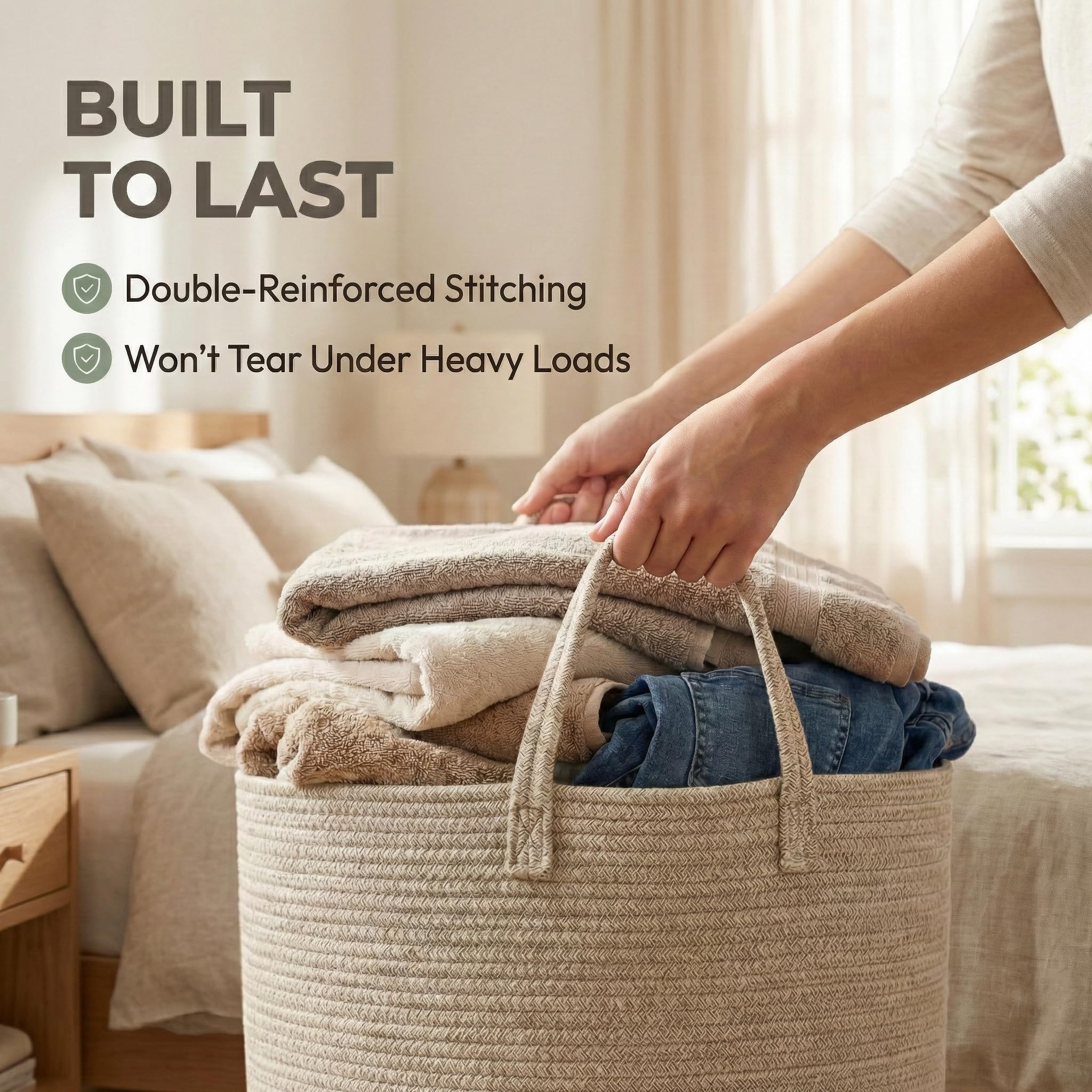 SOFT WOVEN TEXTURE & FLOOR PROTECTION -- Crafted from premium cotton rope, this storage bin offers the aesthetic appeal of a wicker basket without the sharp edges. Its soft texture is gentle on delicate fabrics and safe for toddlers to lean against. The smooth bottom glides easily over hardwood floors and carpets, preventing scratches while you move it around the house.