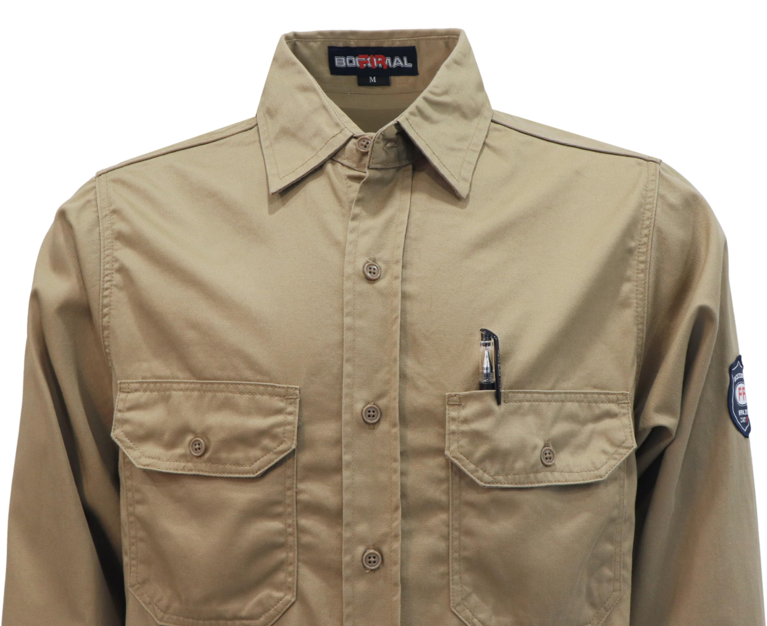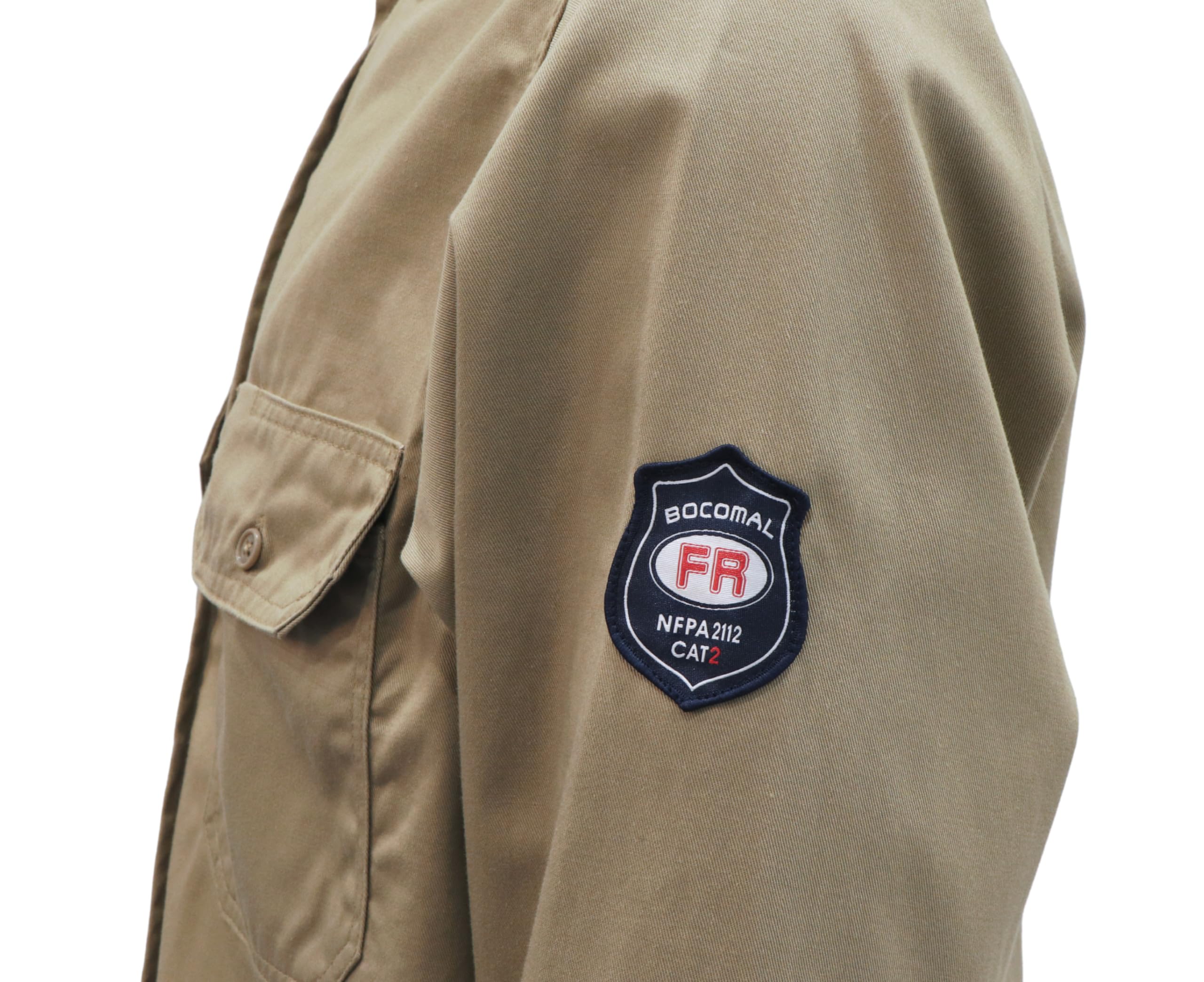 FR MATRIALS:7.5OZ Cotton Twill FR Treated,FR Buttons,FR Sewing Threads!Clear FR Tag on arms and bottom front.More FR info On Neck Tag About UL Certification.We Attached A Small Sample Inside Package For Cunstomers Simple FR Try