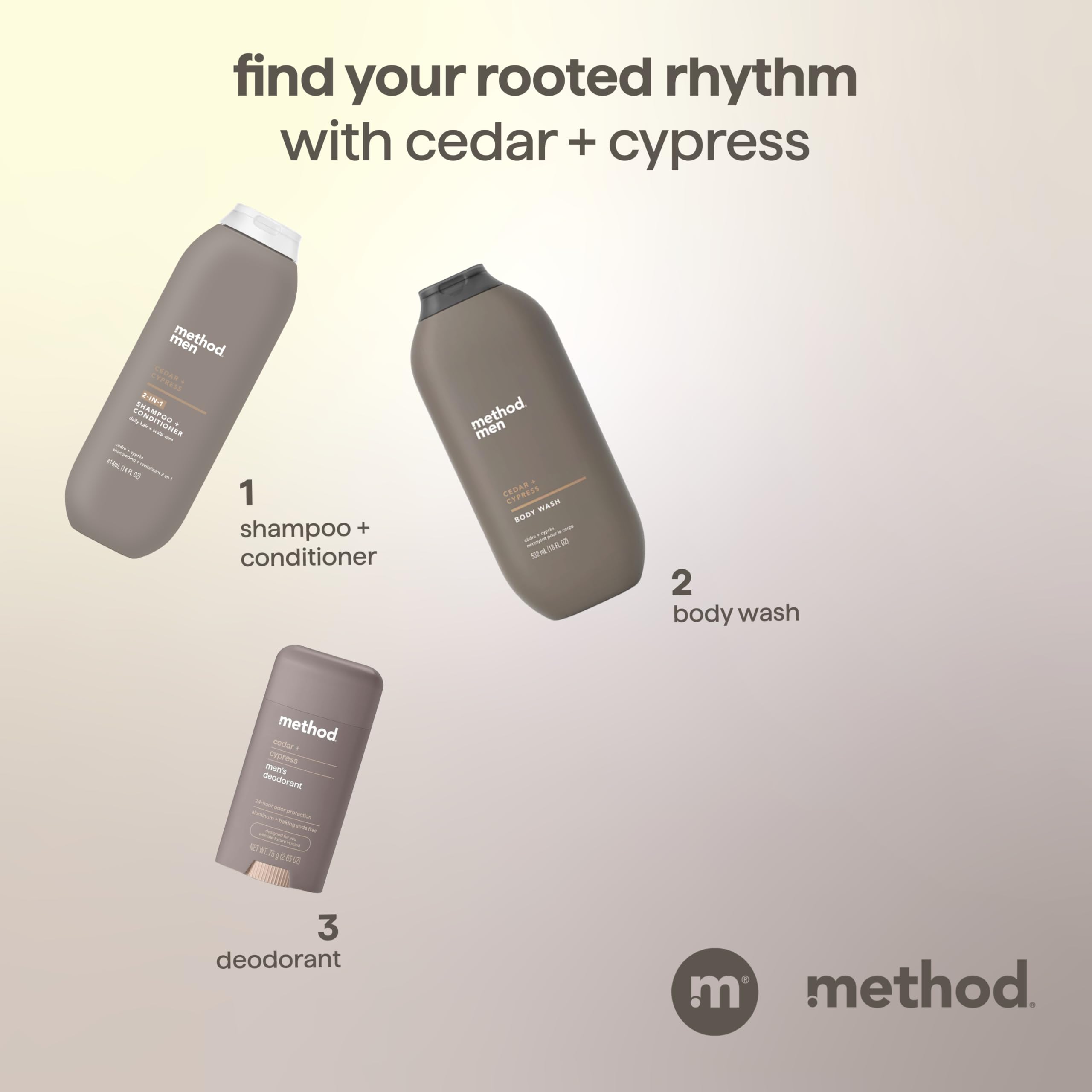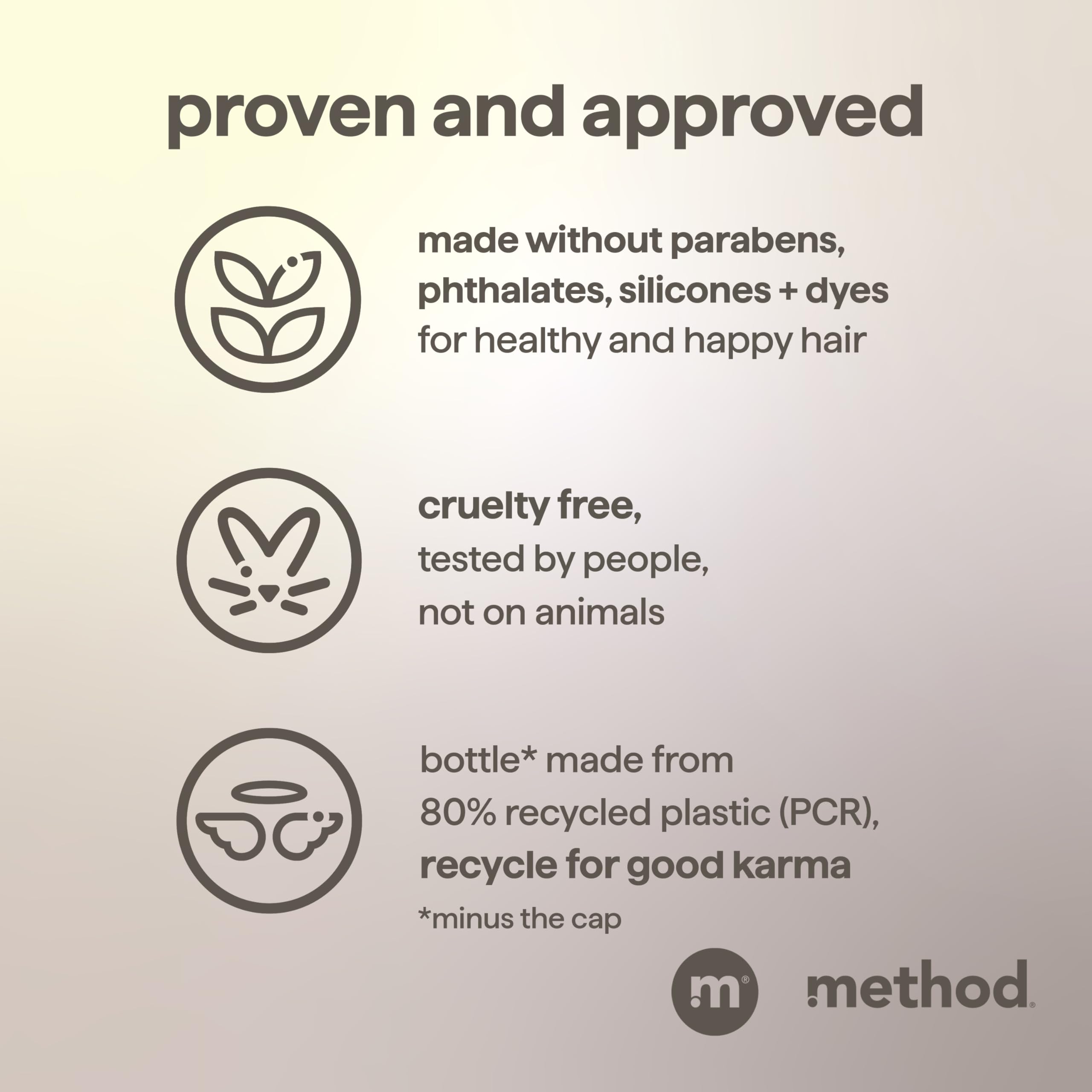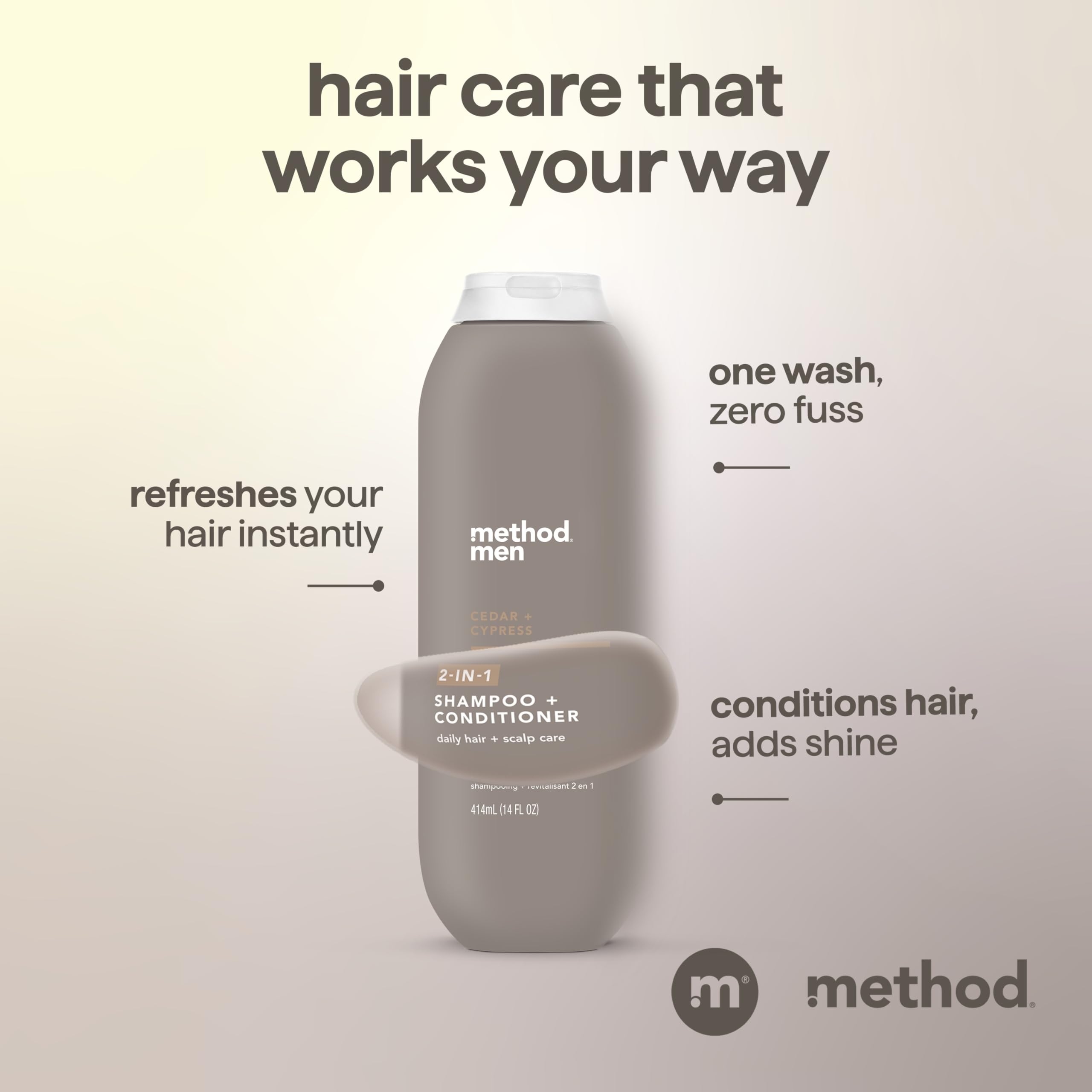 HELPS STRENGTHEN HAIR: This men’s 2-in-1 shampoo and conditioner helps make hair lightweight and manageable, thanks to argan and jojoba oils. SUITABLE FOR ALL HAIR TYPES: Getting great hair shouldn't be complicated. This is ideal for men looking for an effective, all-in-one hair care routine. THOUGHTFULLY MADE: Made without phthalates, dyes, silicones, and parabens, this 2-in-1 helps keep hair lightweight and receptive to moisture without buildup, for manageable hair throughout the day. DESIGNED WITH THE FUTURE IN MIND: Each bottle (minus the cap) is crafted from 80% recycled plastic (PCR), helping you reduce waste with every use. This cruelty-free formula is developed without animal testing. method delivers effective hair care you can count on while helping you make more responsible choices in your everyday routine. TO USE: lather in, rinse well, smell + feel great.