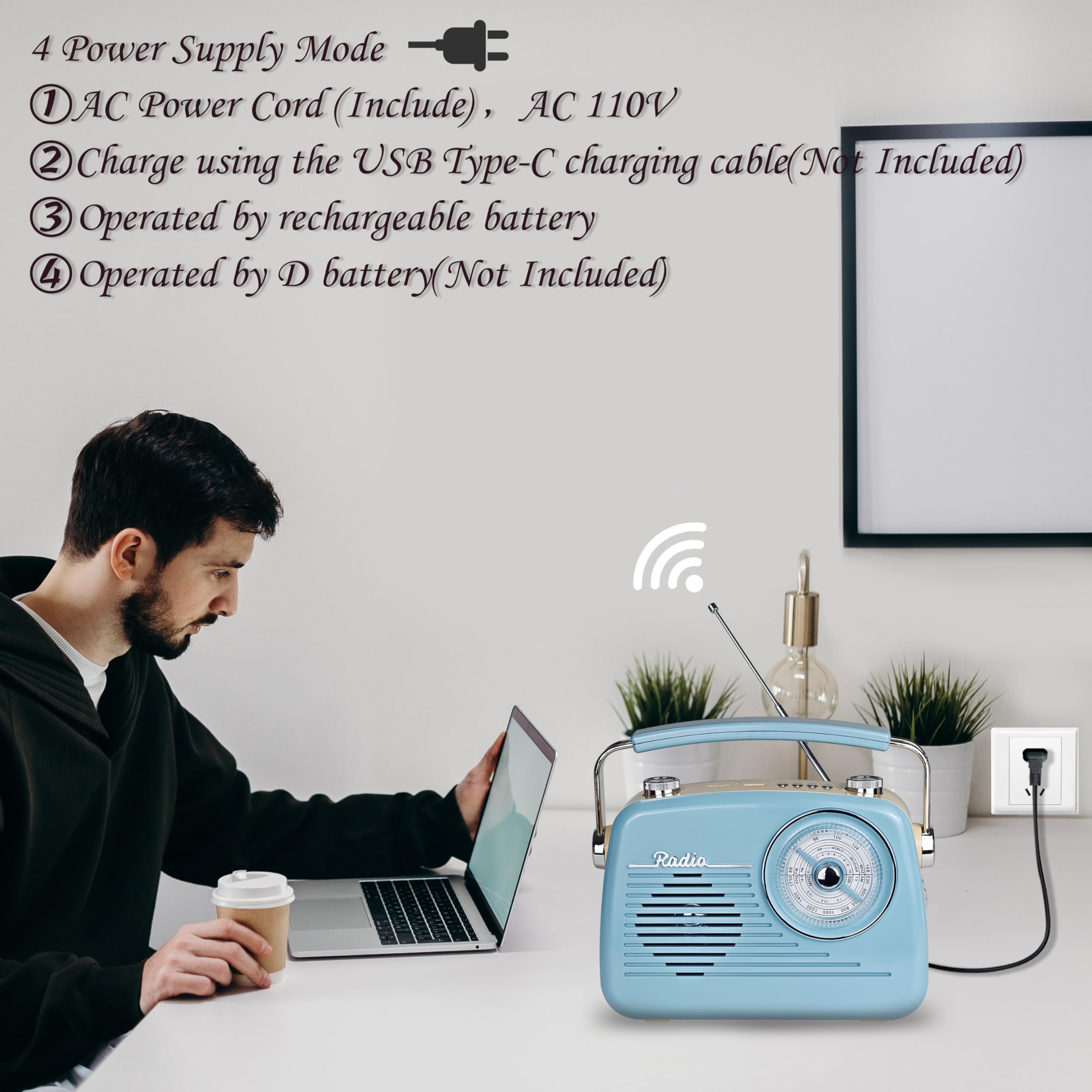 【4 Power Supply Modes, Suitable for Various Scenarios】 ① Operated by AC power cord plug for power (INCLUDED). ② DC 5V, USB Type-C charging cable (NOT INCLUDED). ③ Operated by 2*D batteries. ④ Operated by rechargeable battery. With 4 power supply modes, this portable radio is easy to use at home and outdoors.