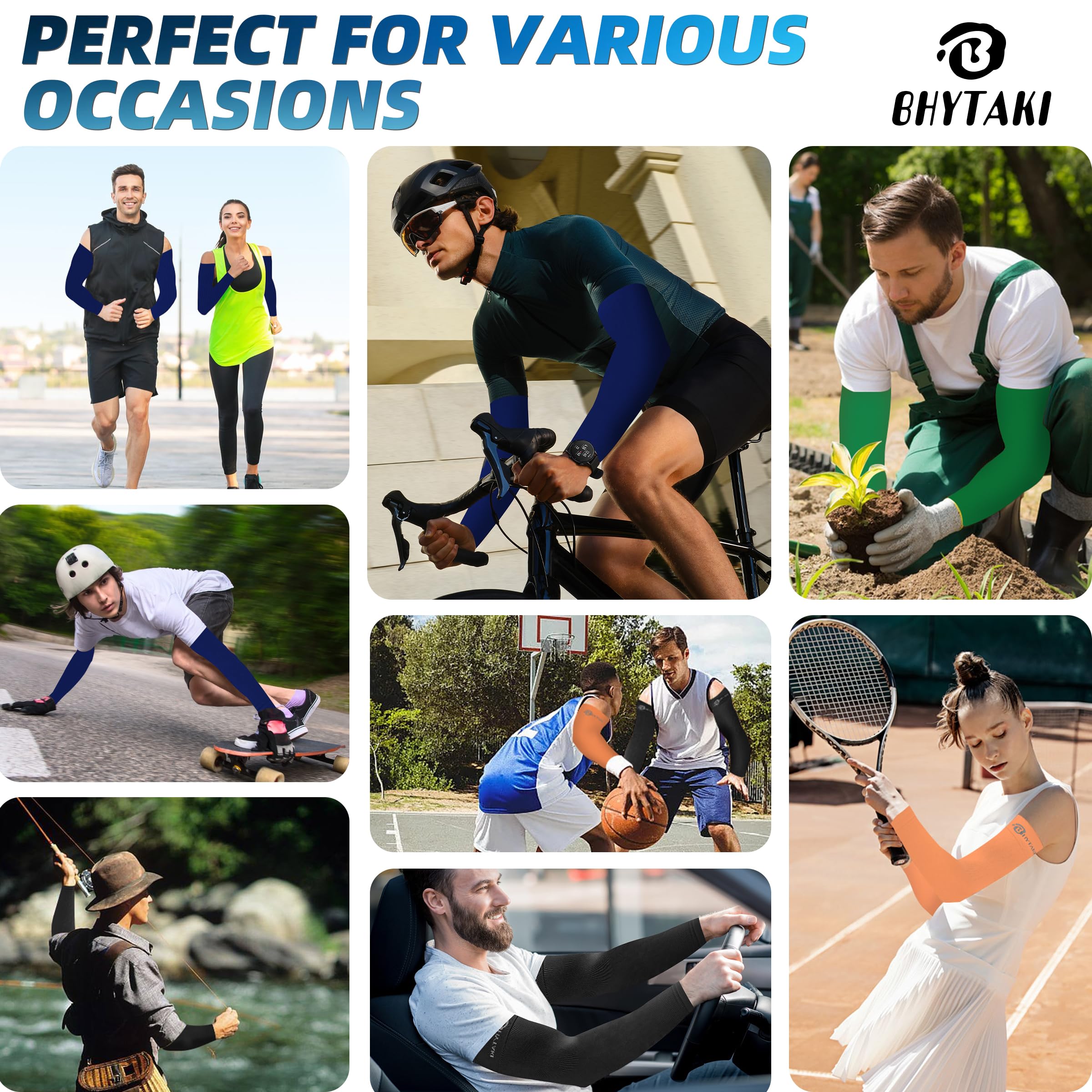 【Arm Sleeves UPF50+ Protection Design】Our arm sleeves set contains - 1 pairs of 1 Black+1 pairs of Green+1 pairs of Navy Blue+1 pairs of Orange. Our UPF 50+ sun sleeves for men women are made of high-quality soft fabric with added anti-ultraviolet ingredients , can really block up to 98% of harmful UVA and UVB rays, can block harmful sunlight when playing golf, shooting, running, cycling, gardening, working, etc., and prevent skin from sunburn and aging.