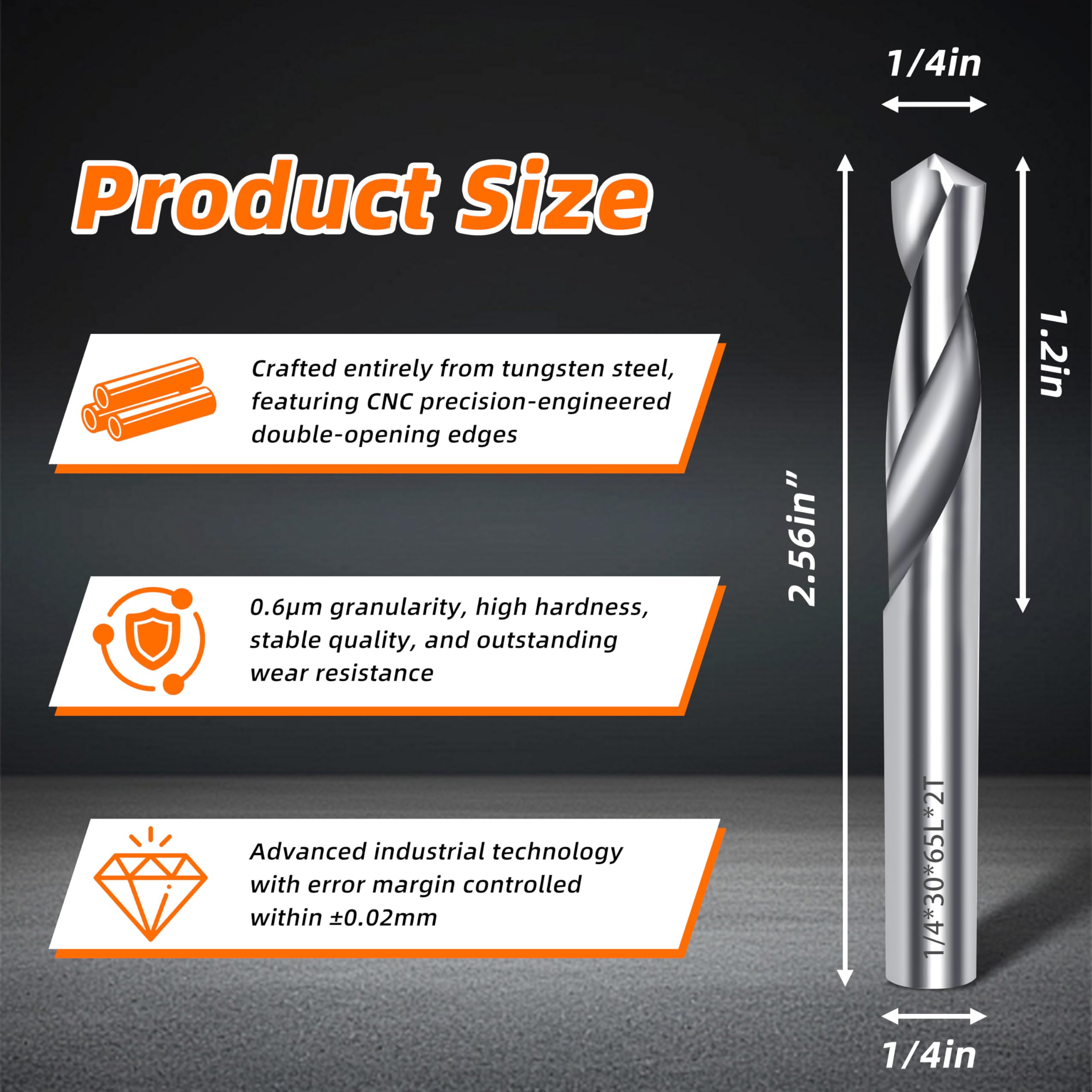 SIZE:0.25" Drill Diameter; 1.2" Flute Length; 2.56" Overall Length. These exact dimensions make carbide drill bits perfect for precision drilling, guaranteeing accuracy and boosting efficiency