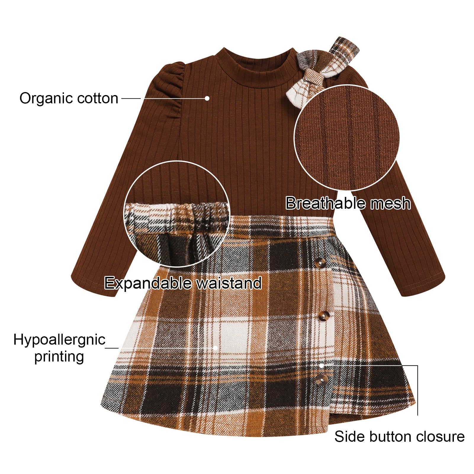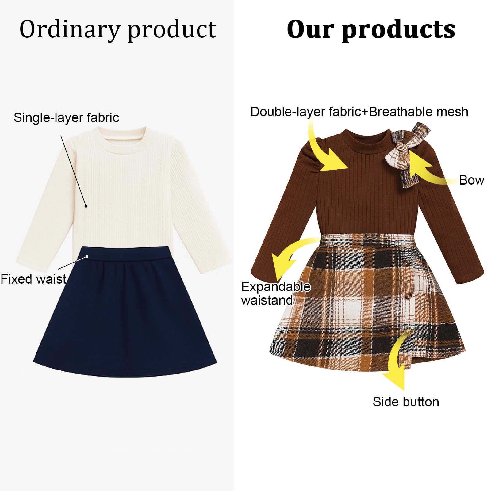 MATERIAL: Toddler girl shirt sweater top is made of cotton and polyester, bottom skirt is made of cotton blend and polyester, soft, breathble, and comfortable, sweet toddler baby girl 2 piece skirt set, cute baby girl clothes.