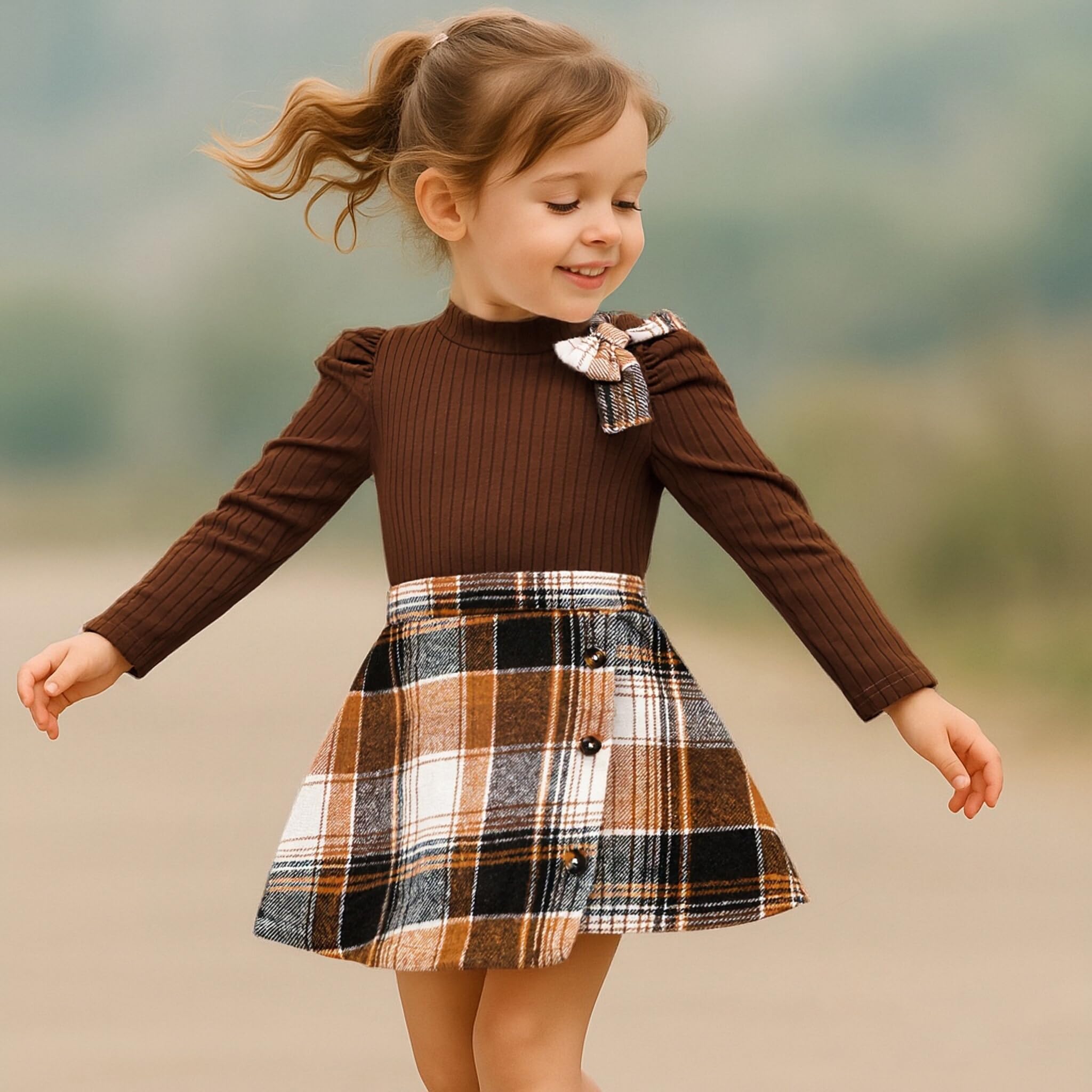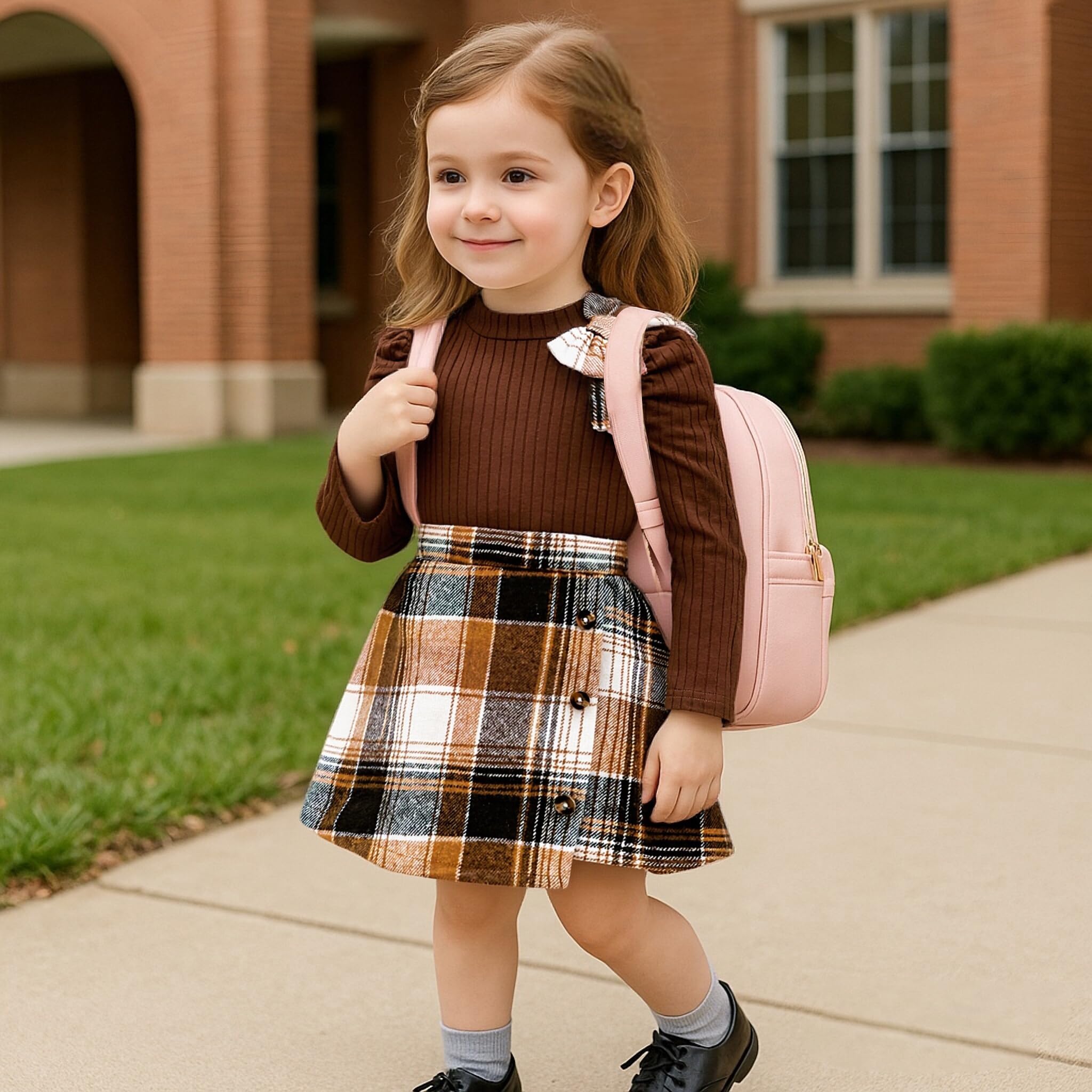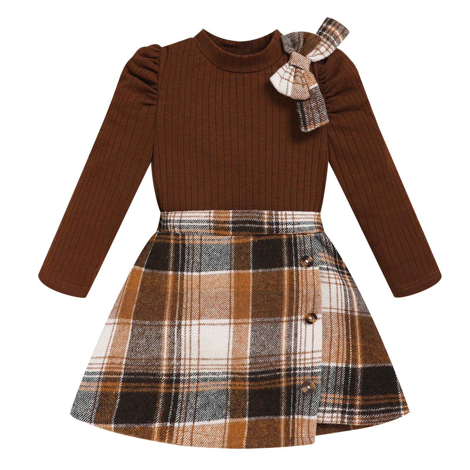 Design: Kids Little girl spring fall winter skirt set,knitted cotton long sleeve solid color top, button mini skirt with elastic waist , winter fashion warm toddler girls clothes outfits.