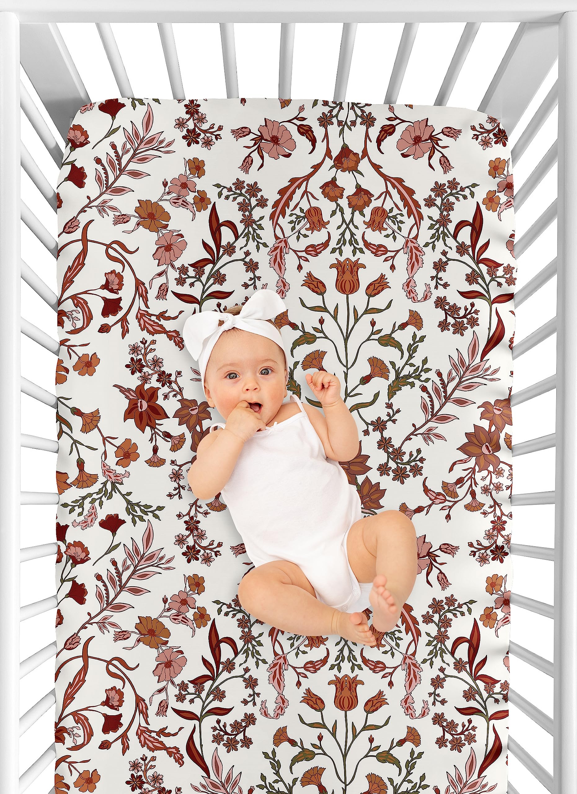 SNUG FIT: Includes (1) Fitted Crib Sheet 52in. x 28in. x 8in. Our newborn standard crib sheets fit snugly, with premium elastic sewn around the entire bottom edge for a secure fit on most standard sized cribs & toddler beds, to reduce shifting & bunching. This brushed microfiber crib sheet features an exclusive design of a burnt rust orange, burgundy, green & ivory botanical, bohemian, vintage, farmhouse boho wild floral print & is gentle on delicate skin to foster a soothing sleep environment.