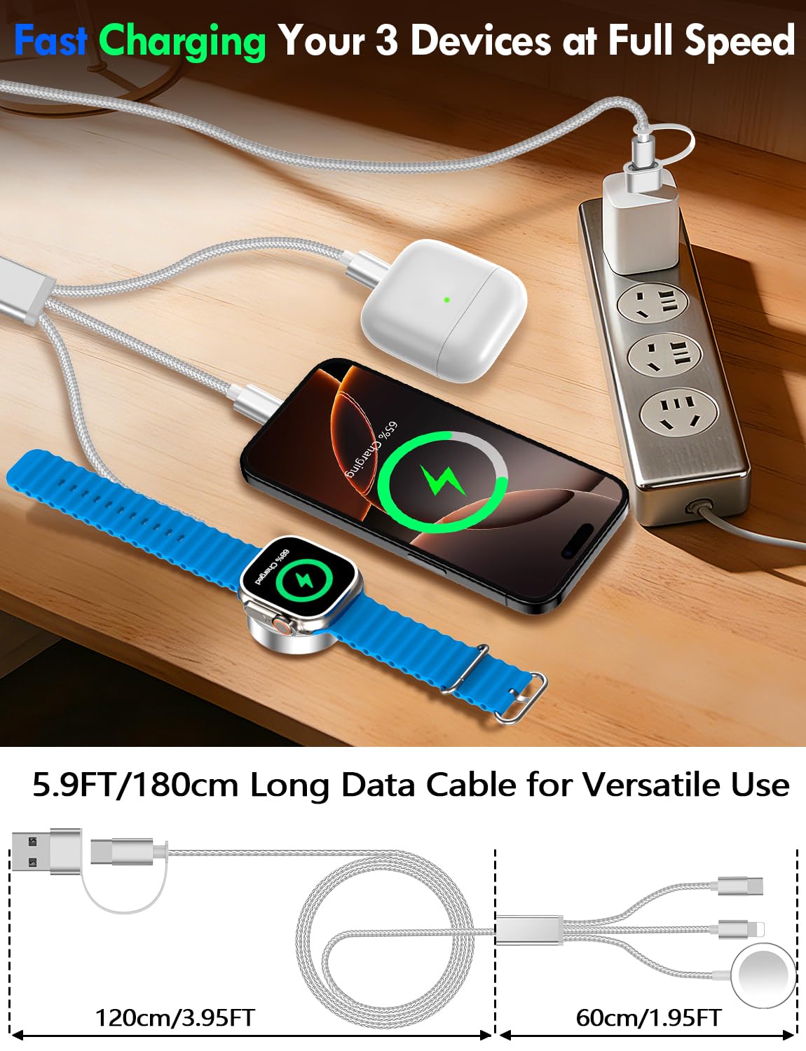【Portable Travel Camping Essentials&Car accessories】This 1.8M/6ft 3 in 2 charging cable is convenient to carry around with lightweight and portable design.It fits seamlessly into travel vocation essentials like bags and suitcases so it is a perfect choice when going on holiday,business trip,travel,office,dorm life,apartment living, college campuses,and hiking adventures. Ideal for charging in car,Charge iPhone, iWatch, and USB A to C cable-compatible devices simultaneously—no adapters needed.
