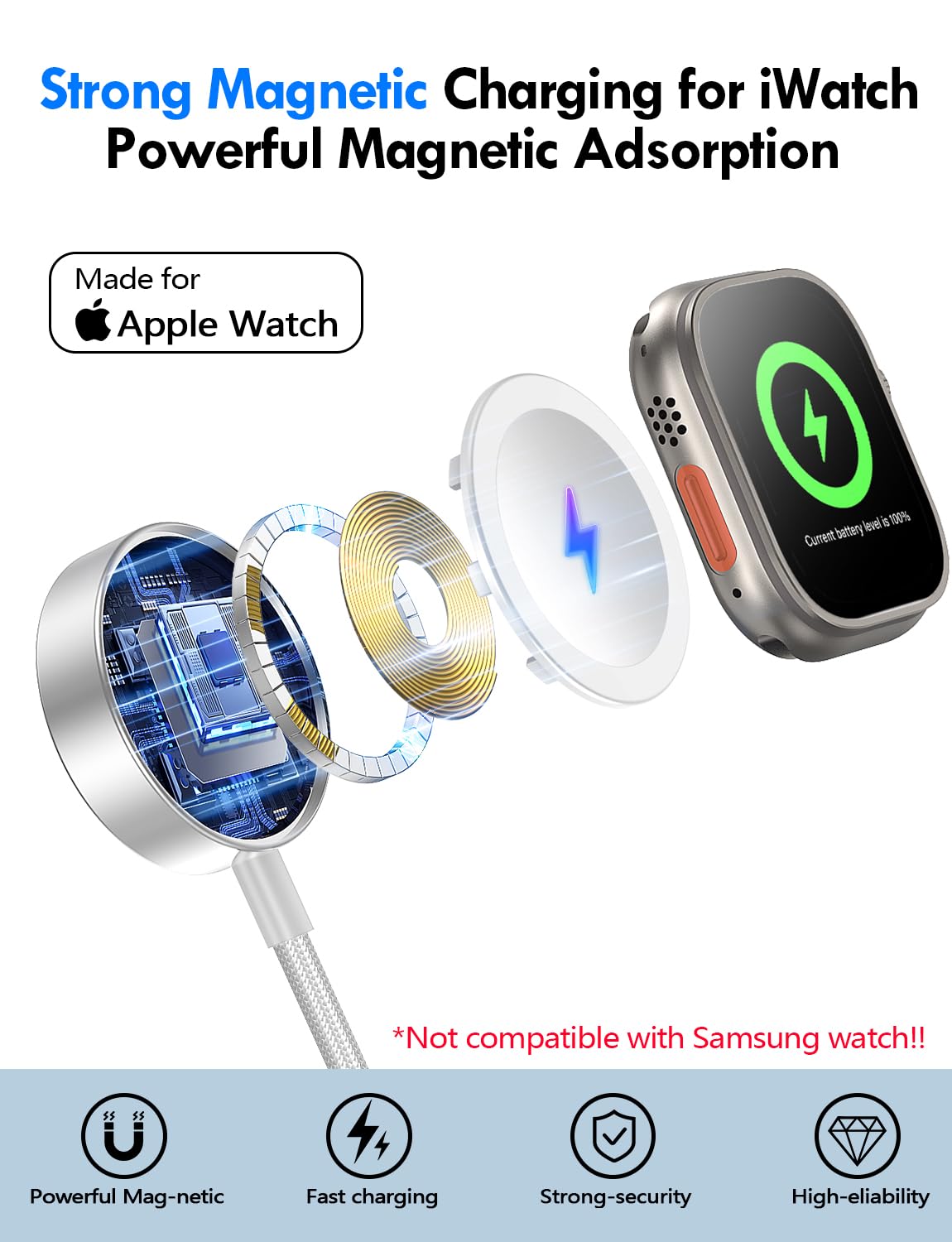 【Strong Magnetic Adsorption】The iWatch Charger with built-in magnet has strong adsorption perfectly snaps and centers to the charging coil on the back of your watch,stable and will not fall off,you will get wonderful charging experience(Note: no iwatch case for better charging speed).