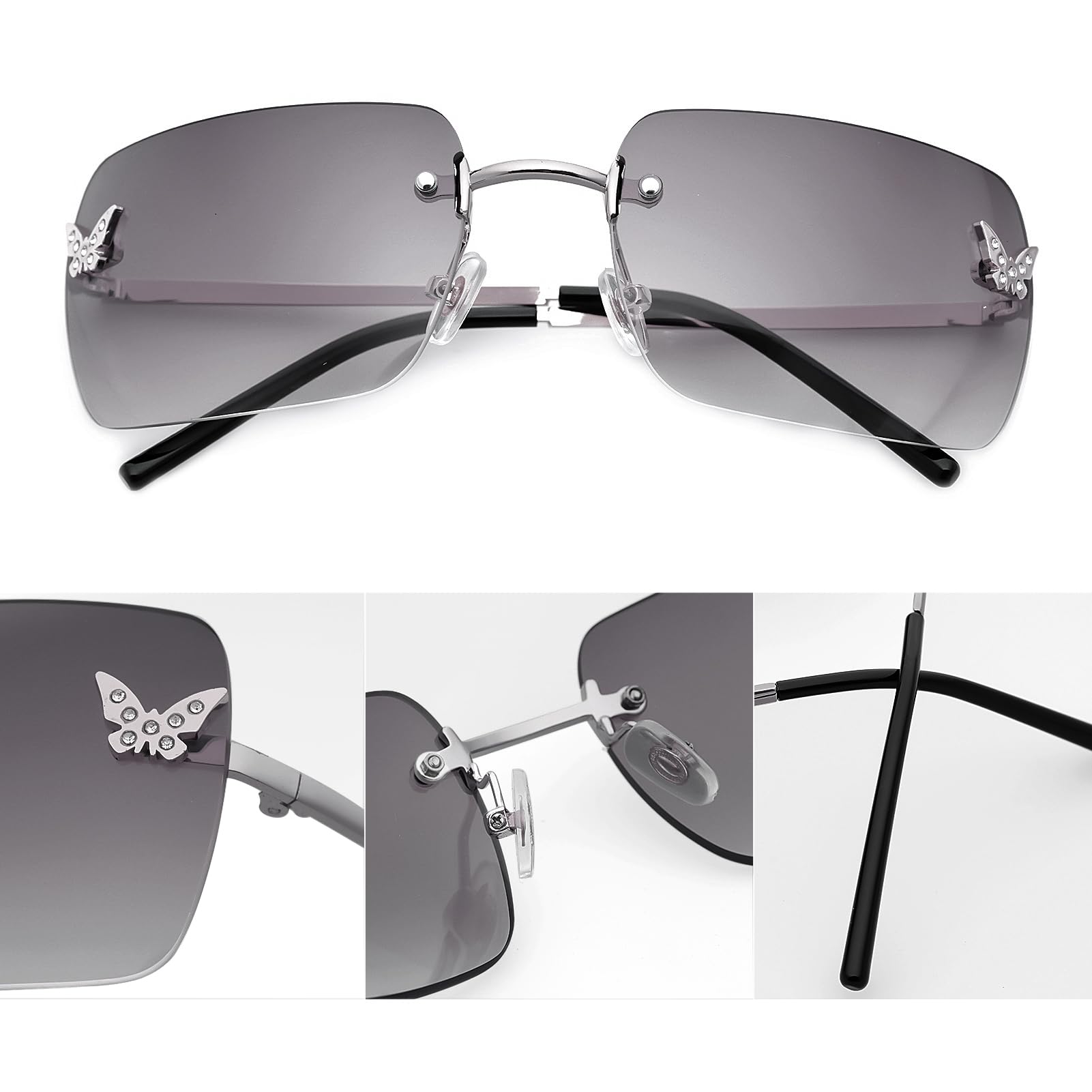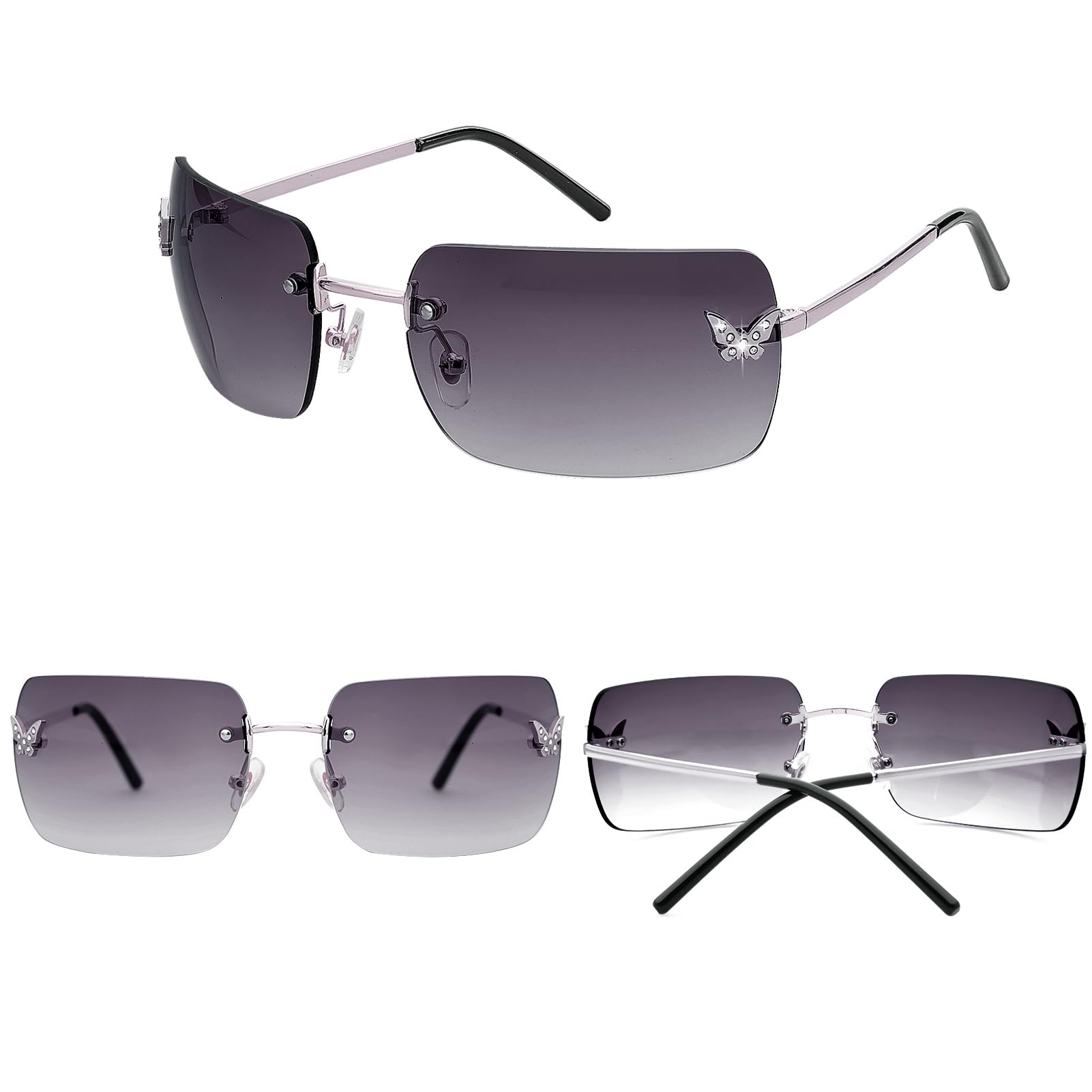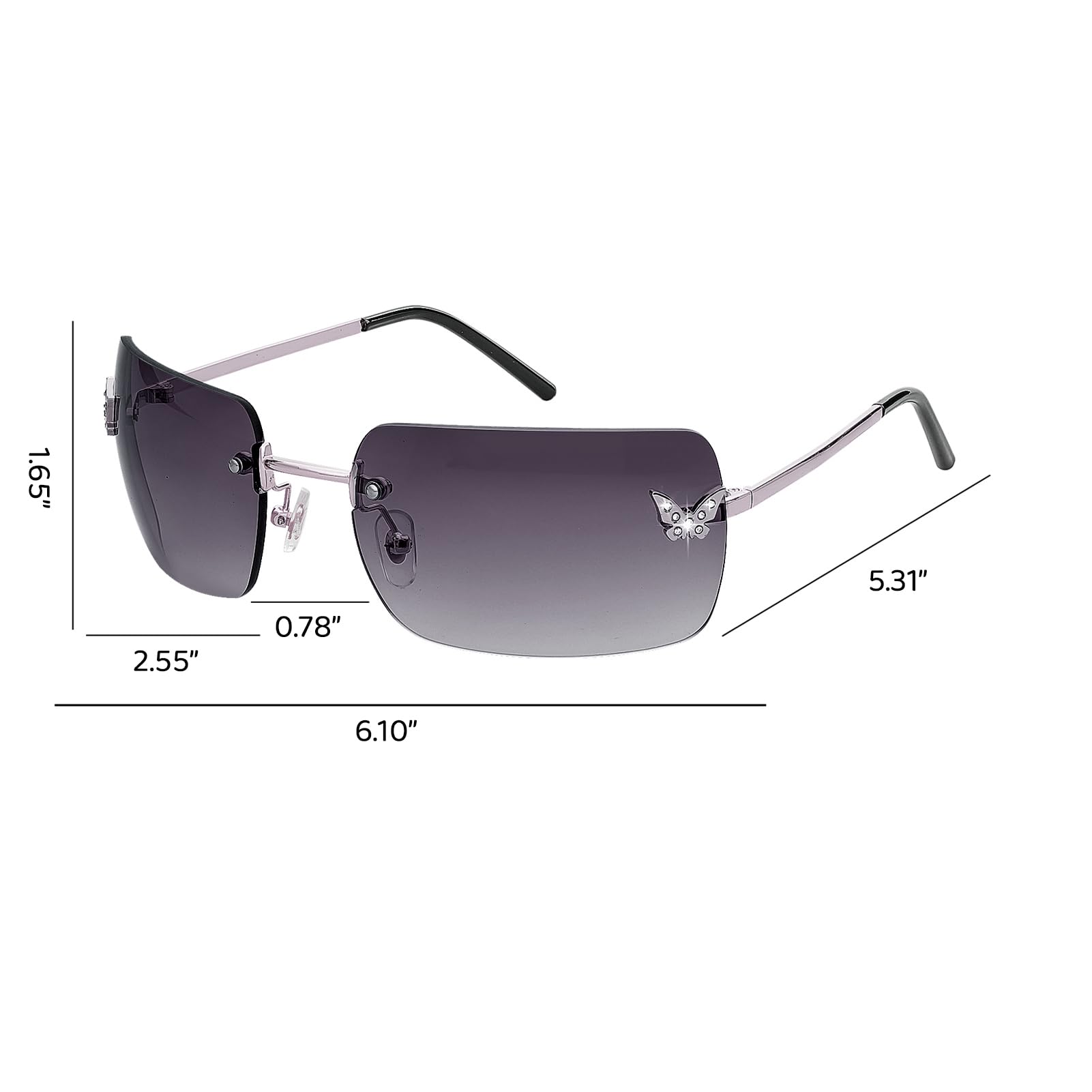 RECTANGULAR Y2K SUNGLASSES: They are not only stylish but also curved to fit greatly on your face. The frameless rectangular design enhances the beauty of the glasses, the metallic glasses legs and shiny little butterflies on the lens add a y2k touch