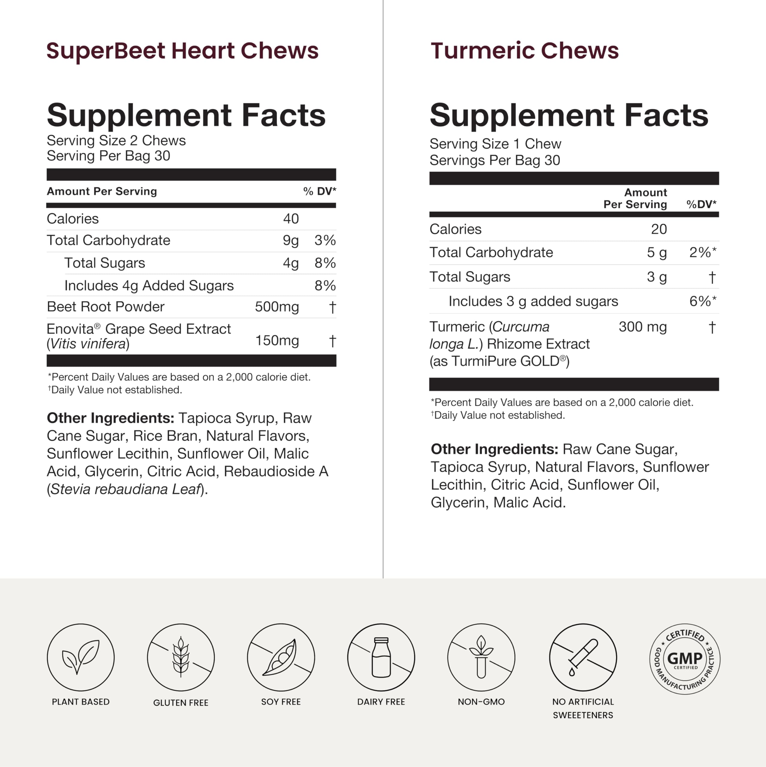 SuperBeets Heart Chews package contains 30 full servings of individually wrapped soft chews; suggested serving is 2 beet chews daily.