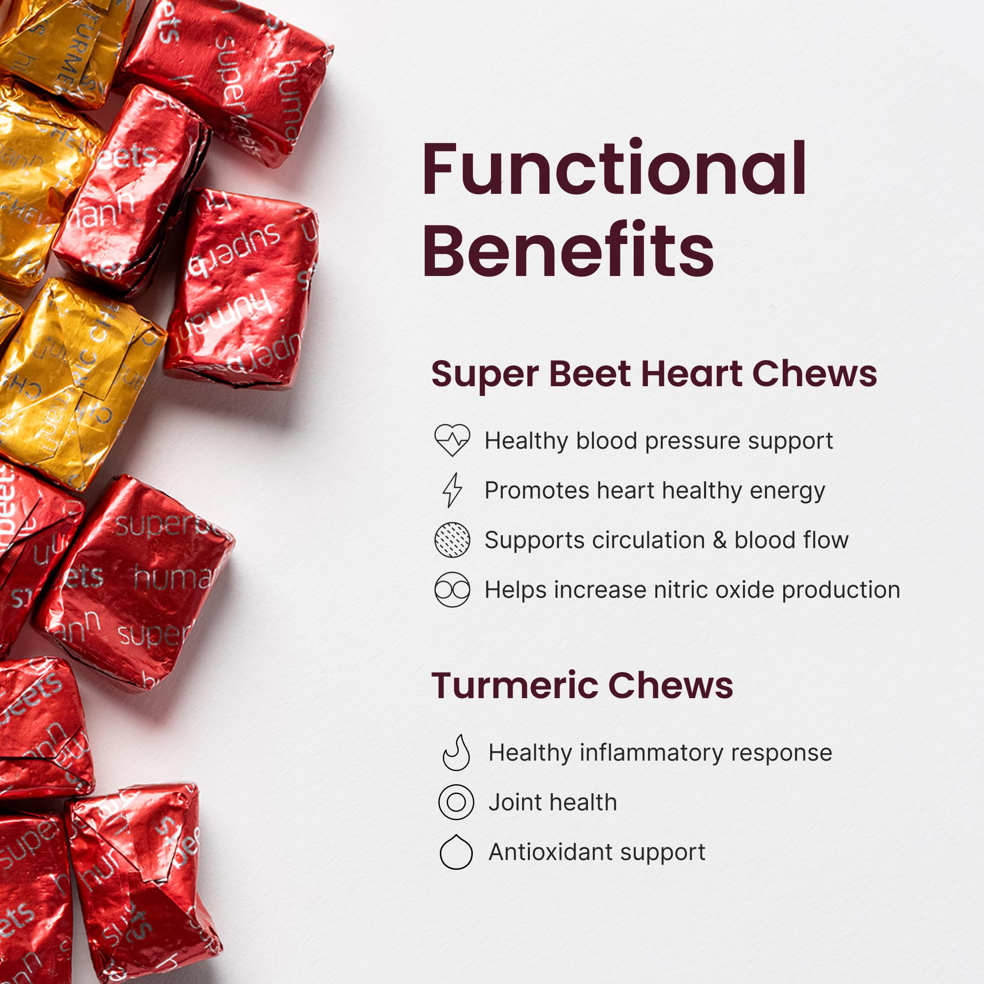 Individually wrapped and pomegranate-berry flavored, SuperBeets Heart chews soft chews are for busy professionals and lifestyles, providing heart health supplement support at home or during travel.