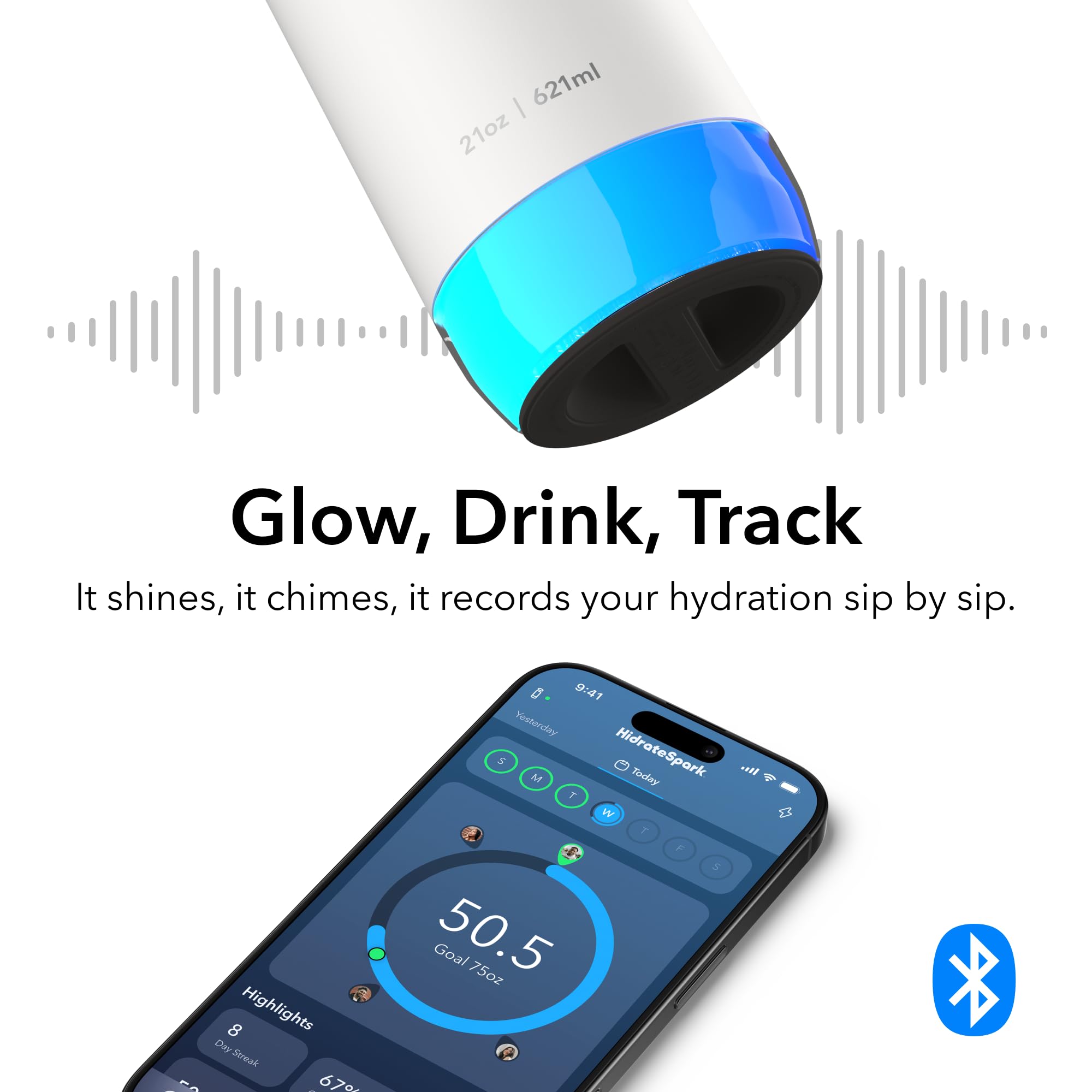 SMART DRINK REMINDERS (GLOW & SOUND) β Stay hydrated with customizable 360Β° glow alerts and optional sound reminders when itβs time to drink. Personalize glow color, pattern, and timingβplus sound type, frequency, and volume.