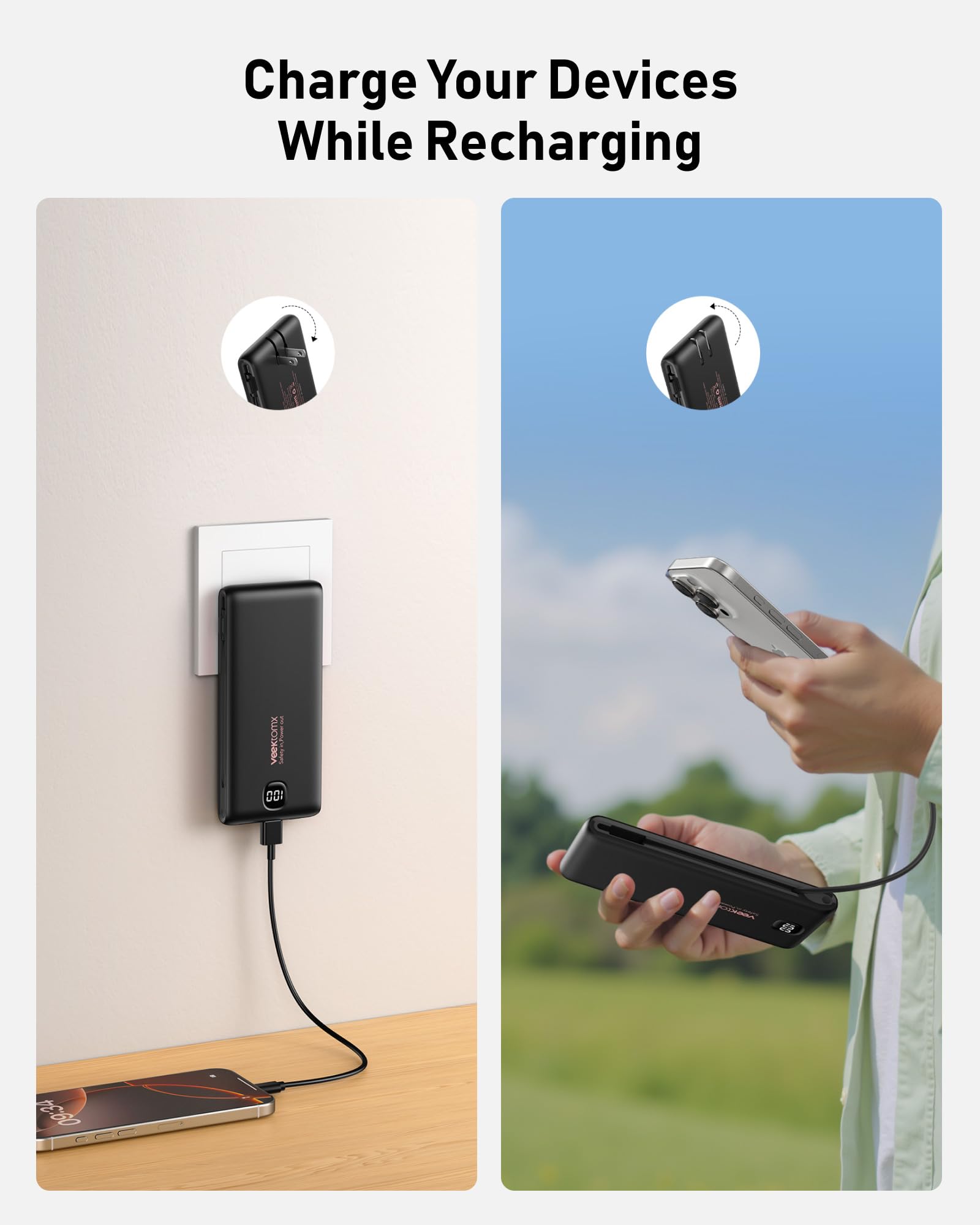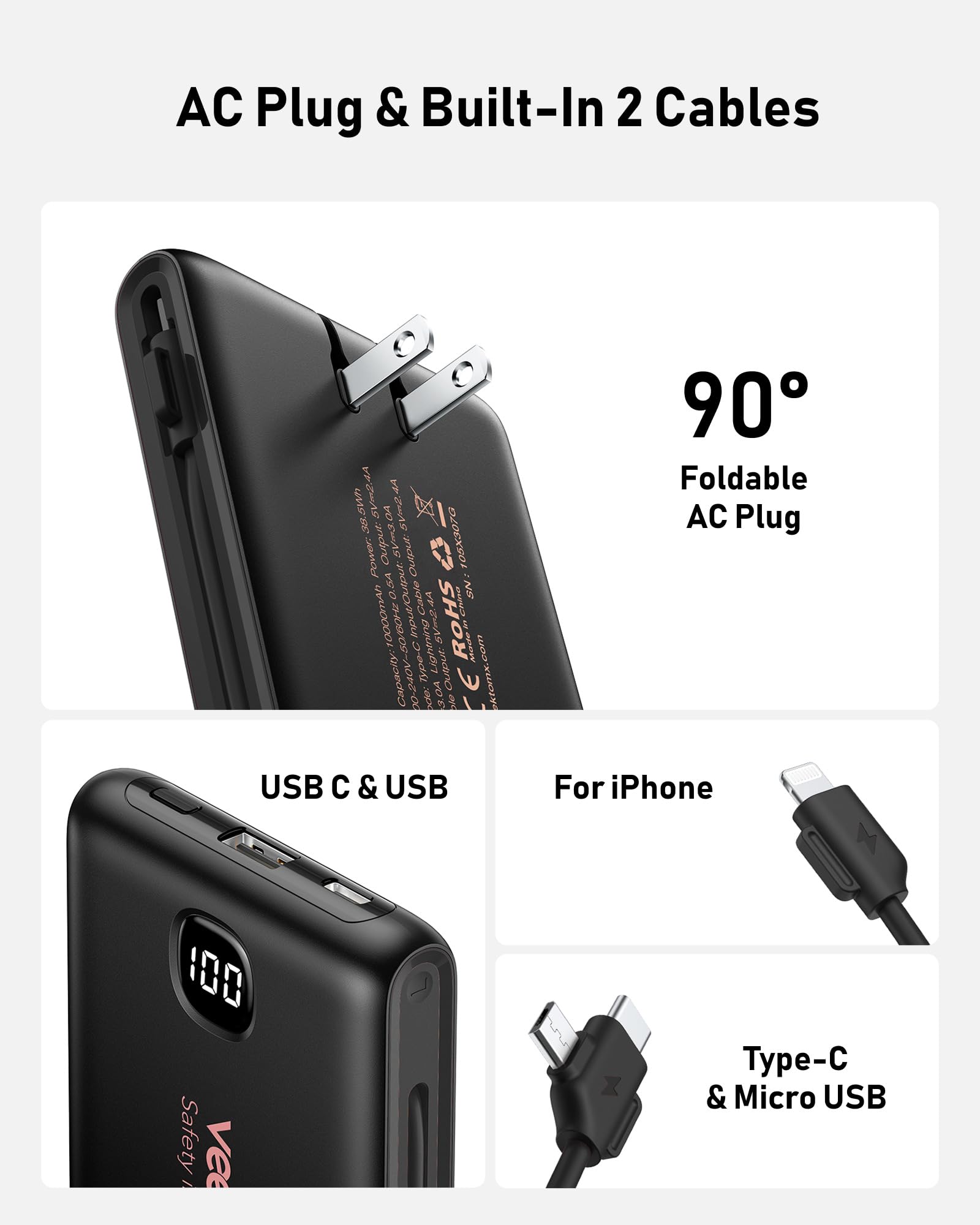 [AC Wall Plug Power Bank] This portable charger built in AC Wall plug, compatible with iPhone, Android, and USB C devices. The built-in AC Wall plug allows you to recharge directly from the wall outlet. No need to carry charging cables for your smart devices anymore, travel charger for multiple devices, and your best travel accessories for your smart devices.