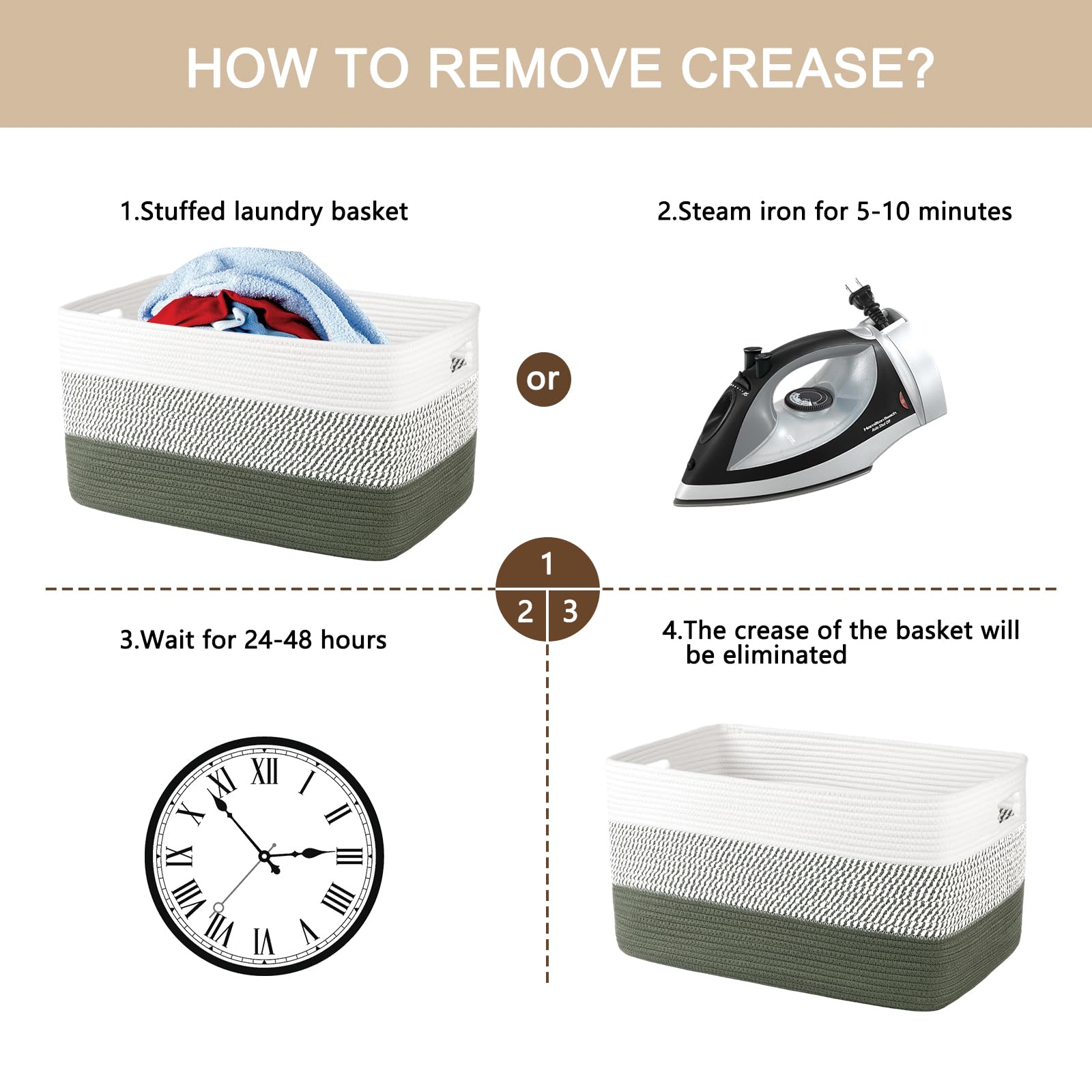 Washable Large Basket: This large basket can be washed by hand or machine with gentle detergent. If machine washed, please put them into a laundry bag. NOTE: These cotton rope baskets are folded when shipping, but it will turn back to its elegant shape quickly if you fill it with some towels or clothing, and iron is great idea to remove the creases