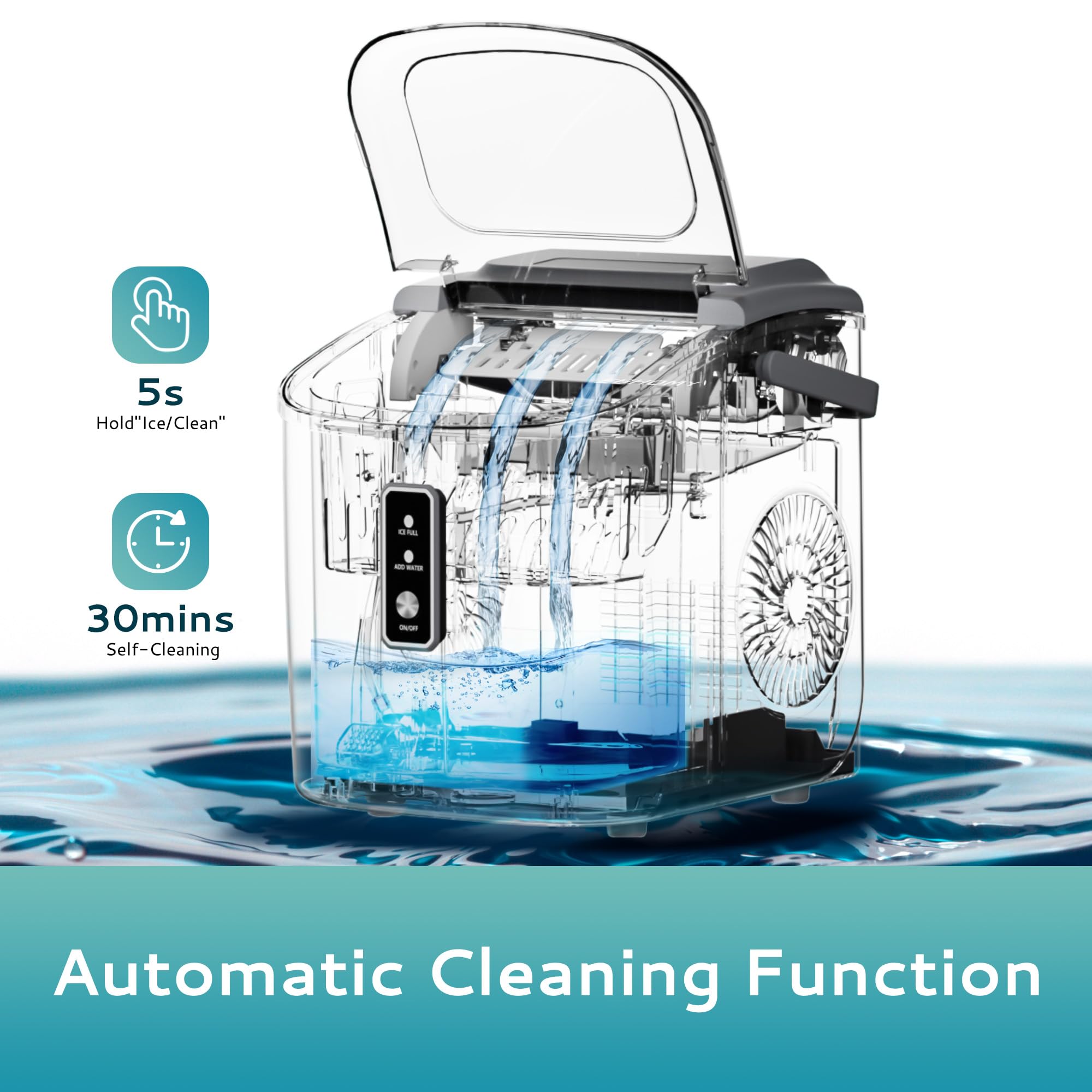 Smart Design & Auto-Cleaning: The ice maker has advanced infrared sensor. The "lCE FULL" indicator light will turn on when the basket is full. And it'll remind you to add water by flashing "ADD WATER". Moreover, the compact ice maker has a one-touch auto-cleaning function. Press the βIce/Clean" for 3s after adding water to run automatic mode for 30mins, allowing you to clean it quickly and easily