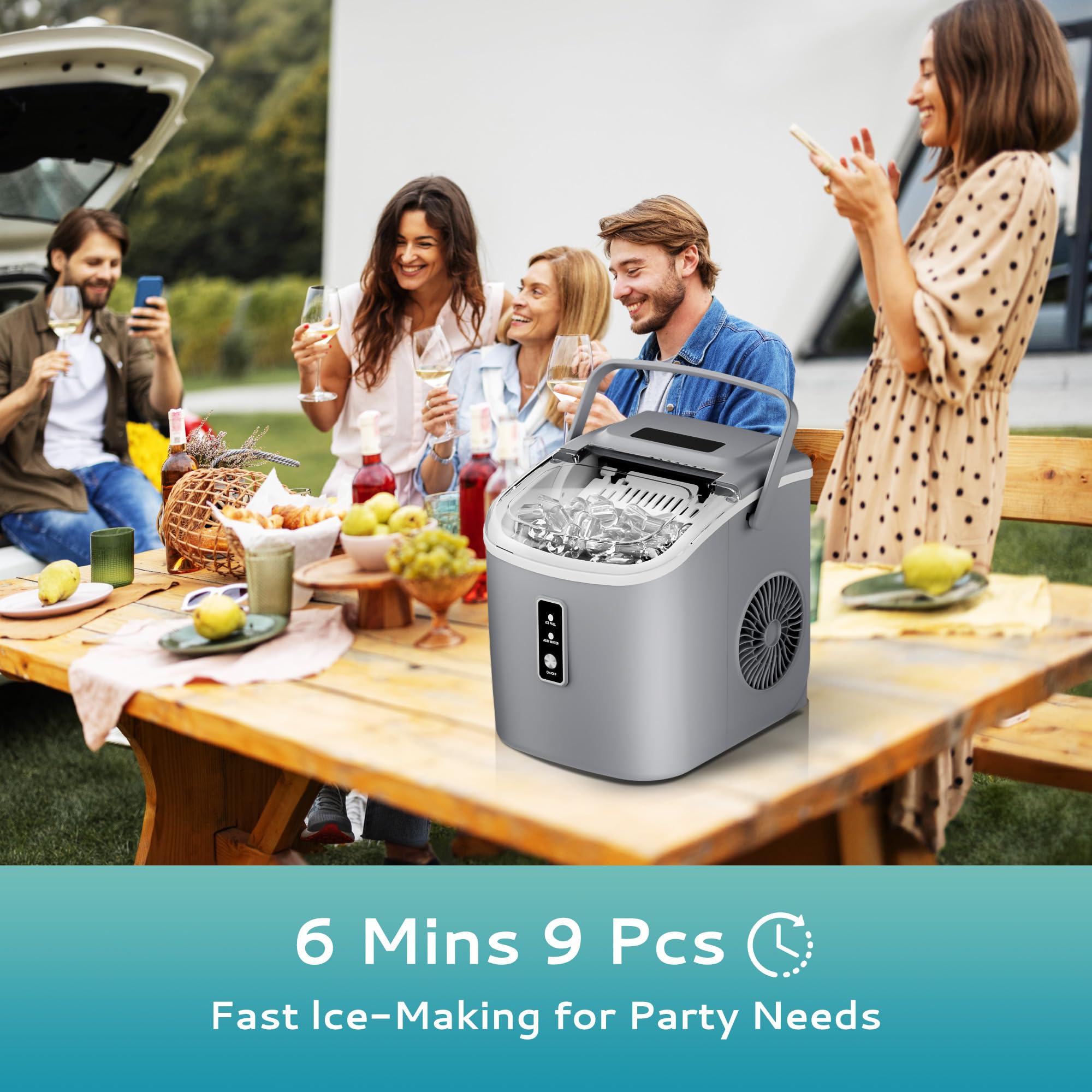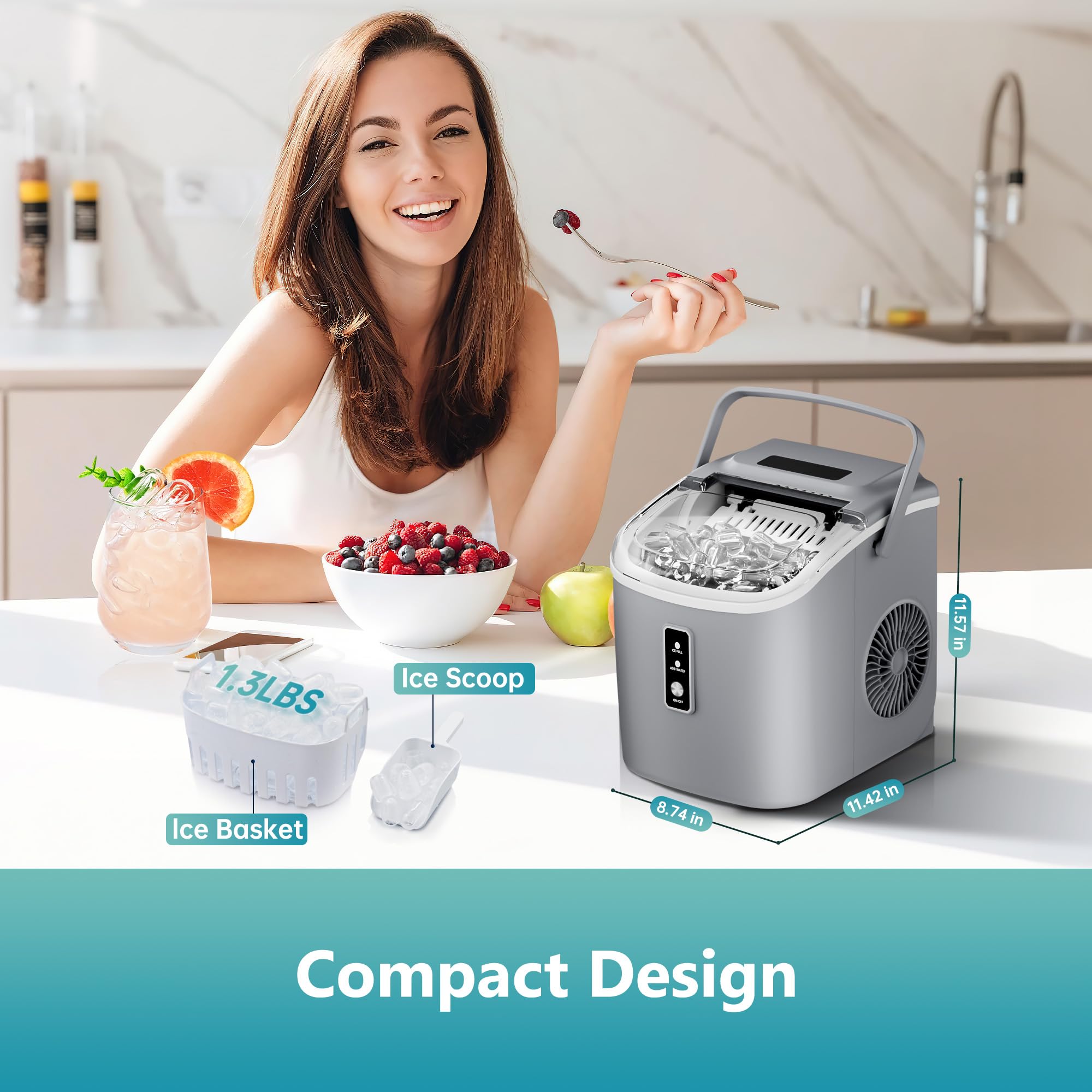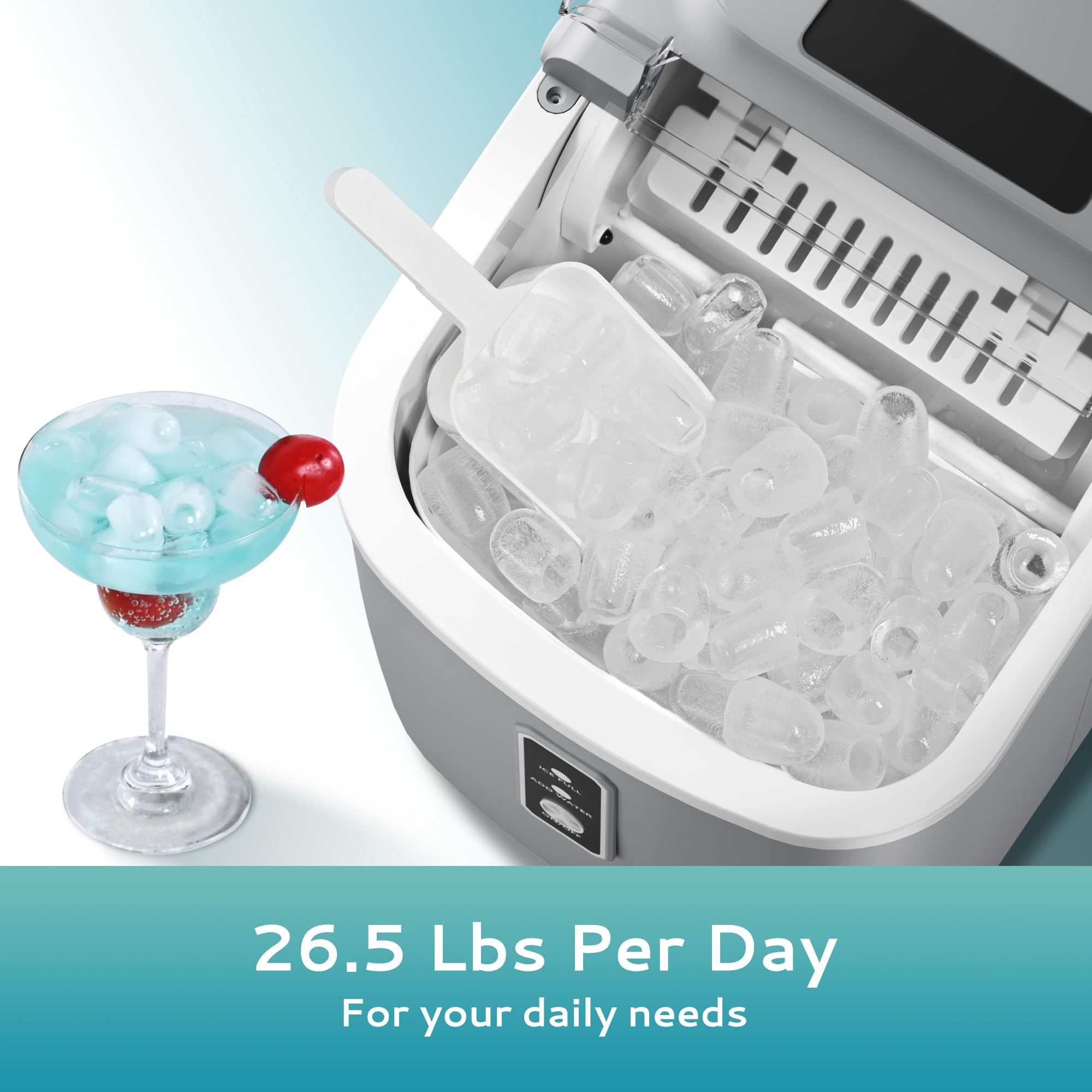 Portable Design & Excellent Bullet Ice: Our ice maker comes with a sturdy handle, weighs only 13.38lbs and with compact size 9.25(L)x11.54(W)x11.61(H)in. Those features make ice maker easy to carry and perform well on any occasions like Kitchen/Home/Camping/RV. Also, the newly designed countertop ice maker produce the most popular bullet-shaped smooth ice cubes, which won't stick together easily or hurt your hands or mouth even are excellent for cold drinks or iced coffee