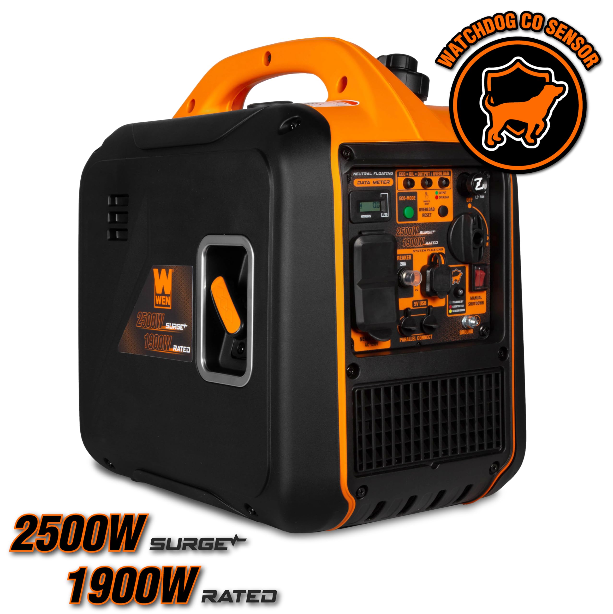 Remember when you had clean and quiet portable power? The WEN 2500-Watt Inverter Generator provides clean energy, free of voltage spikes and drops, without all the noise of a regular generator. Produce up to 2500 surge watts and 1900 rated watts of power. The WEN Watchdog CO Shutdown Sensor helps protect both you and your family by automatically turning off the generator if dangerous levels of carbon monoxide are detected. Our 80cc engine operates at a quiet 65 decibels at quarter load. This limits its invasiveness while camping, hunting, tailgating, and restoring backup power. The WEN 2500W Inverter Generator is also equipped with fuel shutoff. This feature turns off the flow of fuel, allowing for the generator to use up the remaining fuel from the carburetor before automatically shutting down. This helps fight the build-up and blockages caused by stagnant fuel inside of the carburetor, minimizing maintenance while prolonging the unit’s lifespan. Designed to mirror a pure sine wave, this generator limits total harmonic distortion to under 0.3 percent at no load and under 1.2 percent at full load, making it safe to run laptops, cellphones, monitors, tablets and other sensitive electronics. The lightweight 37.5-pound design makes for easy portability while the ultra-efficient 1-gallon tank provides up to 4.4 hours of half-load run time. The fully-packed panel comes equipped with two three-prong 120V NEMA 5-20R receptacles, two 5V USB ports, and an hour meter for monitoring routine maintenance. Maximize fuel economy by turning on eco-mode. This allows the generator's engine to automatically adjust its fuel consumption as items are plugged into and unplugged from the panel, preventing the unnecessary usage of fuel. Need more energy? Easily link up any two WEN inverter generators using a WEN 120V Parallel Connection Kit (sold separately) in order to share wattage amongst multiple units. Low-oil and low-fuel automatic shutdown combine with the built-in overload protection and indicator lights to safeguard both your generator and your electronics from damage. Compatible with the WEN GNC235 Generator Cover and the WEN 55201 Magnetic Dipstick. And because this is a WEN Product, your inverter generator comes backed by a 3-year limited warranty, a nationwide network of skilled service technicians and a friendly customer helpline. Remember when your generator powered your electronics safely and quietly? Remember WEN.