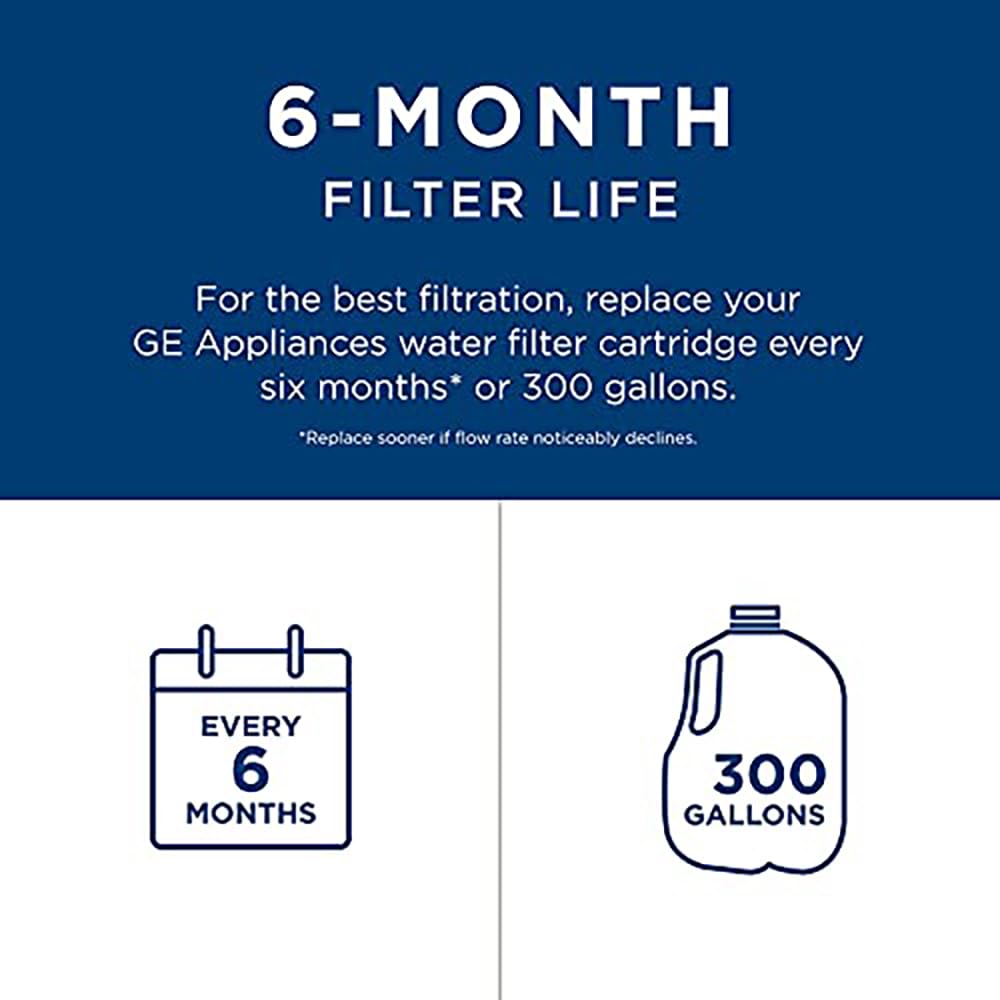 SIX-MONTH FILTER LIFE: For best filtration results, filter cartridge should be replaced every six months or 300 gallons (Replace sooner if flow rate noticeably declines)