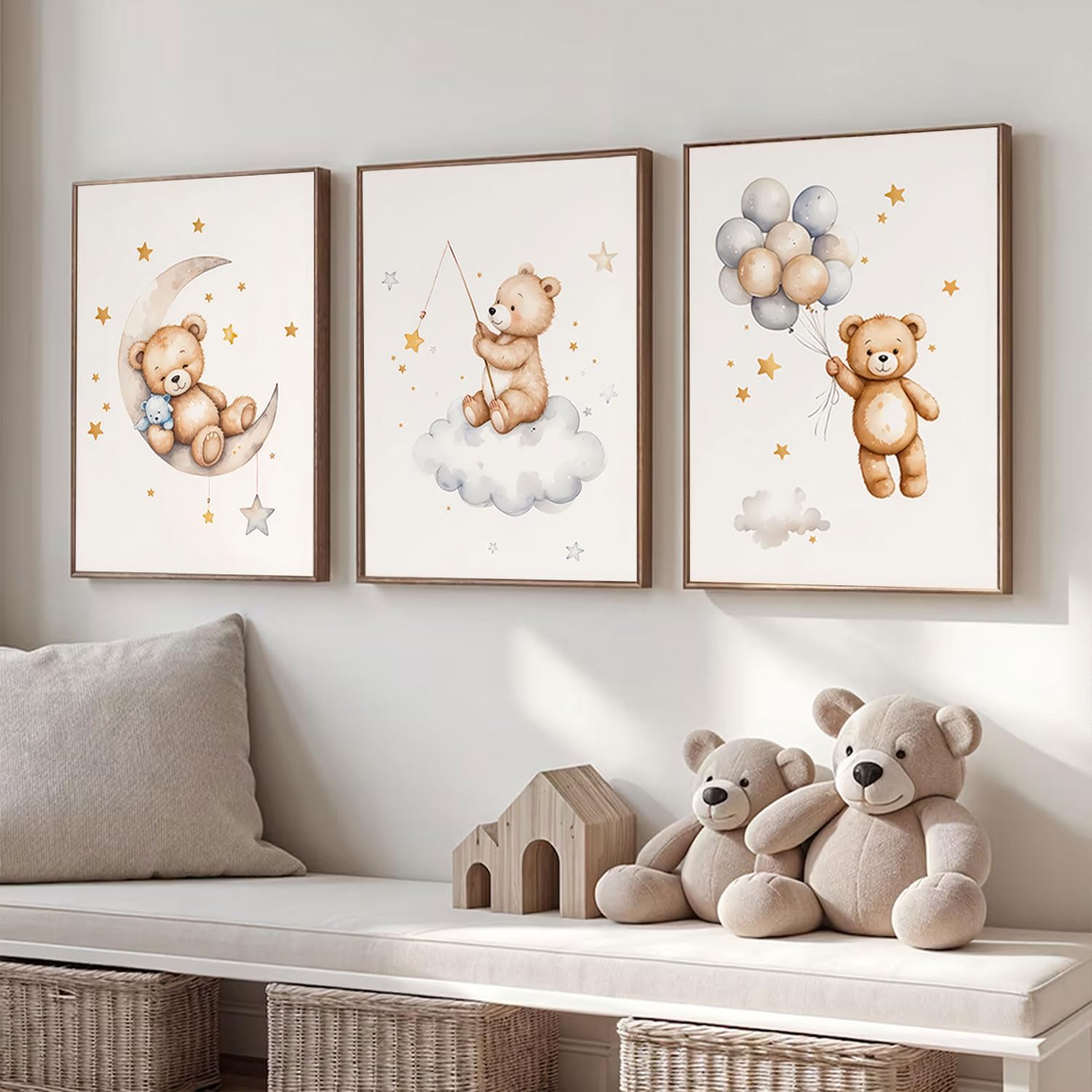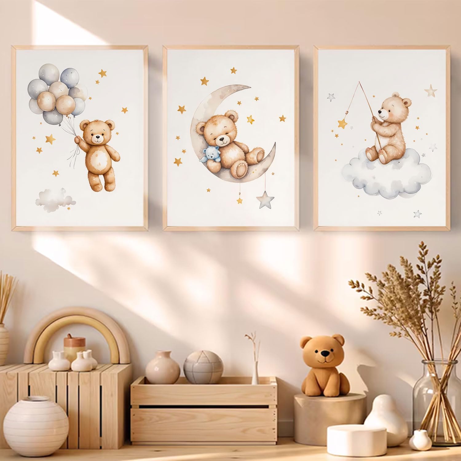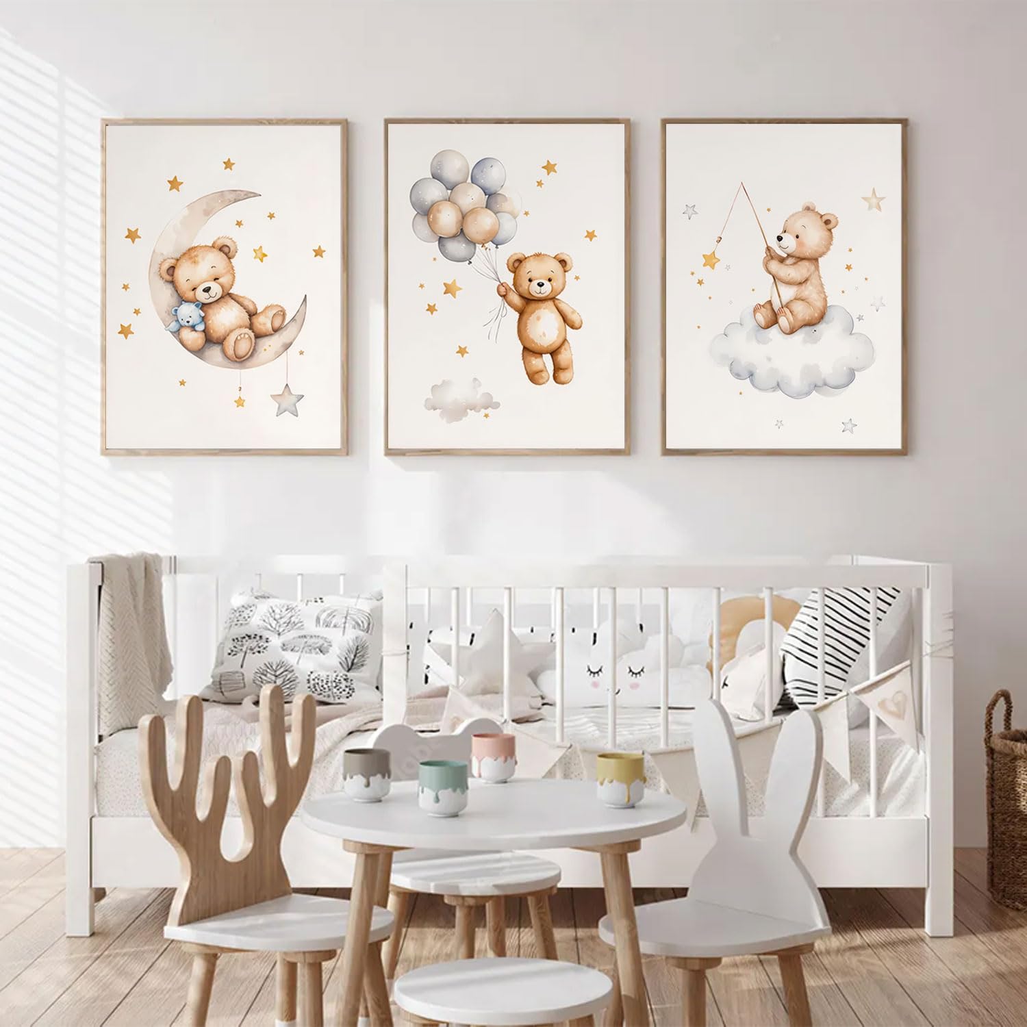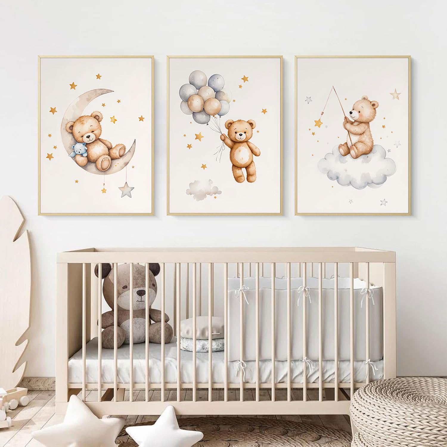 Adorable and Dreamy Design:This 3-piece wall art set features a sweet teddy bear sleeping on the moon, surrounded by stars, clouds, and balloons β€” perfect for creating a cozy and calming nursery atmosphere