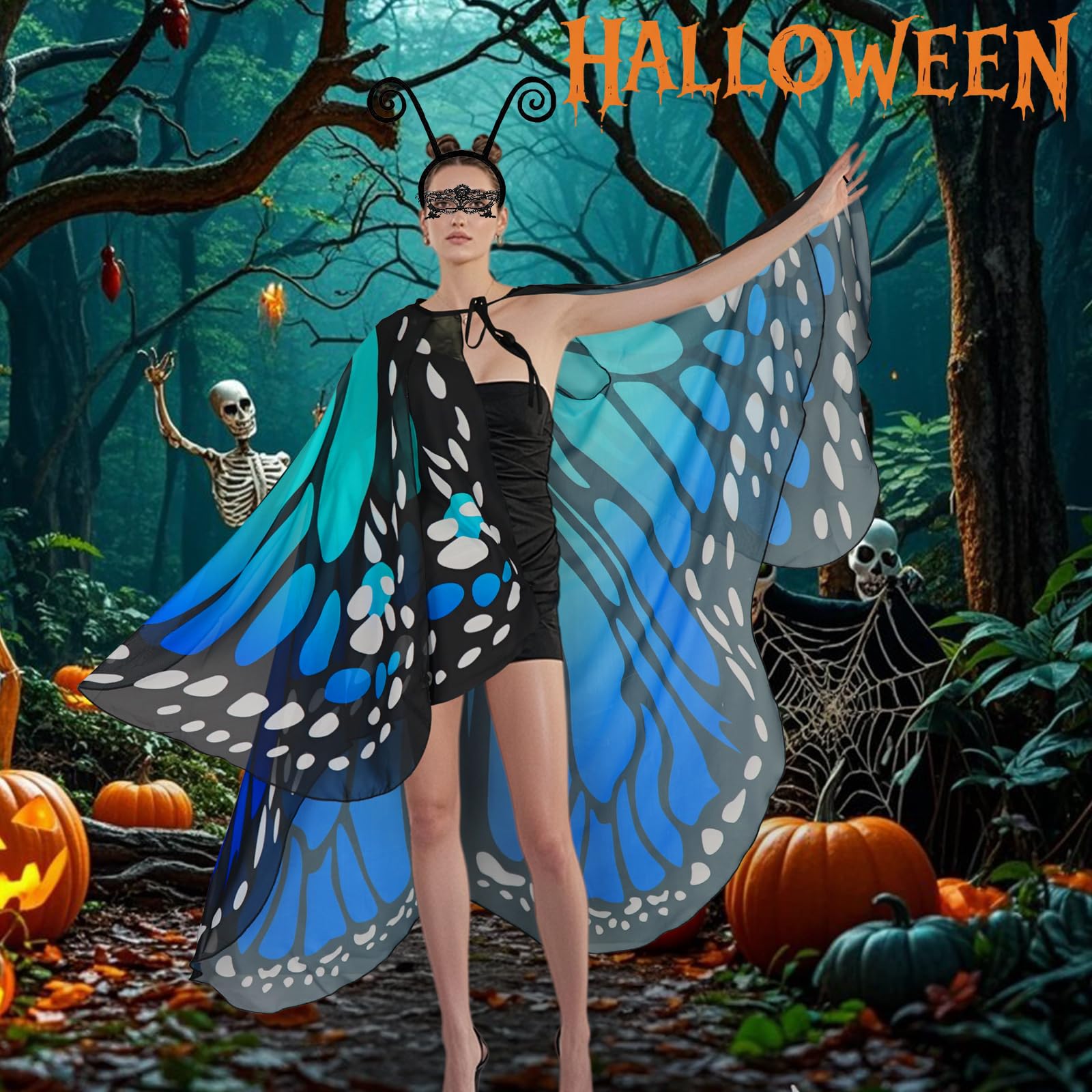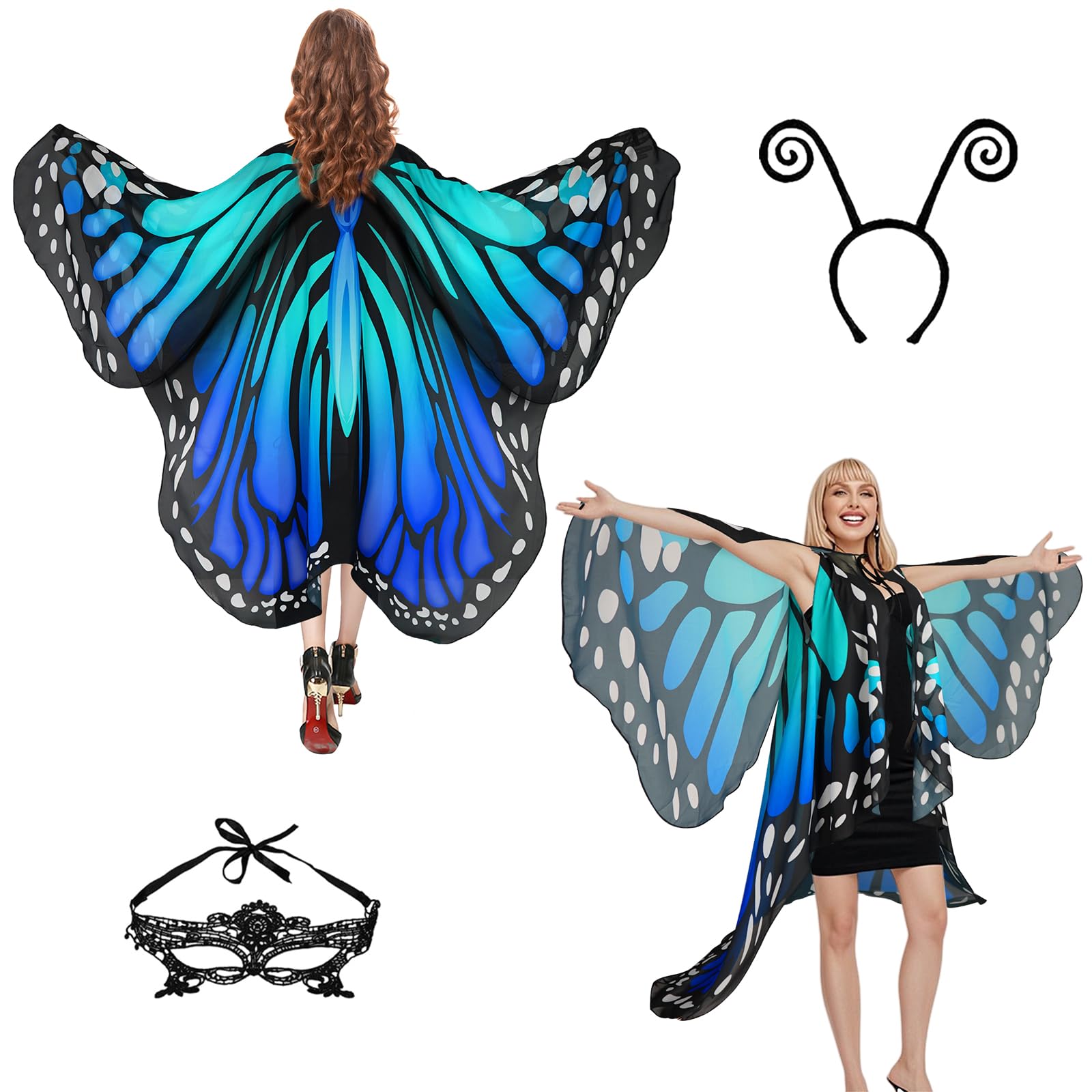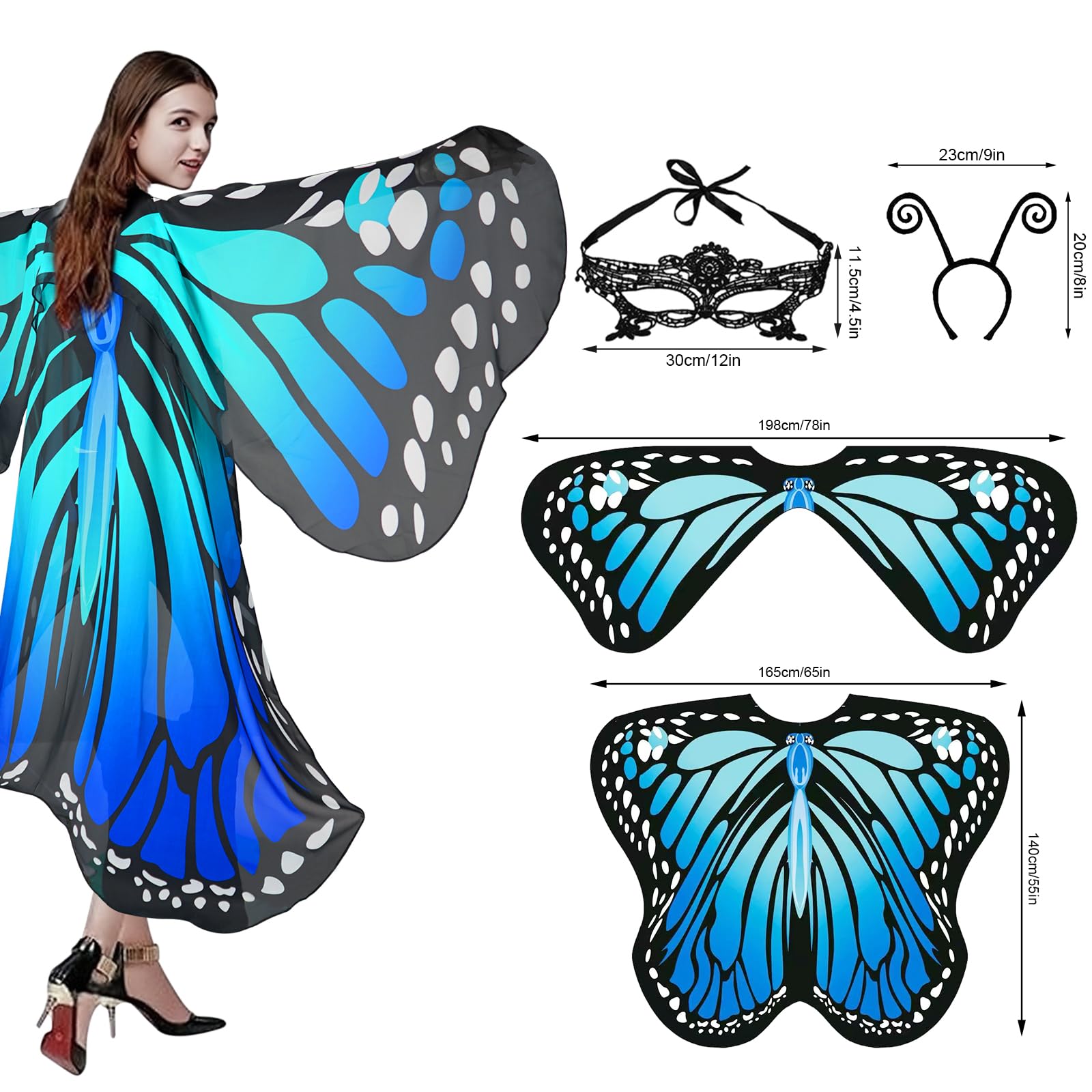 Description Halloween Womenβs Set: 1 x Innovatively designed butterfly double-layer wings shawl, 1 x antennae headband and 1 x lace mask make you look even more mysterious and charming at the party! Material: The butterfly costume is made of high-quality light chiffon fabric that will not fade; the tentacle headband is made of velvet and plastic, which is strong and does not break easily; the mask is made of lace and soft to the skin. Suitable sizes: Butterfly wing shawl is about 78*55 inches, butterfly cloak is larger, and may not be suitable for children under 15 years old, tentacle headband height is about 30 cm/11.81 inches, lace mask size is about 12*4.5 inches Widely applicable to all occasions: Butterfly wings costumes are a great decoration for Halloween costumes, parties and beach decorations, and are also thoughtful gifts for mothers, lovers, family and friends. Light up your party: These butterfly costumes are designed in the shape of butterfly,which are cute and fun, and you can wear them on different occasions such as Halloween, Christmas, parties, carnivals, and show your vitality .