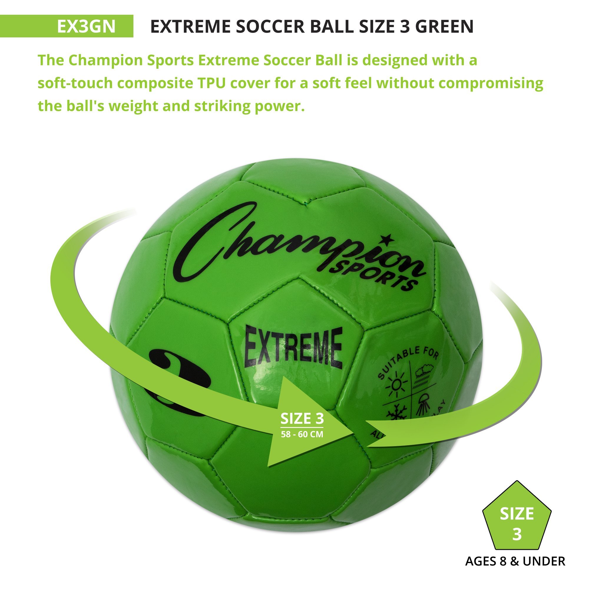 The Champion Sports Extreme Soccer Ball is a Durable, All-Weather Ball for Competition & Training. Built for both competitive matches and casual play, the Champion Sports Extreme Soccer Ball is designed to perform in any weather. Its soft-touch TPU cover provides a comfortable feel for dribbling, passing, and striking, while maintaining the weight and power needed for accurate shots. Engineered for durability, this high-quality soccer ball features a butyl bladder for superior air retention and machine-stitched panels for long-lasting performance. Whether you're playing in the heat, cold, wind, or rain, this ball maintains its shape and reliability. Available in three sizes: EX3 (Size 3): Ages 8 & under, EX4 (Size 4): Ages 8 to 12, and EX5 (Size 5 – Official Size): Ages 12 & up. Choose from a variety of vibrant colors, including Red, Orange, Yellow, Green, Blue, Purple, Black, Silver, and Pink. Note: Ball ships deflated. Pump sold separately.