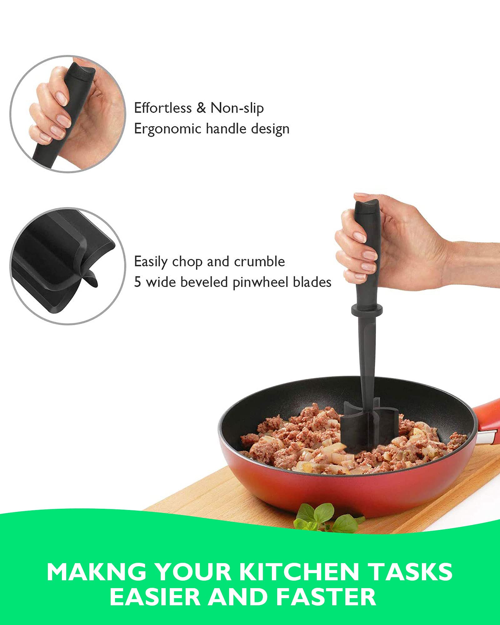 ✅【Easy to Mix n Chop】- The meat masher with 5 wide beveled pinwheel blades, it's easily chop and crumble food. Ergonomic handle design which can perfectly fit your hand curve and increase grip, non-slip and greatly relieve hand fatigue while have long time gripping. Desiged in USA.