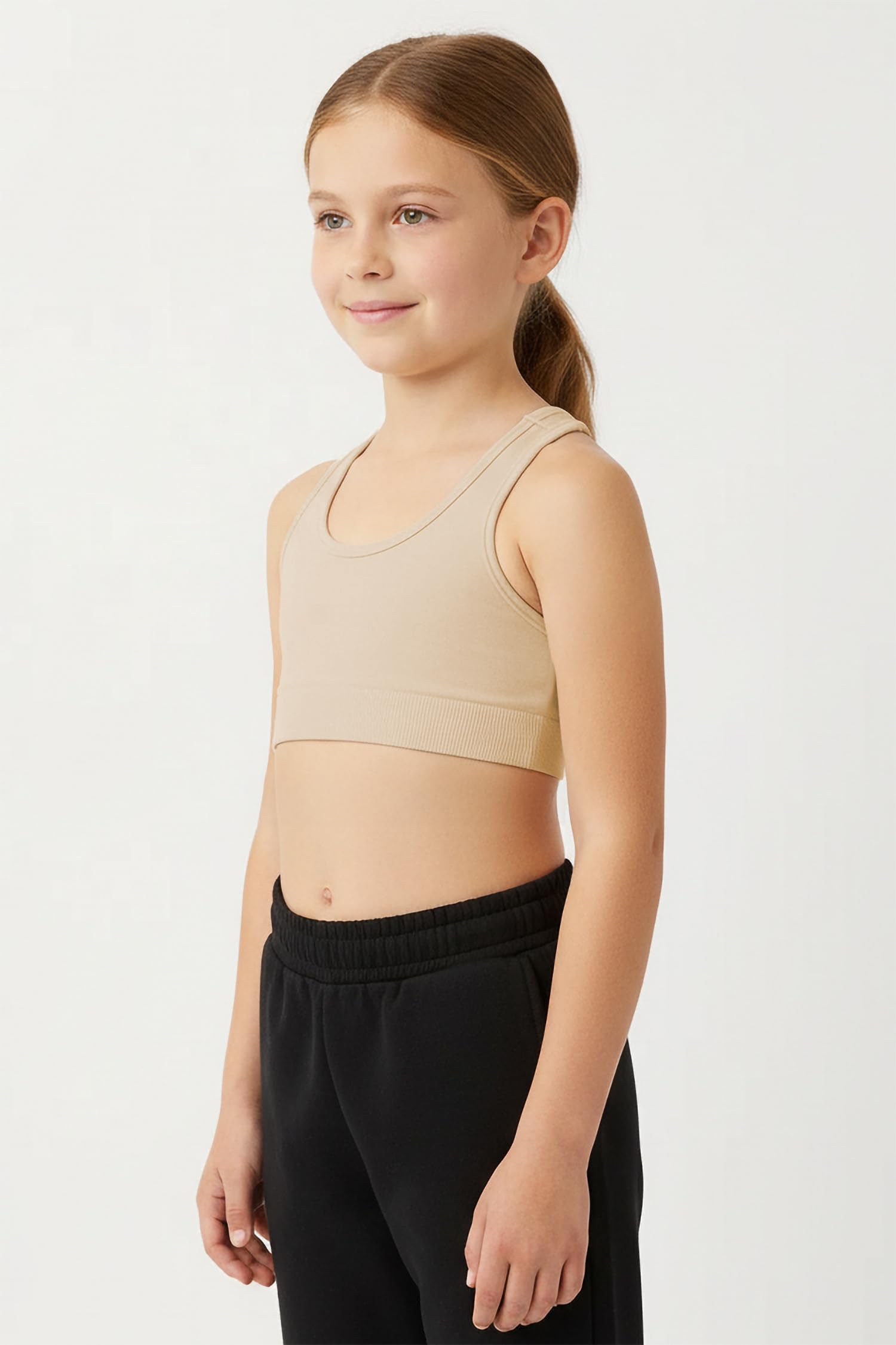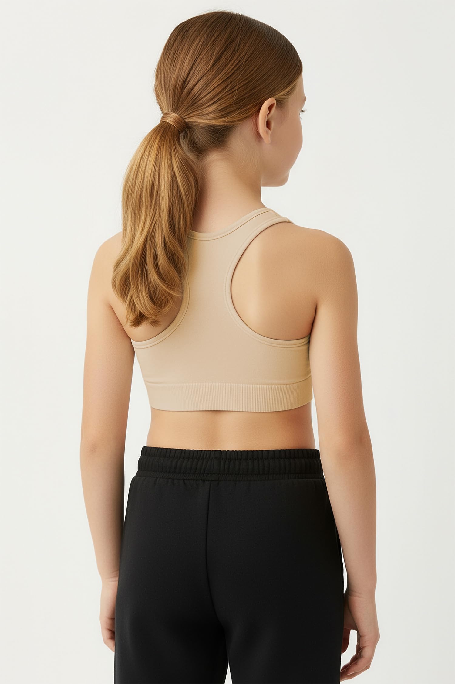 This athletic top is a seamless training bra that provides gentle support and coverage without any adjustable straps. The bra has a seamless construction that eliminates irritation or discomfort, and fits snugly and comfortably against the body, allowing young girls to move freely during their activities. The outfit's moisture-wicking capabilities keep kids sweat-free and dry during exercise, making it a perfect choice for active children who want to stay comfortable and cool while they play.