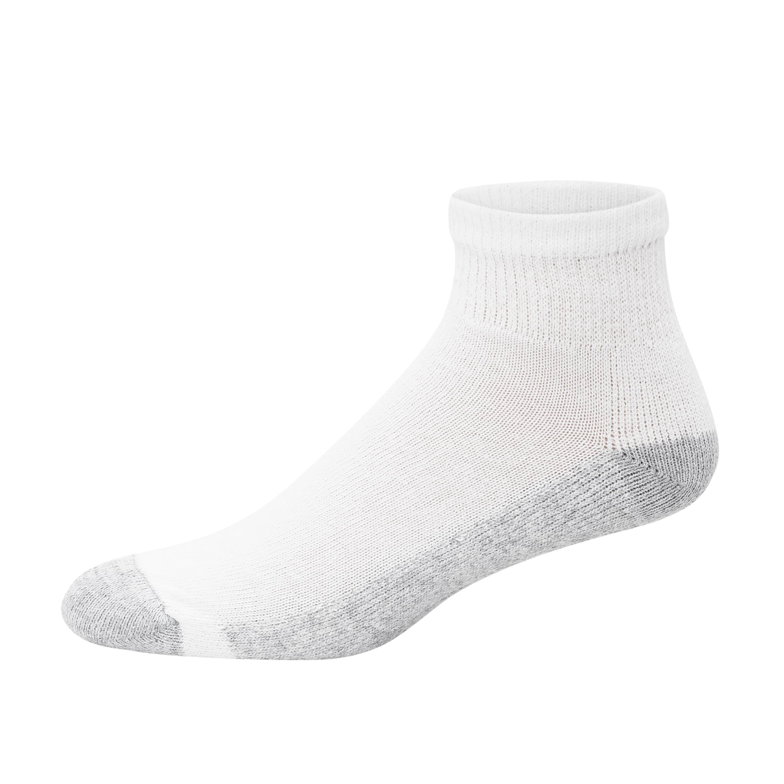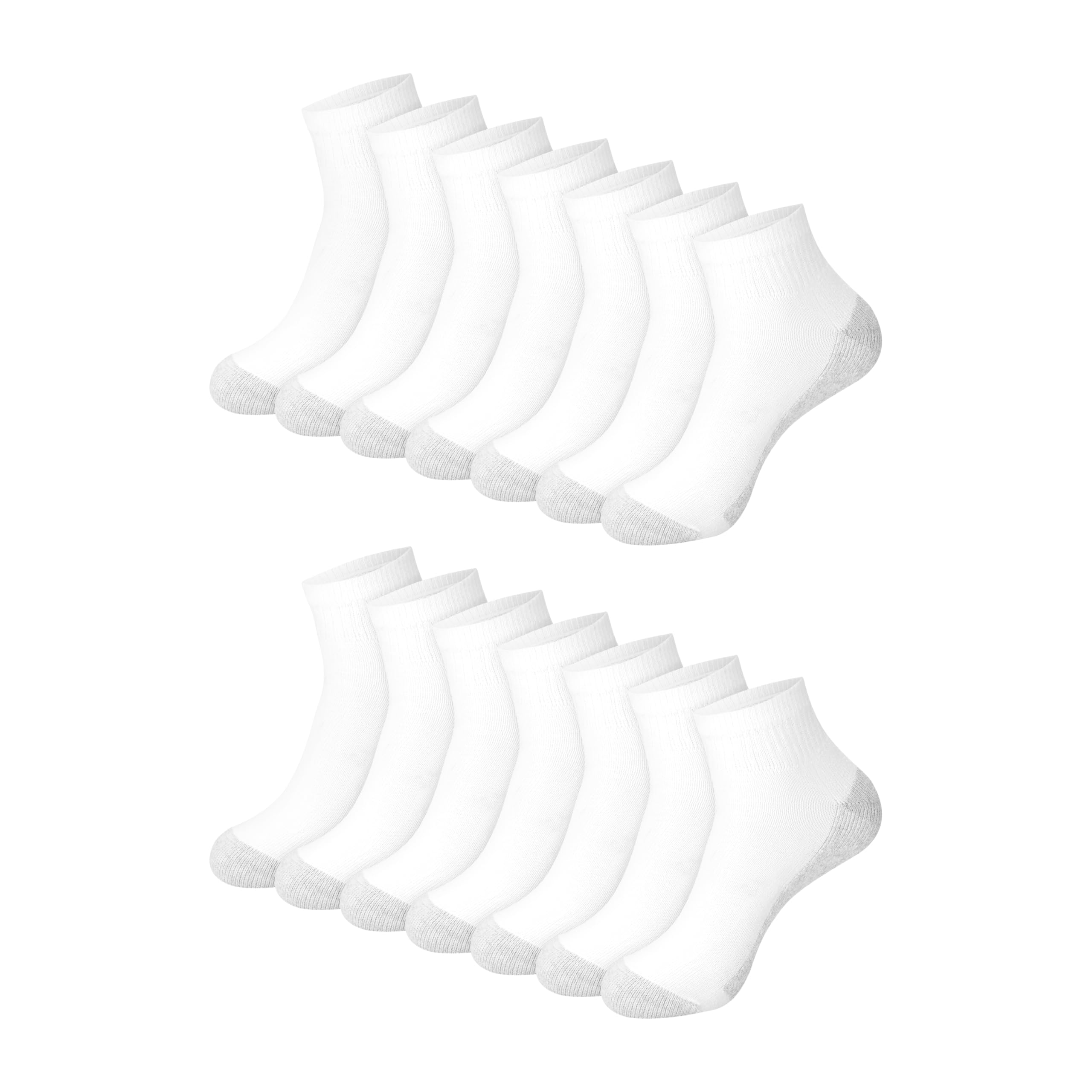 Description There's a lot to like in Hanesยฎ Double Tough men's ankle socks. These ankle socks are made to last and cradle your foot while doing so with a reinforced, cushioned bottom you'll appreciate with every step. These classic ankle socks are made with Hanes' high-tech features, including Cool Comfortยฎ fabric that wicks away moisture to keep feet cool and dry, and FreshIQโข advanced odor-fighting technology that attacks odor-causing bacteria to keep feet smelling fresh. Smooth toe seams enhance comfort even more, and a touch of spandex in the poly-cotton knit assures a stay-in-place fit. Stock up on these made-to-last quarter socks in a convenient 14-pack and fill your sock drawer with comfort.
