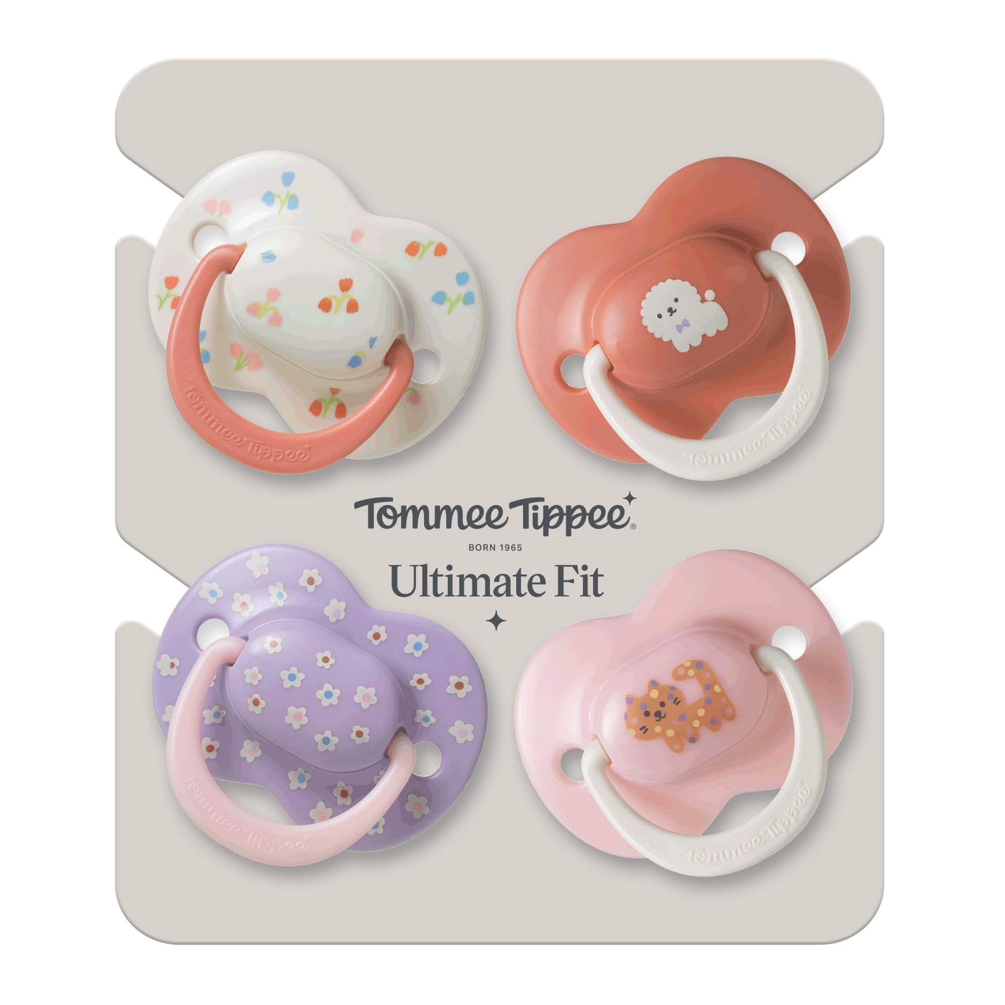 These symmetrical pacis have curved edges and are detailed with holes on either side for enhanced air flow. Shaped for a comfortable fit, any way up, our Ultimate Fit baby pacifiers are decorated with playful pets, patchwork plaid, and ditsy daisy prints. Symmetrical shield and silicone nipple that's the same shape as other Tommee Tippee pacifiers* Pacifier clip compatible handle Extra air holes support maximum air flow, help to reduce moisture build-up, and protect newborn skin from irritation Cool, cute, and colorful designs with fun characters and contrasting touches BPA-free *Excludes Breast-like and Cherry Latex.