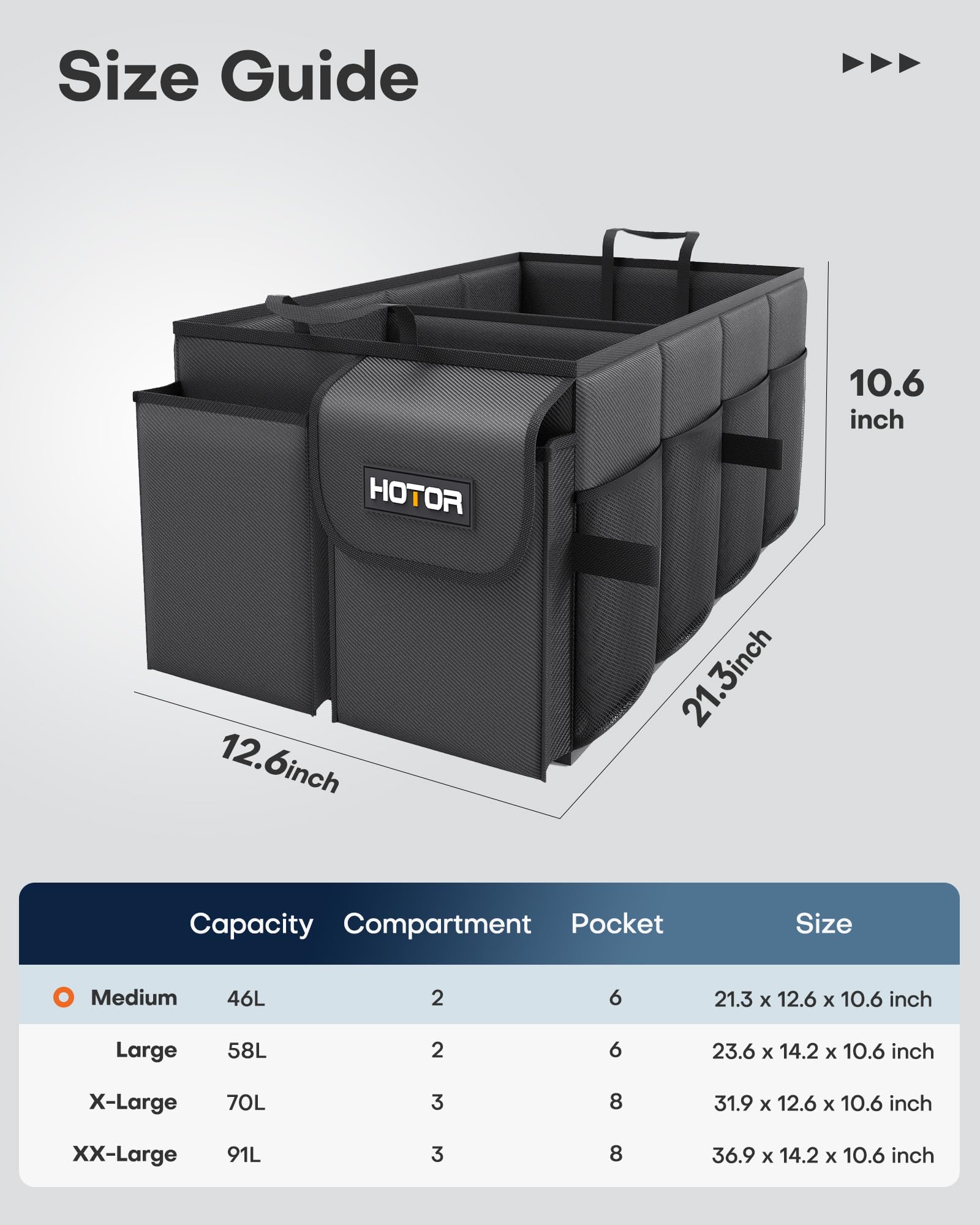 CONVENIENT ACCESS: HOTOR car trunk organizer for SUV is equipped with 2 compartments and 6 stretchy mesh pockets to make items easy to see and grab when needed. No more digging around a messy trunk to find what you need. Just grab and go.
