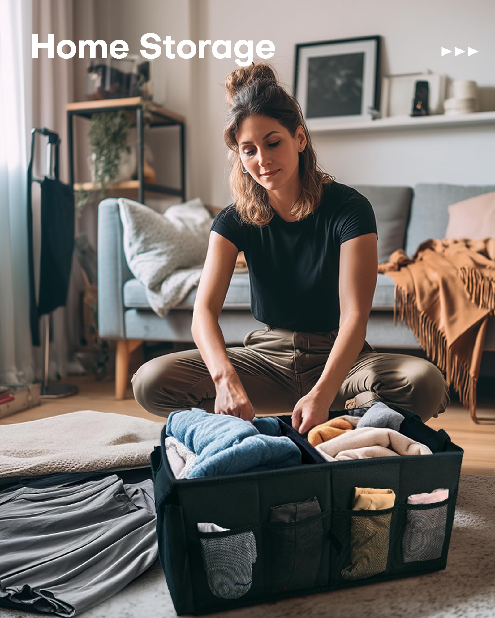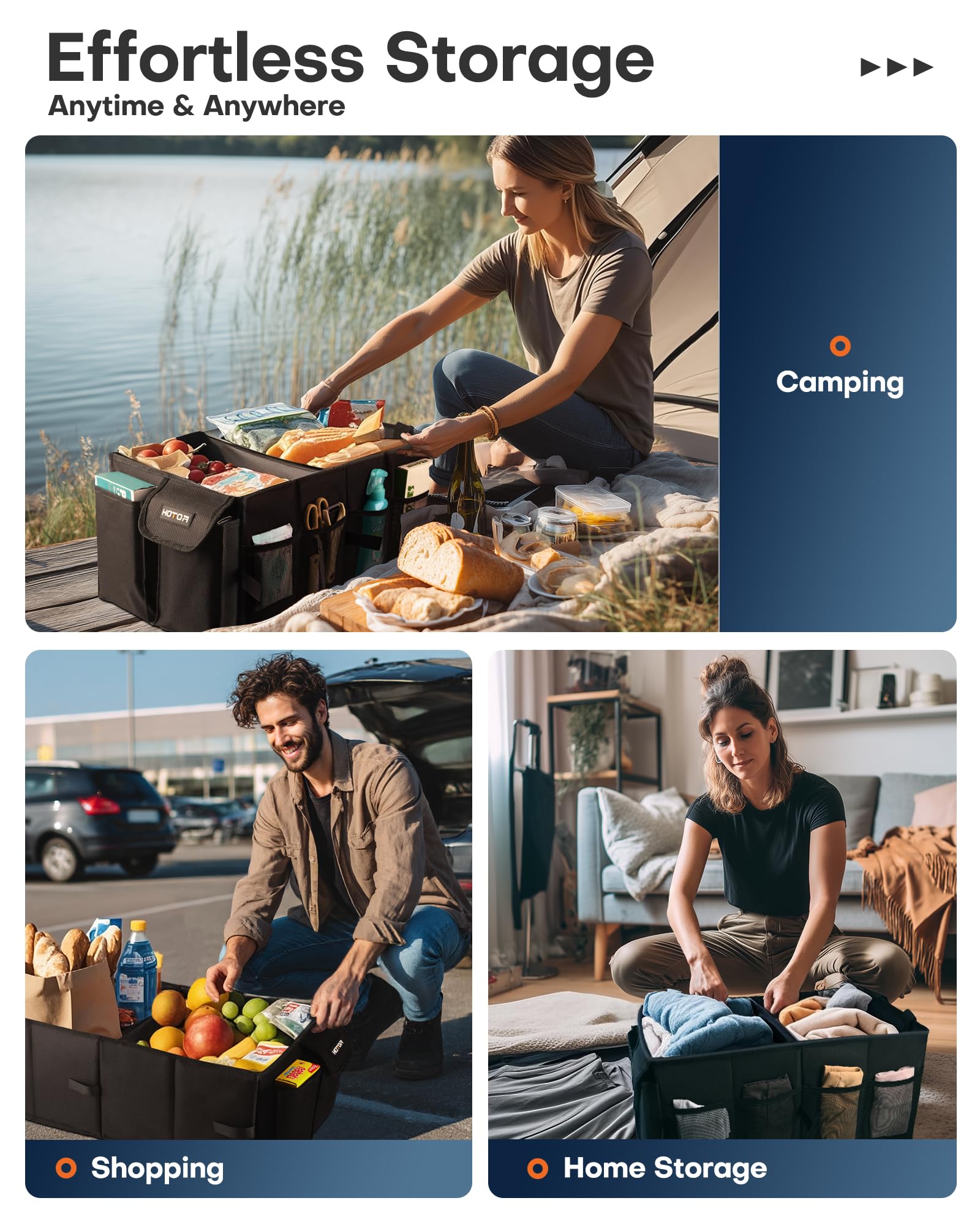 FLEXIBLE CONFIGURATION: Adjustable side Velcro strips allow you to fold the car storgae organizer fully or halfway to fit your storage needs. Just put it in the trunk, backseat, front seat, or wherever you want in the car.