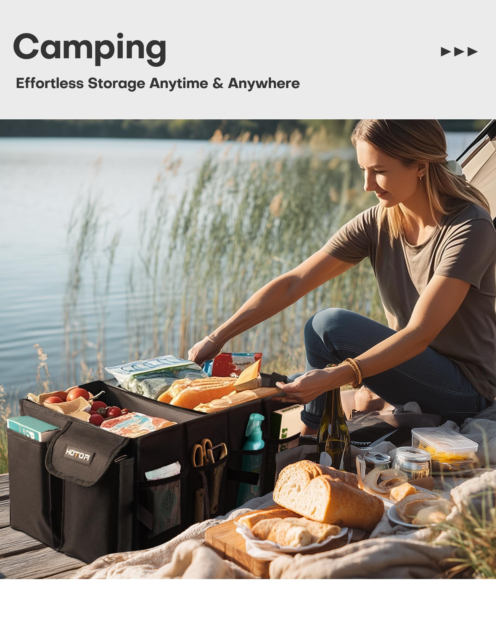 PORTABLE & SPACE-SAVING: When not in use, simply fold the SUV trunk organizer flat with the Velcro strips. The collapsible design is perfect for freeing up trunk space or storing the organizer neatly at home. An essential item for tidy travels.