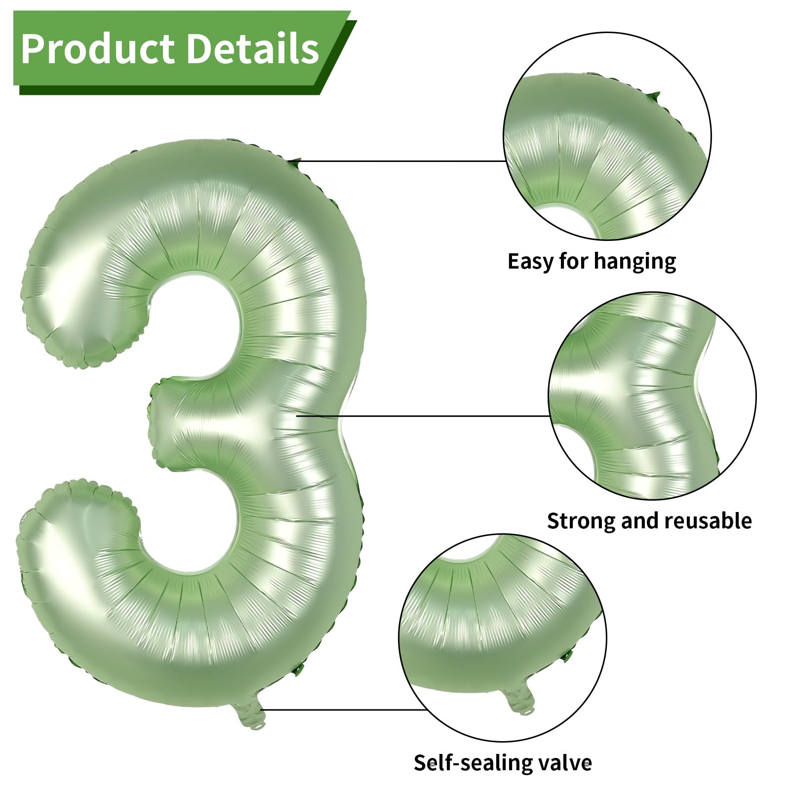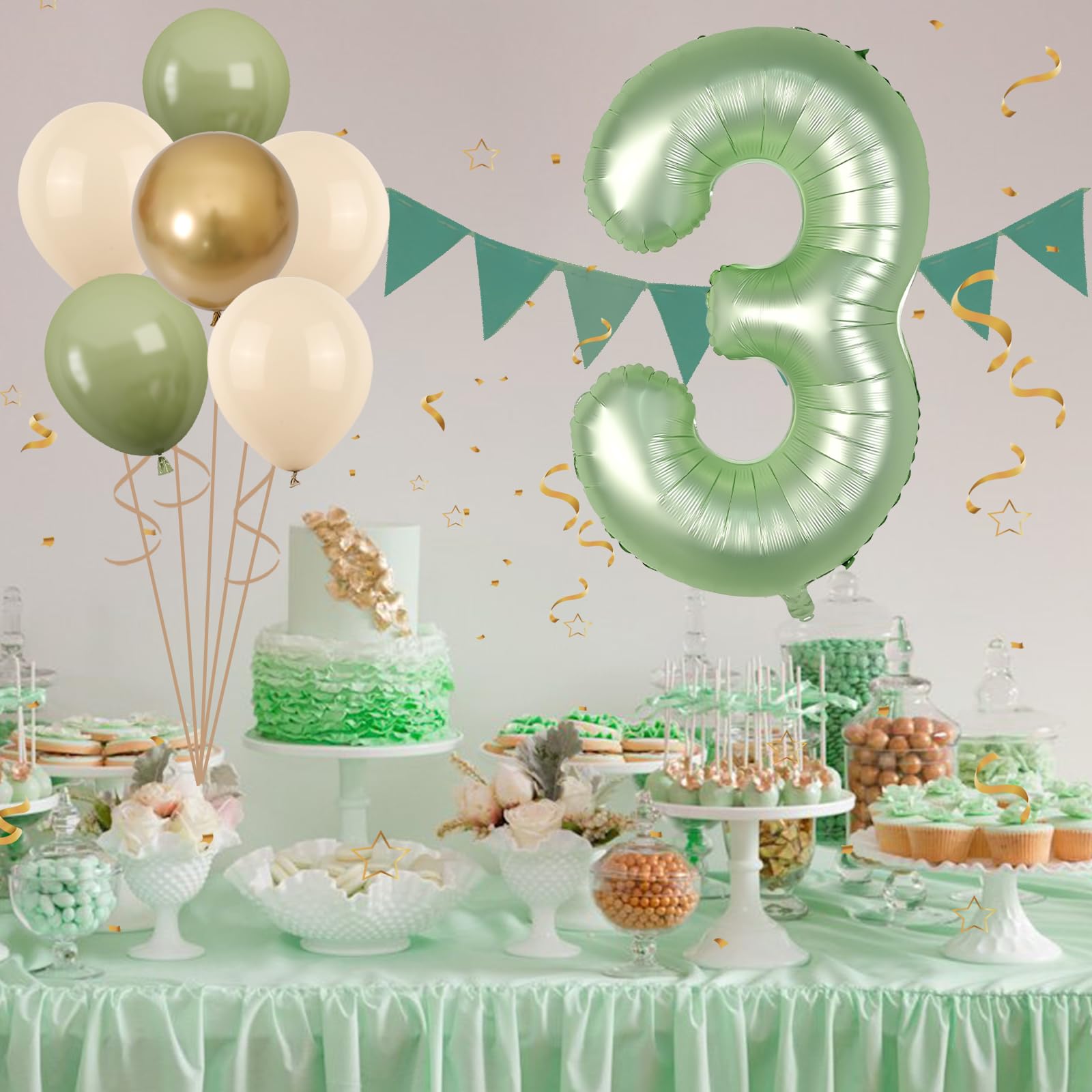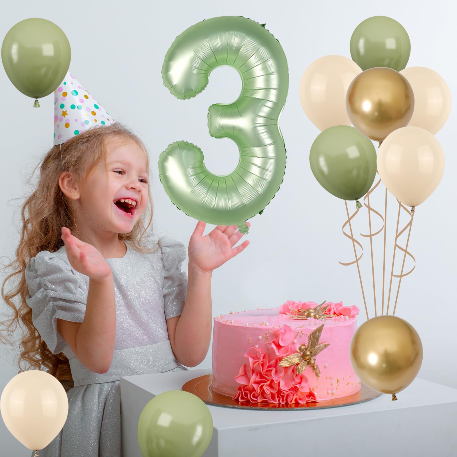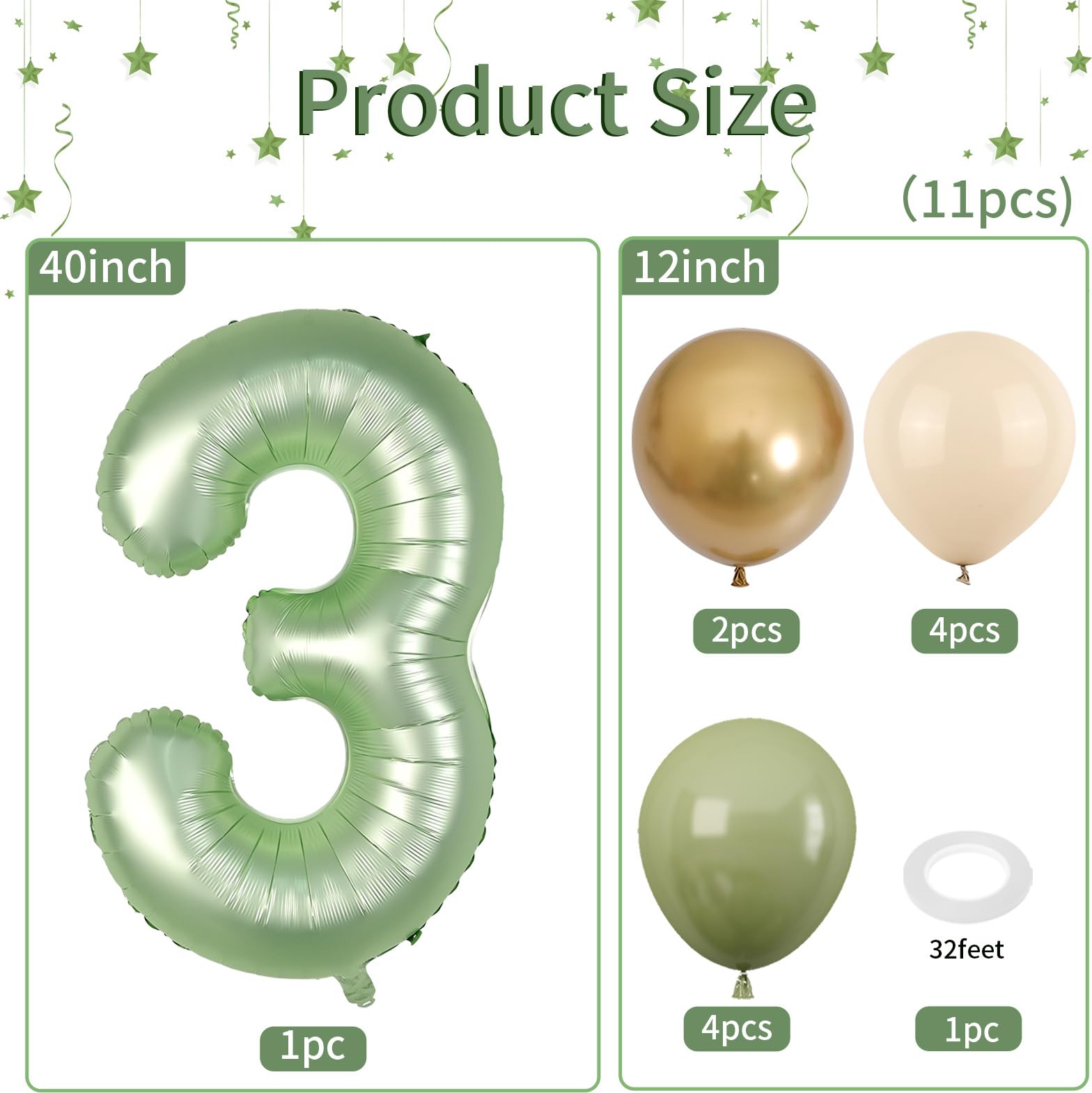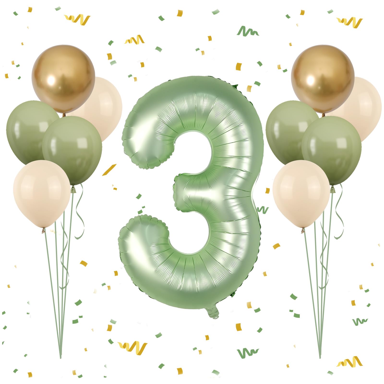 Product Contents: This 3rd birthday balloons set includes a 40 inch sage green number balloon, 4 pcs 12 inch sand white balloons, 4 pcs 12 inch sage green balloons, 2 pcs 12 inch metallic gold balloons, and 1 pc 32 feet of white ribbon