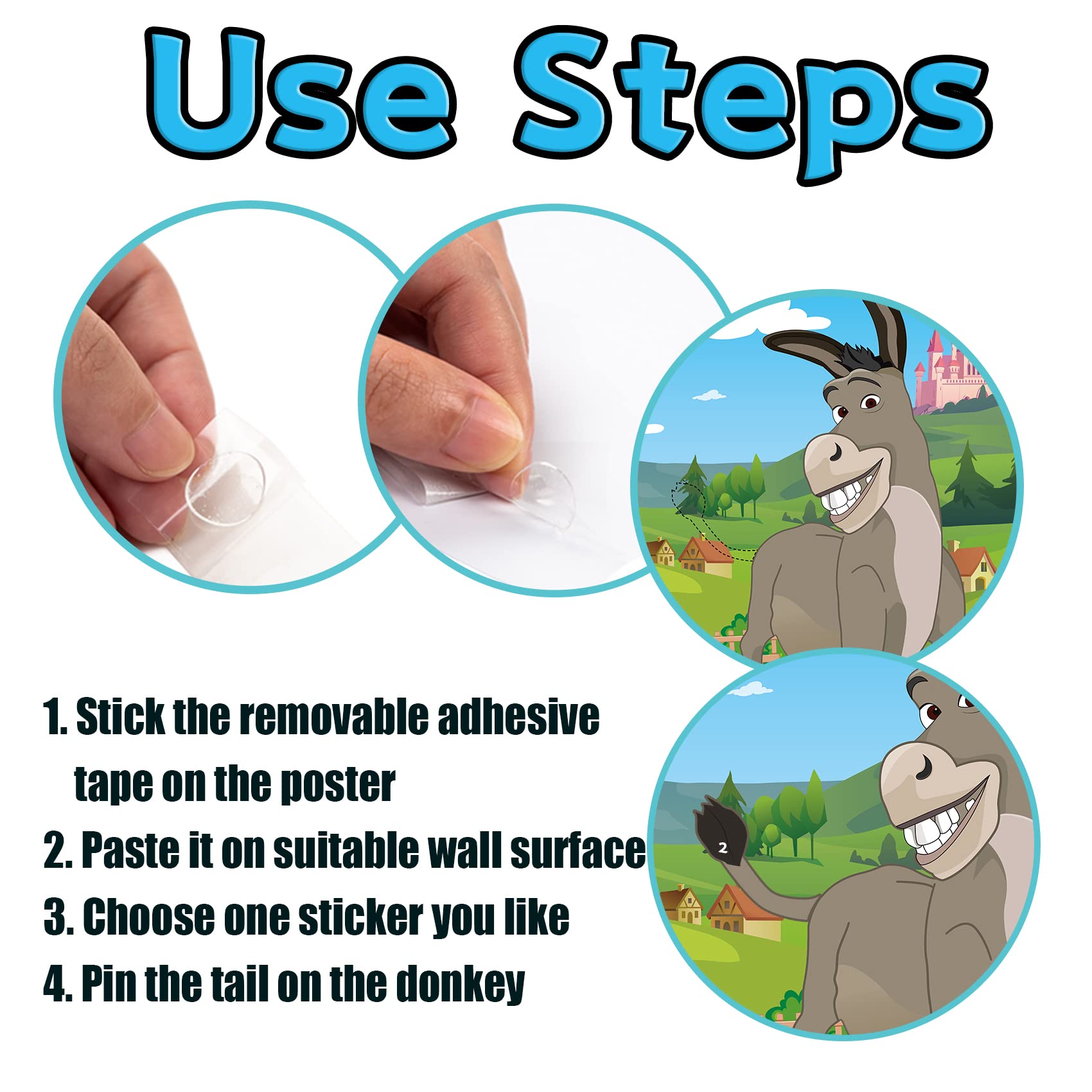 PACKAGE INCLUDES: The pin the tail on the donkey set contains 1 donkey poster, 24 pcs tail stickers, 1 light blue blindfold and dot glues, Great games for any themed parties such as birthday parties, festive parties and school activities