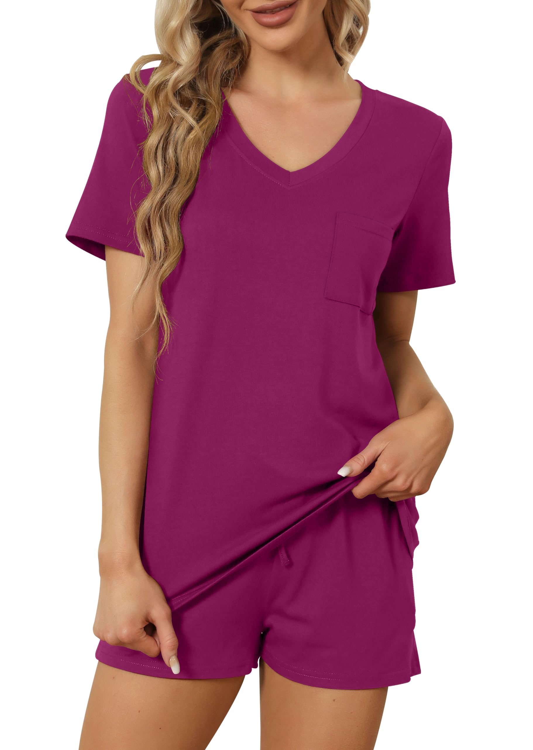 FEATURE --- The package including 1 x short sleeve t-shirt and 1 x short. The top has classic v neckline and a pocket. The short has elastic drawstring and side pockets. The cute top is perfectly complemented by shorts. Casual and sexy in daily life.