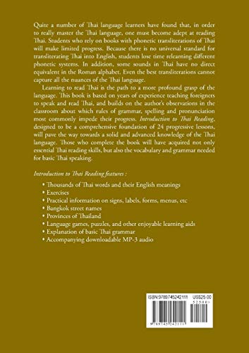 • Innovative new learning tool for the student of the Thai language • Complementary to the study of spoken Thai • Downloadable MP3 audio files to support the lessons In order to master the Thai language, one must become adept at reading Thai. Students who rely on books with phonetic transliterations of Thai will make limited progress. In addition, some sounds in Thai have no direct equivalent in the Roman alphabet, so even the best transliterations cannot capture all the nuances of the language. Learning to read Thai is the path to a more profound grasp of the language. This book is based on years of experience teaching foreigners to speak and read Thai, and builds on the author's observations in the classroom about which rules of grammar, spelling and pronunciation most commonly impede their progress. Introduction to Thai Reading, designed to be a comprehensive foundation of 24 progressive lessons, will pave the way towards a solid and advanced knowledge of the Thai language. Those who complete the book will have acquired not only essential Thai reading skills, but also the vocabulary and grammar needed for basic Thai speaking. Includes downloadable MP3 audio files to accompany the text. Contents: PART 1 - LESSON 1: Introduction; LESSON 2: Consonants; LESSON 3: Vowels; LESSON 4: Initial Consonants; LESSON 5: Final Consonants; LESSON 6: Tones; LESSON 7: The Key Four Words; LESSON 8: How to Read Groups of Words; LESSON 9: Irregular Phonetics; LESSON 10: Two Initial Consonants; LESSON 11: Pronunciation Irregularities; LESSON 12: Rules; LESSON 13: Miscellaneous Signs; LESSON 14: Silent Vowels & Consonants; LESSON 15: About; LESSON 16: Unusual Spellings; LESSON 17: Twenty Thai Words; LESSON 18: Words of Similar Pronunciation; LESSON 19: Main Vocabulary Lists; LESSON 20: Additional Useful Vocabulary; LESSON 21: Menus, Forms, Labels, Signs; LESSON 22: Calendar and Geography; LESSON 23: Questions, Games, Crosswords; PART 2 - LESSON 24: How to Form Phrases and Sentences; PART 3 - Keys to Exercises.