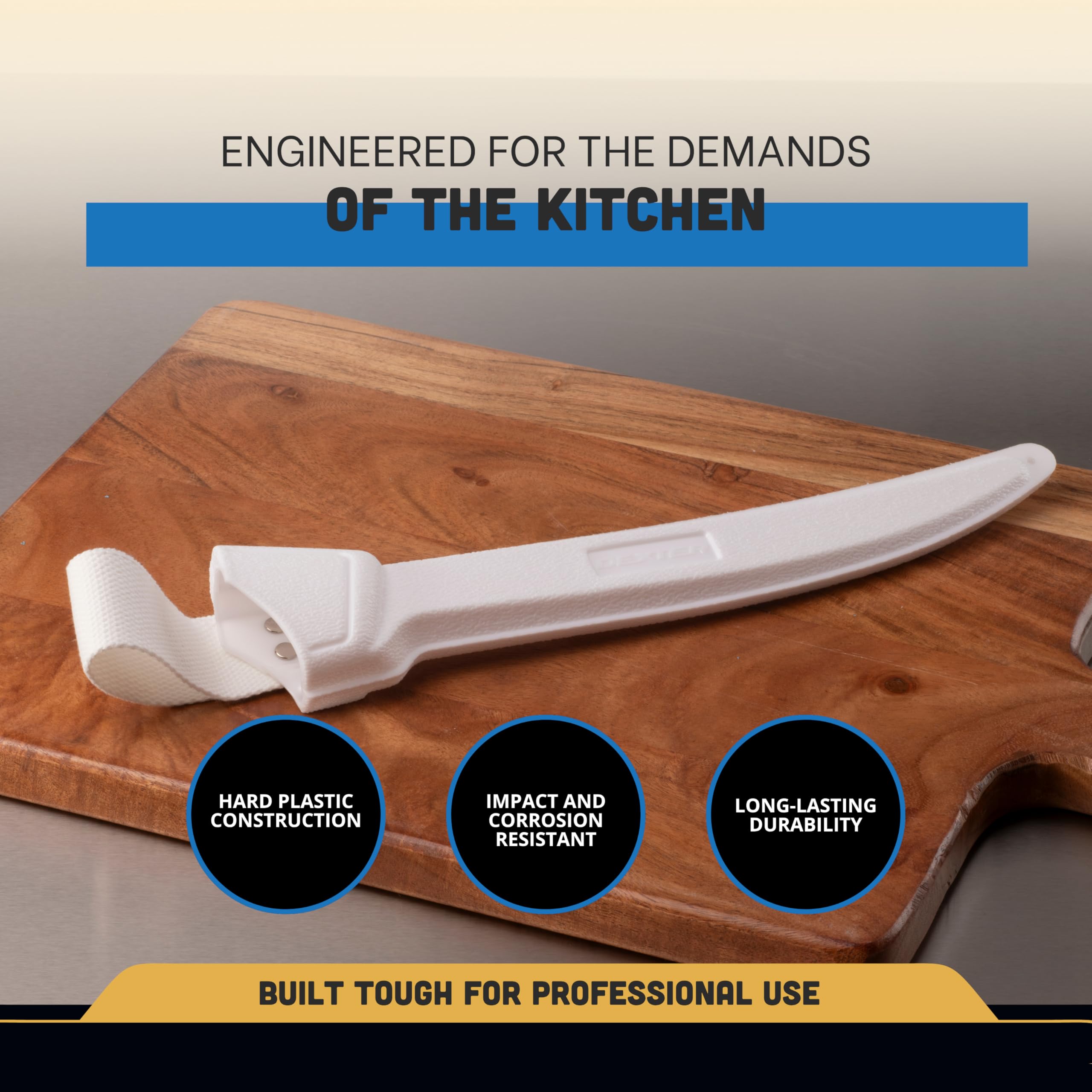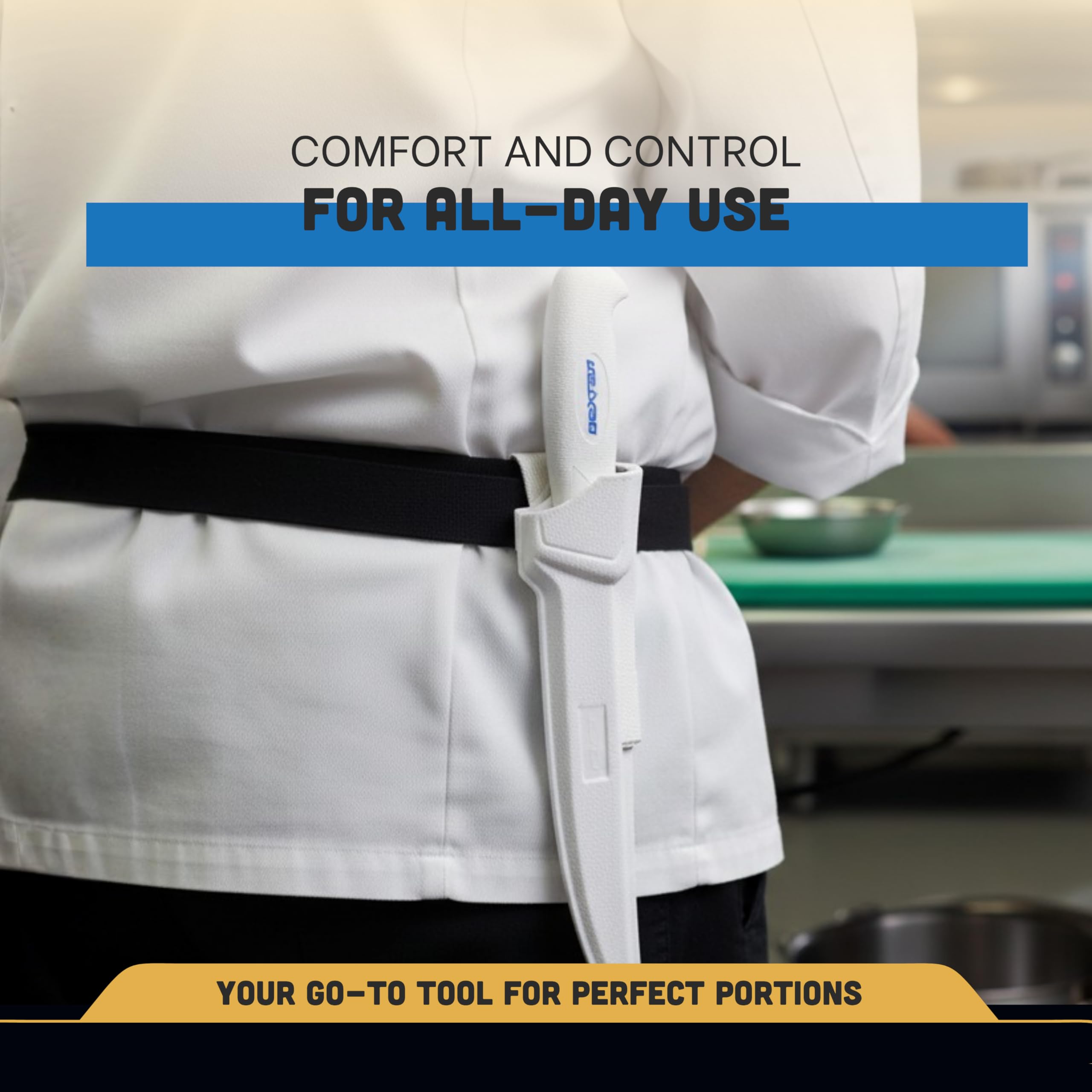 The Dexter-Russell WS-1 Knife Scabbard is a reliable and professional-grade knife holster designed to protect and carry straight-blade fillet knives ranging from 6" to 9" in length. Crafted from durable molded white polypropylene, this blade protector provides long-lasting performance in commercial kitchens, foodservice operations, and fish prep environments. Whether you’re a professional chef, butcher, or fisherman, this kitchen sheath offers secure storage and safe portability for your favorite Dexter-Russell fillet knife. Engineered for convenience and safety, the Dexter-Russell WS-1 knife storage case features a riveted strap with an integrated belt loop, allowing for easy access while working in fast-paced culinary or seafood prep settings. The belt-mounted sheath design keeps your knife close at hand, reducing downtime between tasks and improving workflow efficiency.