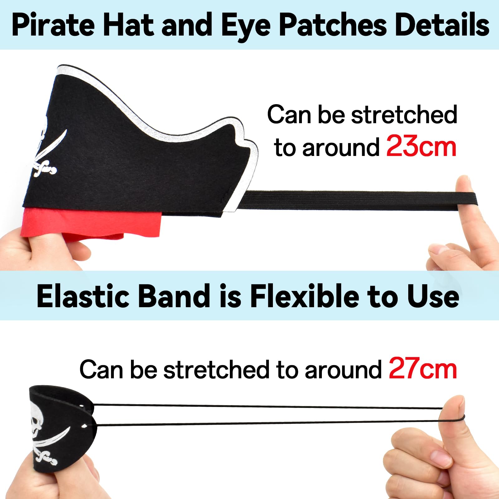 【Ajustable Size】The pirate size is 10.4 x 4.5in, the pirate eye patch is 3.15 x 2.16in and the length of sword is 21.2in. Both pirate hat and eye patch are with elastic bands, which are comfortable for wearing, black pirate hat can be stretched to about 23cm, eye patch can be stretched to about 27cm