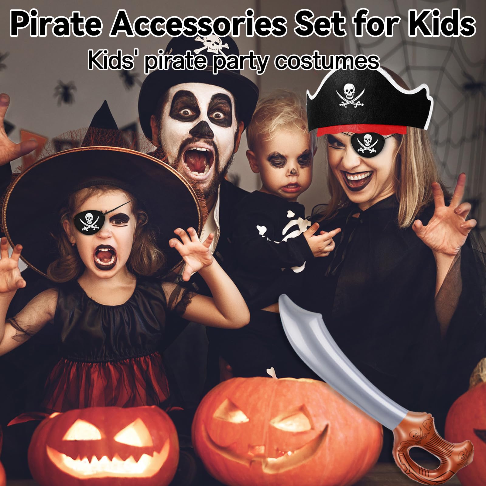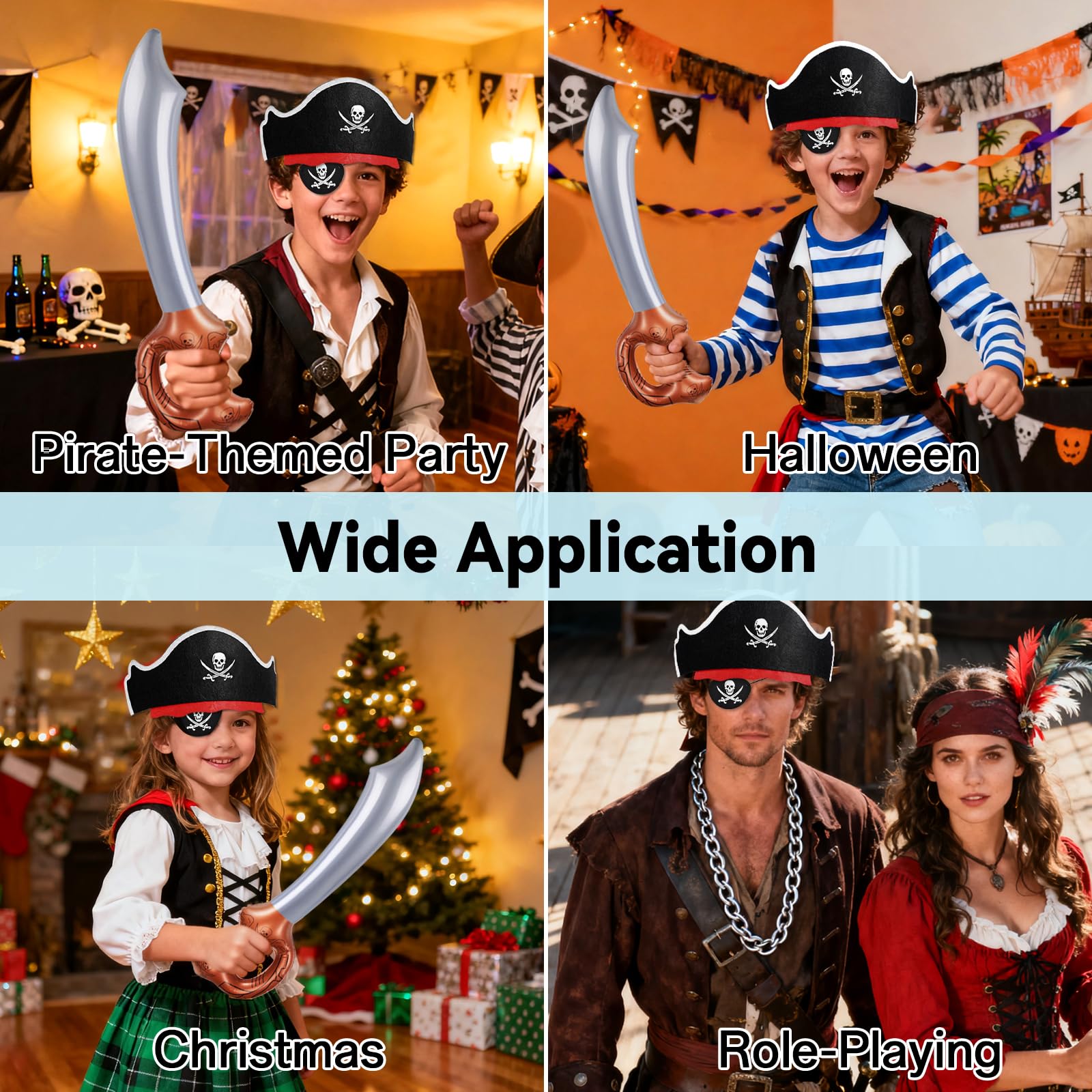 【Premium Material】High quality felt black pirate hat with lifelike skull print; pirate eye patches with vivid skull print; inflatable pirate swords are safe to use, so people can use them to cosplay safely