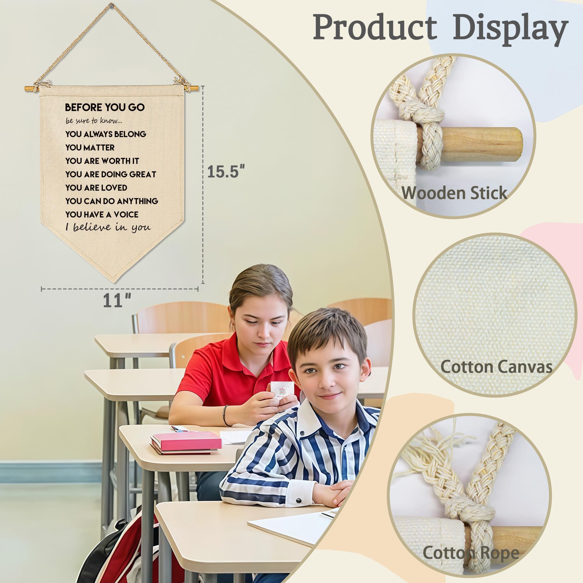 Inspire confidence in your learning space with this Before You Go Pennant. Made from premium beige canvas and a sturdy wooden dowel, this 15.5" x 11" banner is built to support students on any classroom wall. It features a durable cotton rope for easy hanging to transform any exit or corner into a zone of encouragement. An ideal gift for preschool, kindergarten, and homeschool teachers to promote mental wellness. This reusable, fade-resistant decor fits beautifully in library nooks or on bedroom doors. A professional-grade gift for every educator.