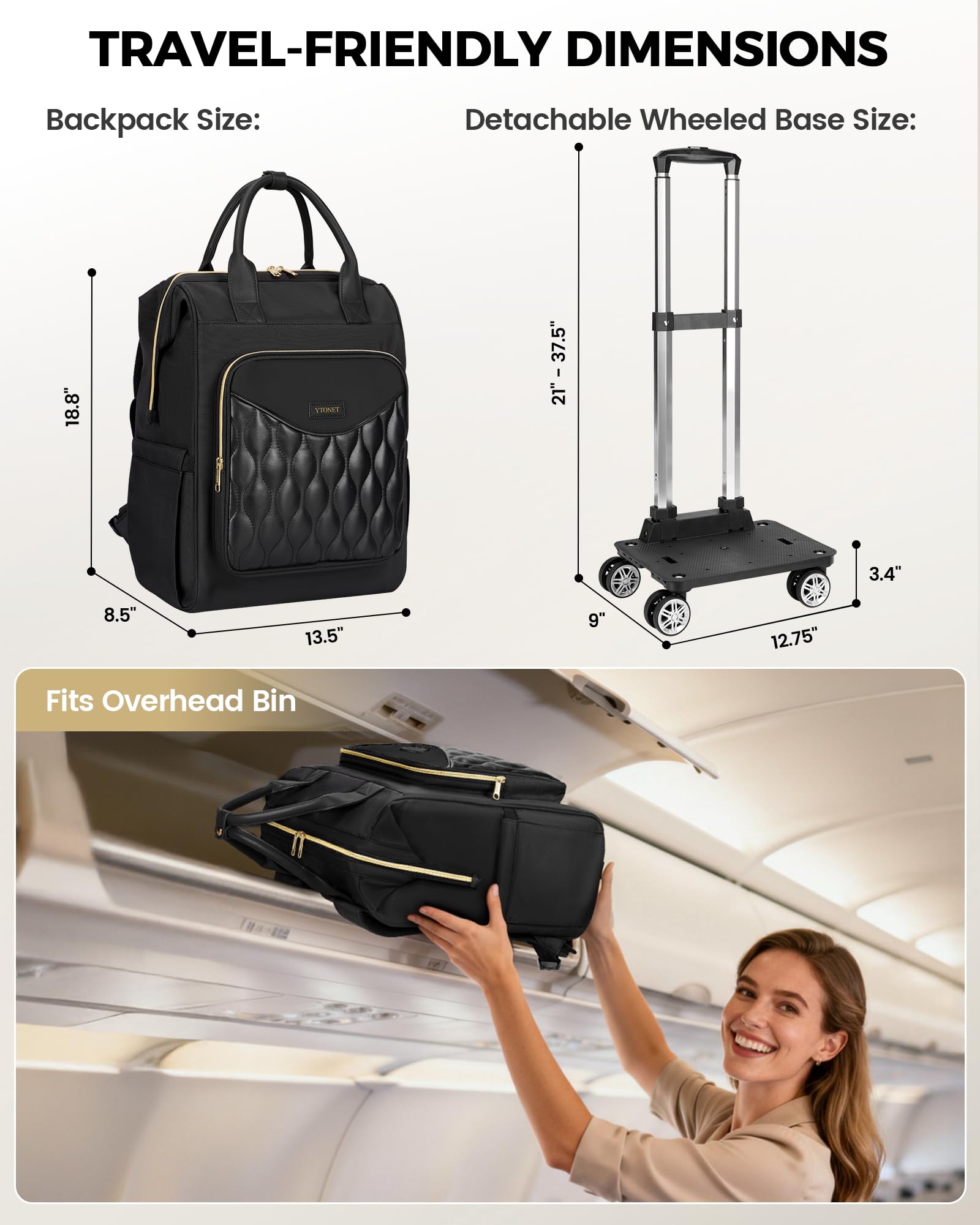 Airline-Approved Size: The backpack itself measures 18.8" x 13.5" x 8.5", When assembled with the trolley, it measures 13.5" x 9" x 21", fits easily in most overhead bins, and meets most airlines' carry on luggage size limits. This versatile design makes it an ideal weekend travel bags with wheels, a functional rolling computer bag, a reliable rolling briefcase for women, or a convenient rolling teacher bag