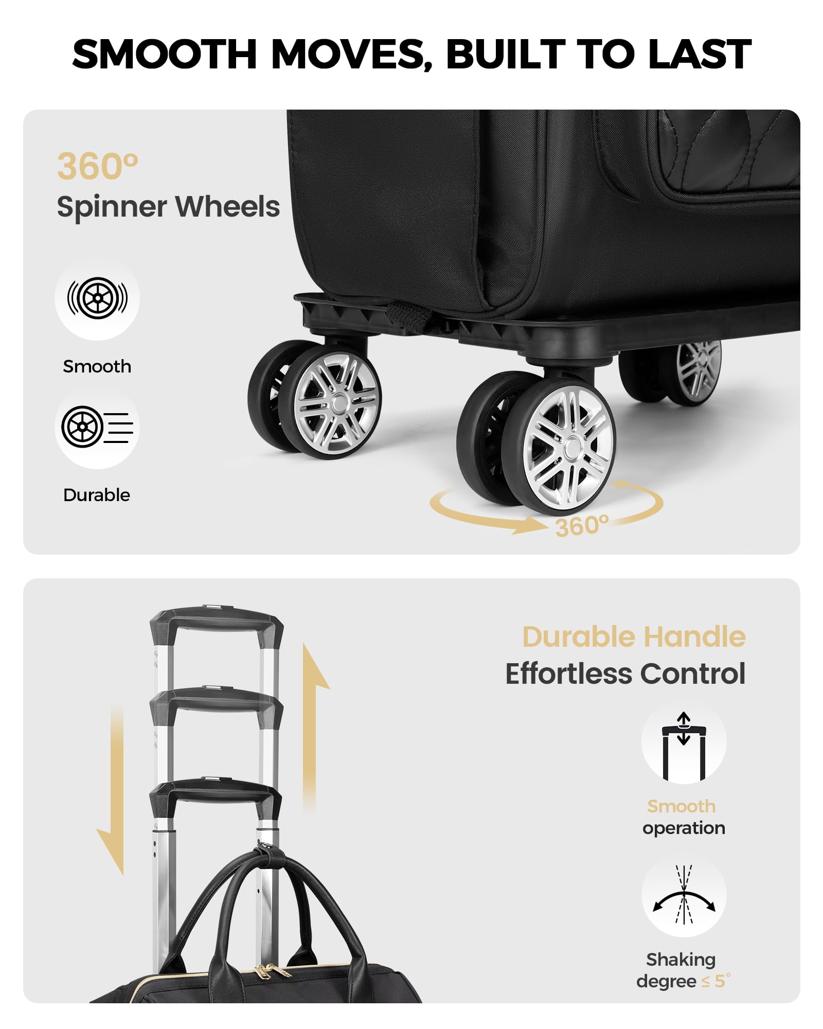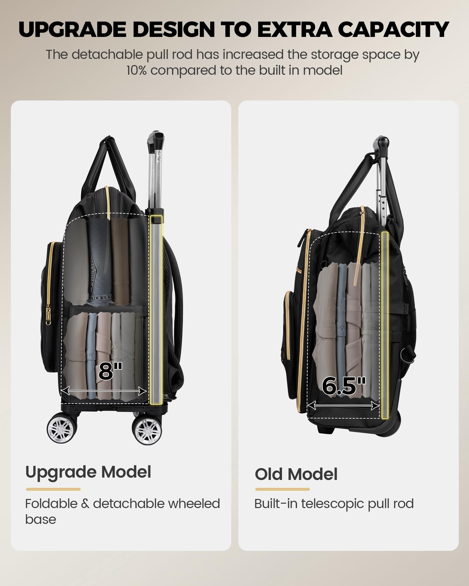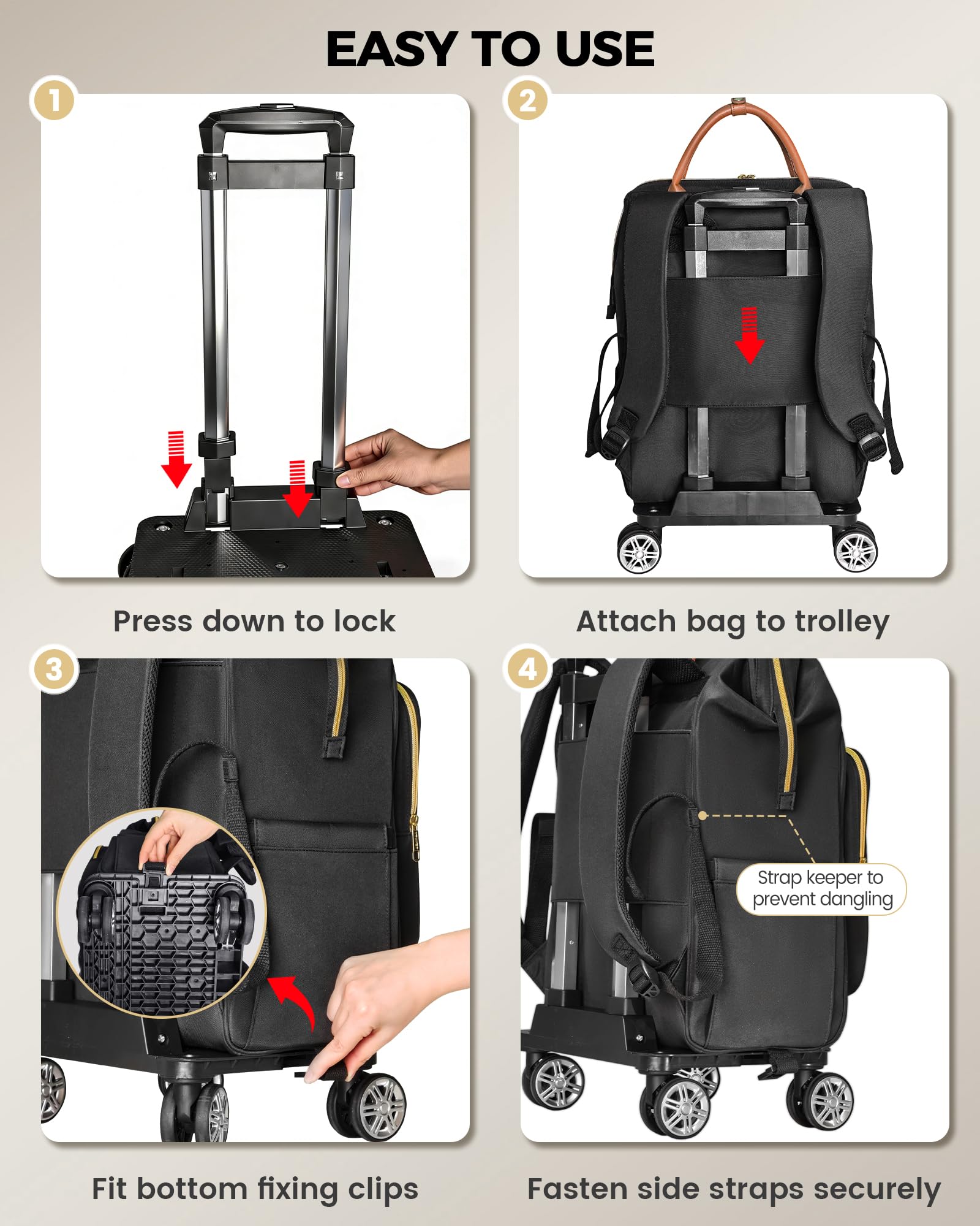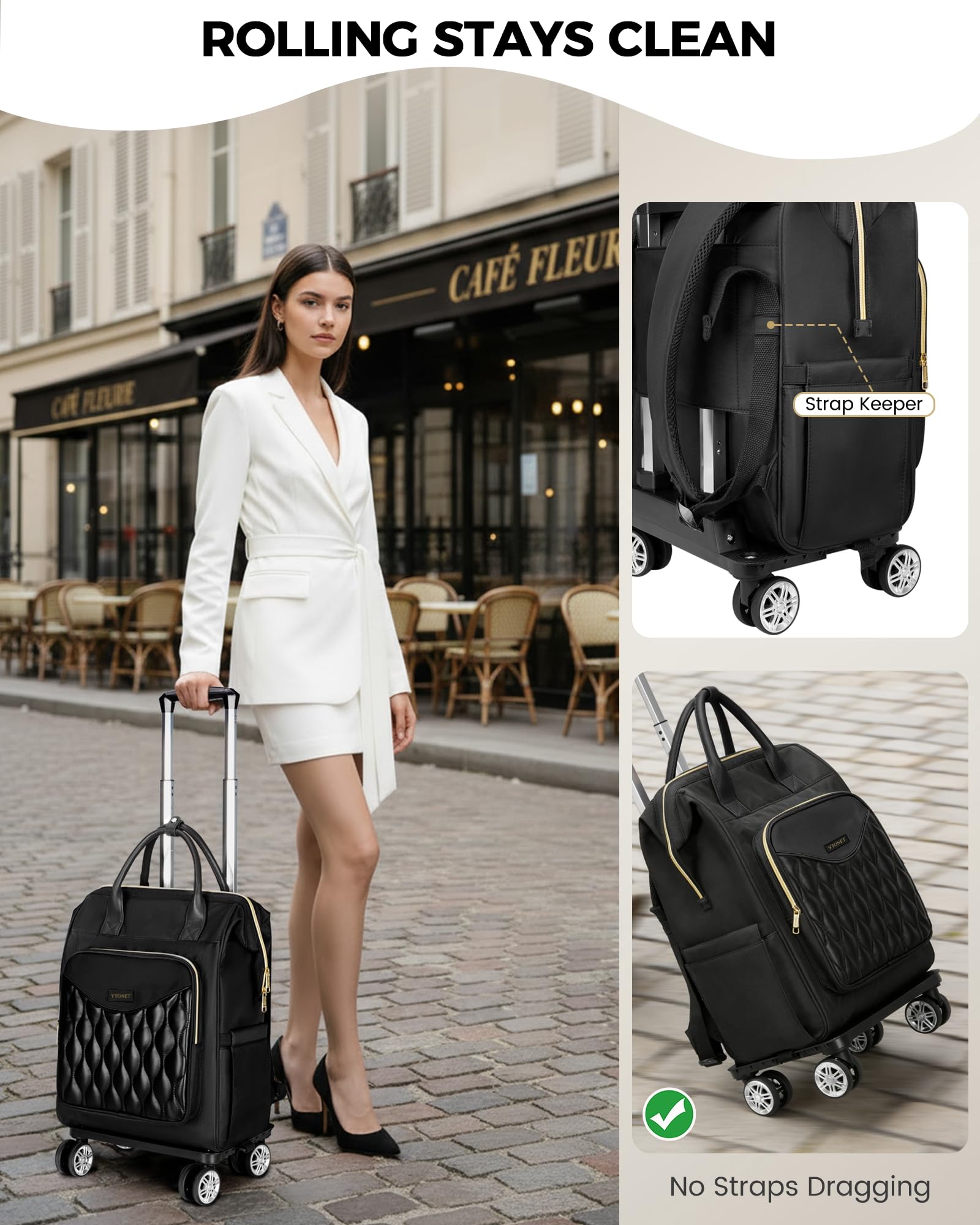 Versatile 2-in-1 Design: Easily switches between rolling backpack and backpack modes. In rolling mode, secure it to the cart with snap buckles and luggage strap to prevent it from tipping over. In backpack mode, soft shoulder straps provide all-day comfort and keep clothes clean. Featuring a classic solid black design, this backpack on wheels for women ideal for travel, work