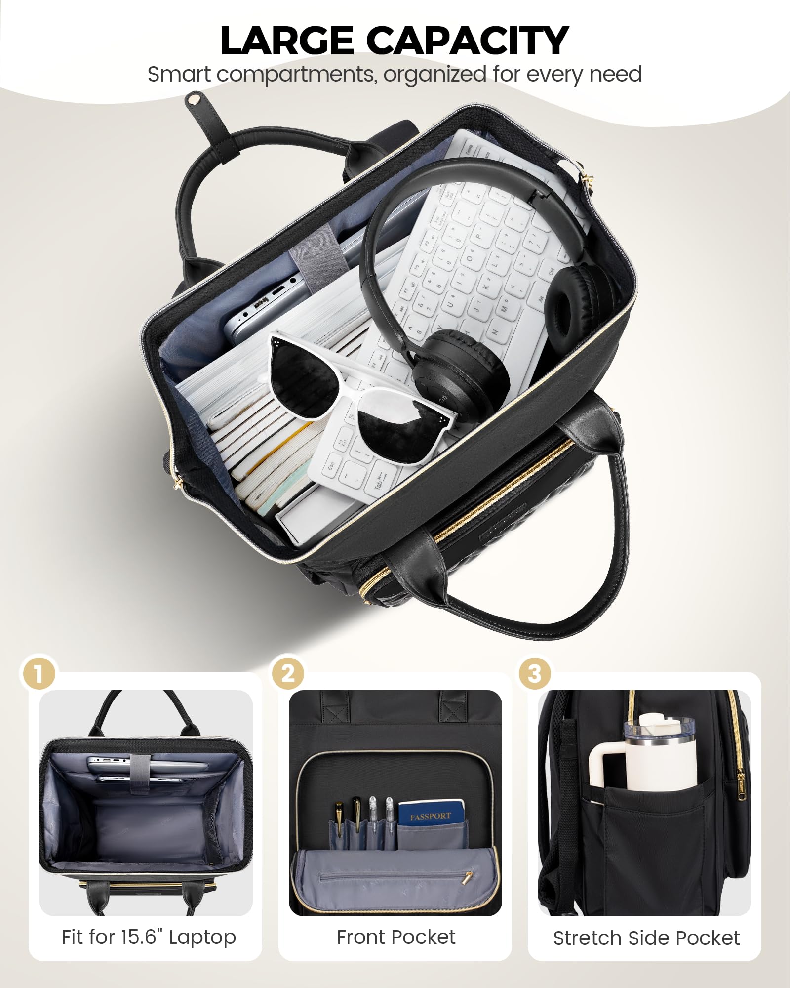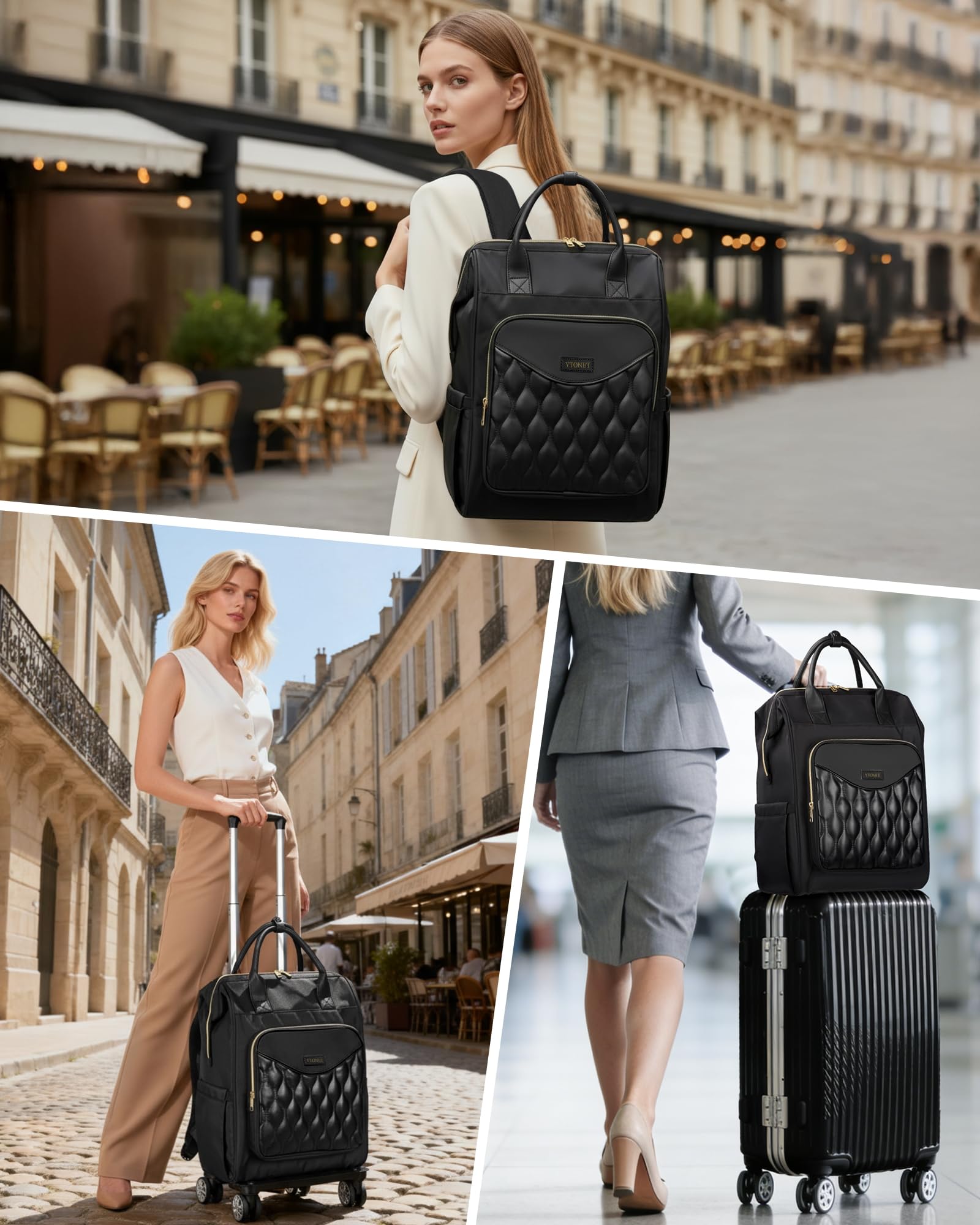 Practical Compartments: This rolling computer backpack for women holds everything for a 2–3 day trip. The wheeled backpack main compartment has a padded laptop sleeve (fits 15.6" laptops) and a separate pocket for an 8.3" iPad. The laptop backpack with wheels women features an elegant quilted front pocket that includes pen holders, a drop-in pocket, and a small zippered pocket to keep essentials organized and within easy reach—perfect for commuting, business, and personal travel